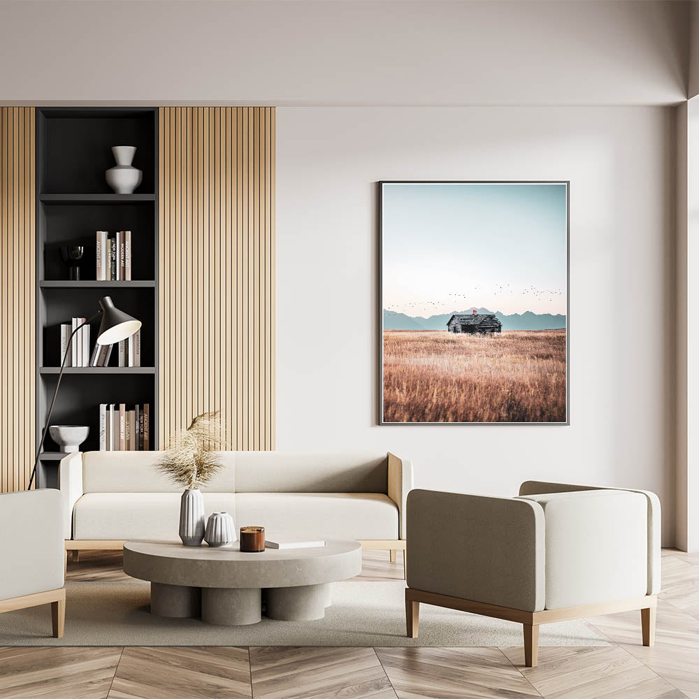 Discover the serene beauty of our "Vintage Rustic Landscape" art print, perfect for bringing a touch of timeless elegance to your rustic or farmhouse-style decor. This exquisite piece captures the essence of tranquility with its depiction of a dilapidated farmhouse set against a sprawling, golden field.