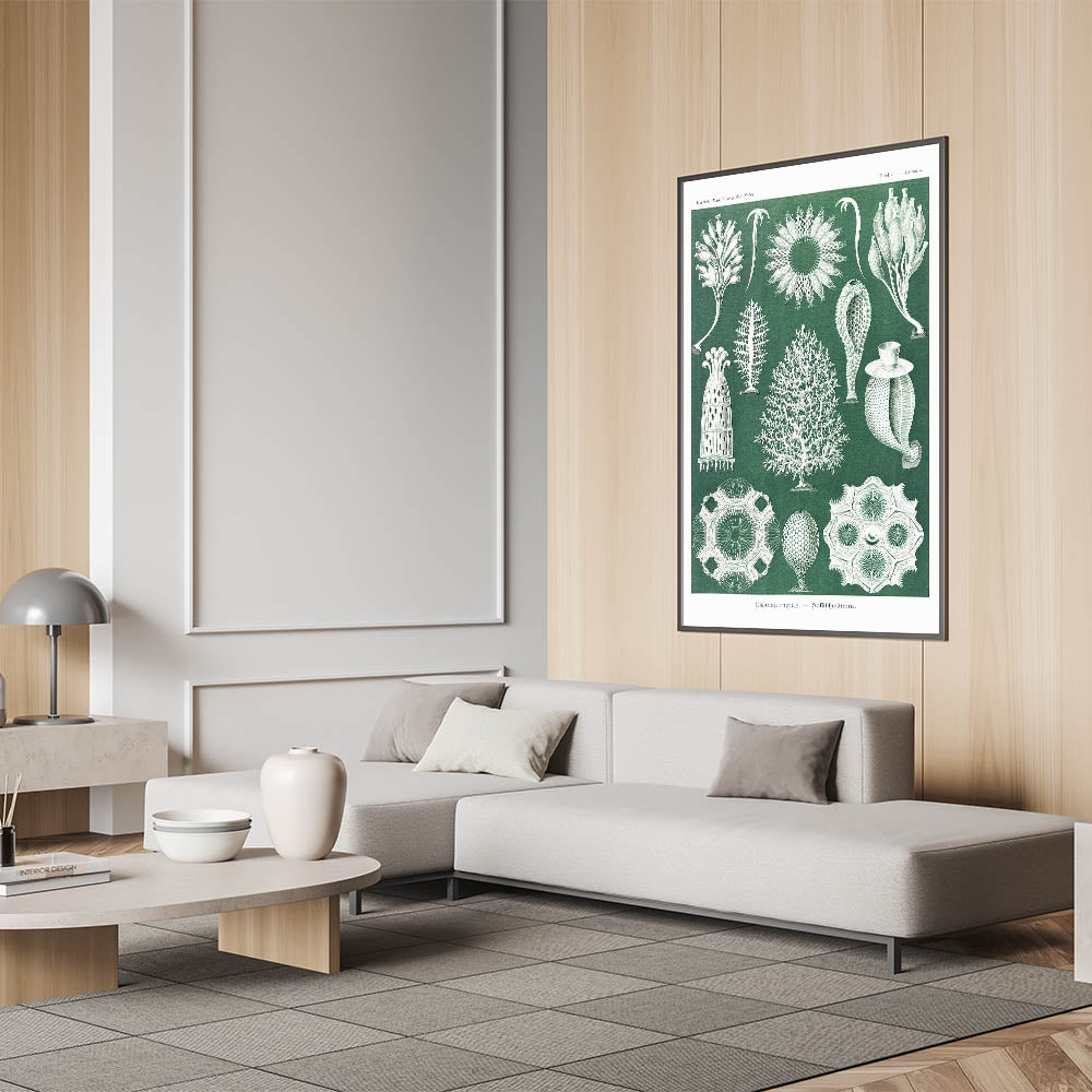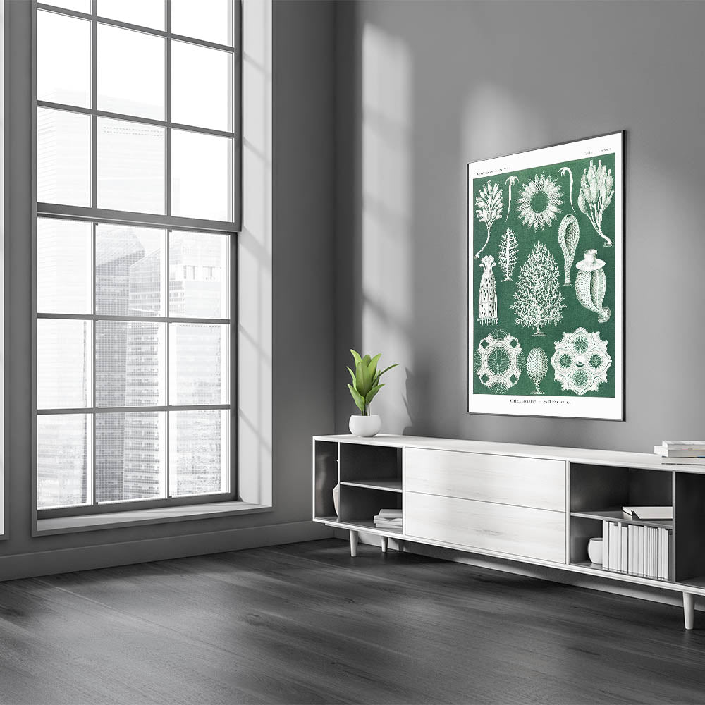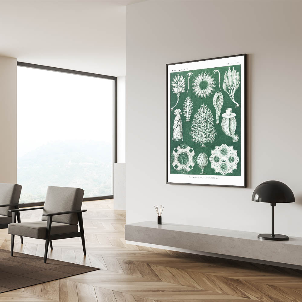 Add a touch of scientific elegance to your decor with this Modern Wall Art piece featuring vintage marine life illustrations. Inspired by Contemporary Art and natural history, this intricate design showcases calcisponges and sea life forms in fine detail, set against a rich green background. Ideal for those who appreciate Trendy Home Decor with a unique twist, this artwork is perfect for creating an intriguing and stylish focal point.