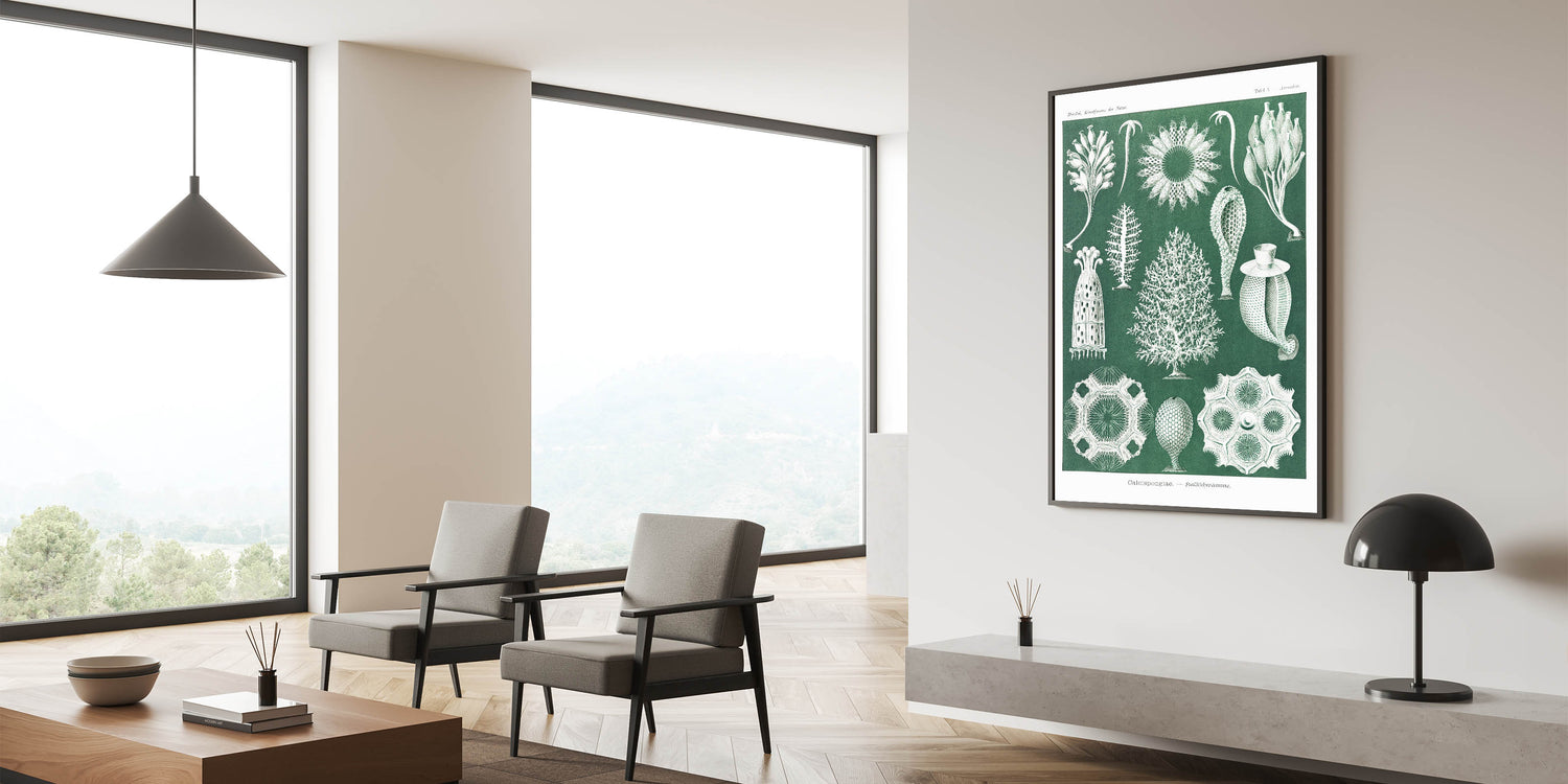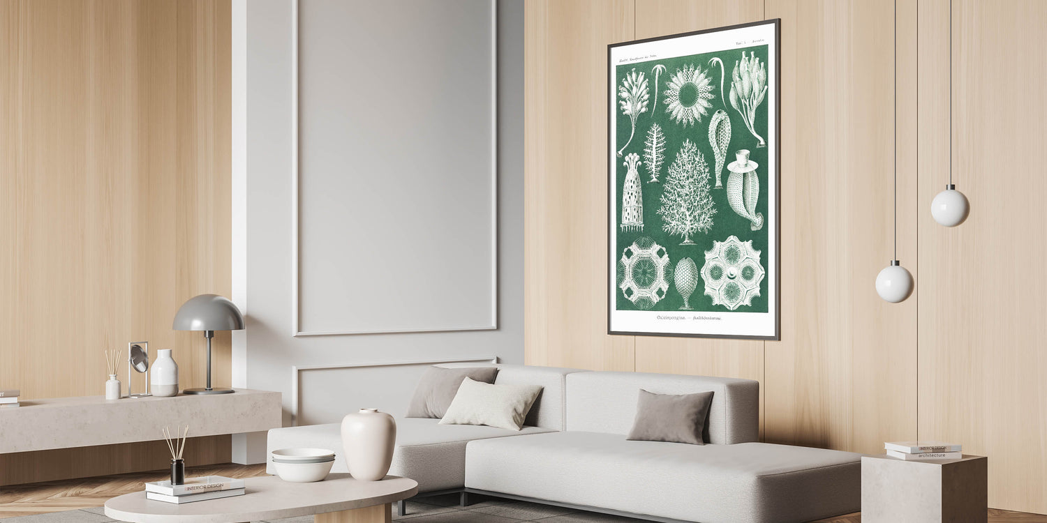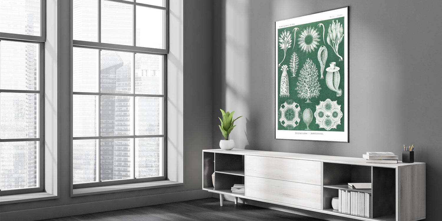 Add a touch of scientific elegance to your decor with this Modern Wall Art piece featuring vintage marine life illustrations. Inspired by Contemporary Art and natural history, this intricate design showcases calcisponges and sea life forms in fine detail, set against a rich green background. Ideal for those who appreciate Trendy Home Decor with a unique twist, this artwork is perfect for creating an intriguing and stylish focal point.
