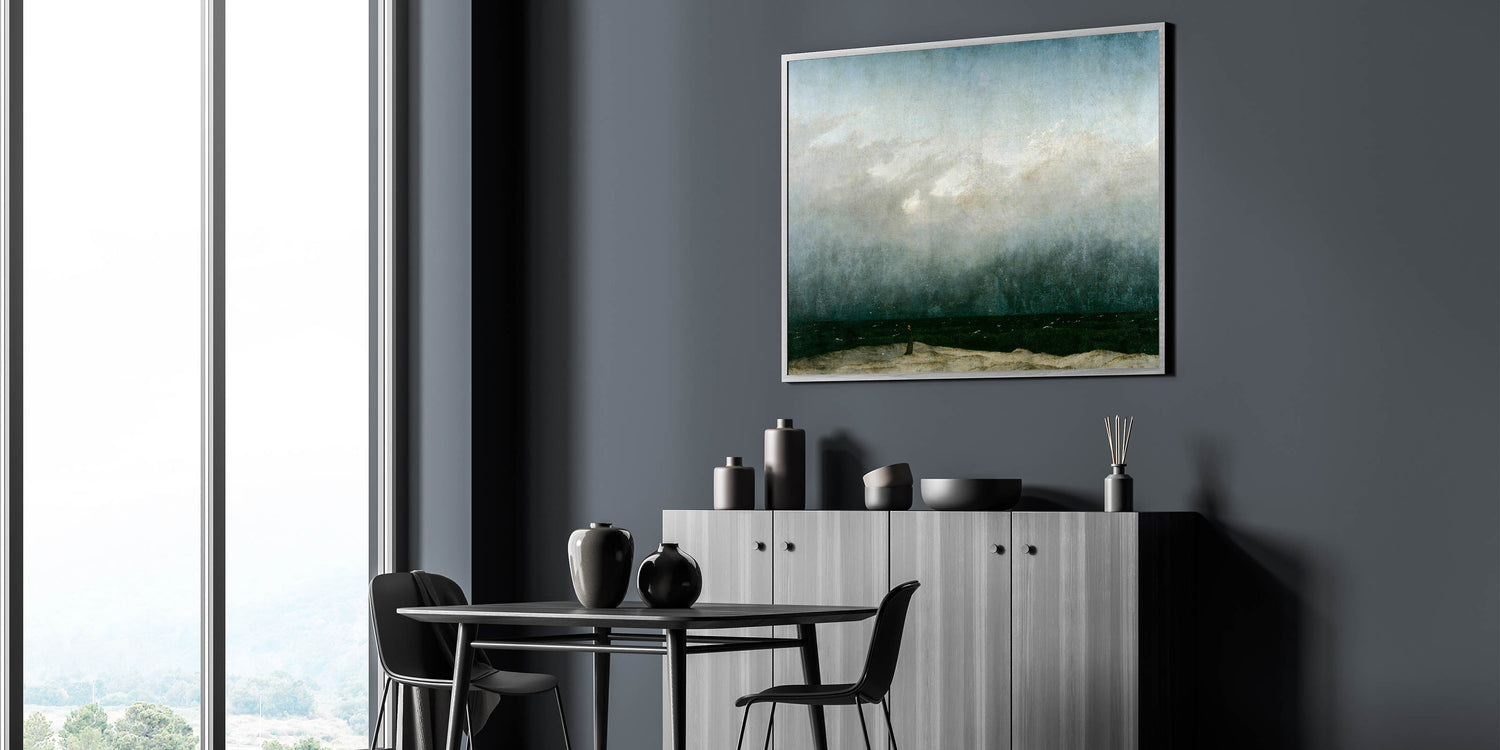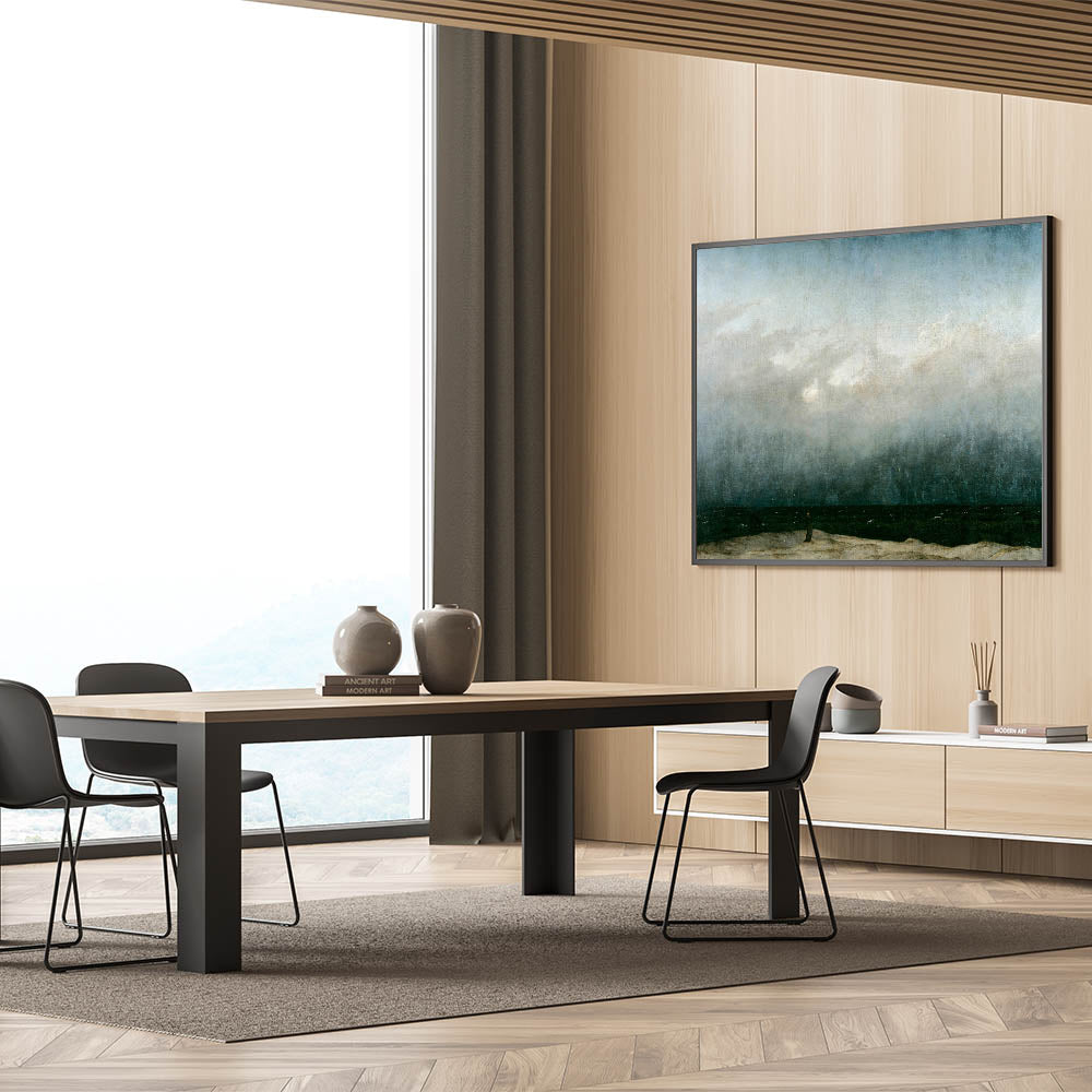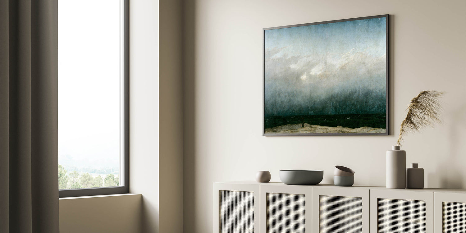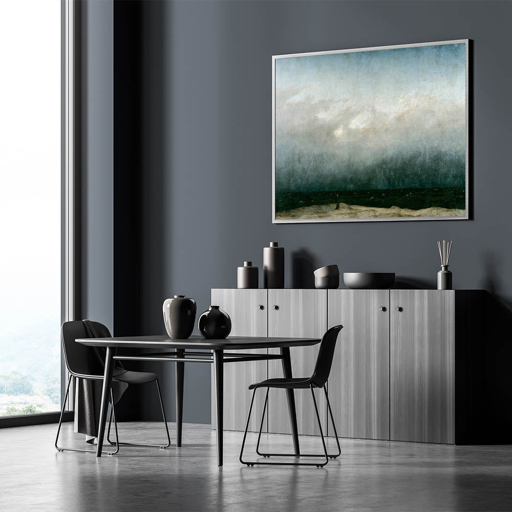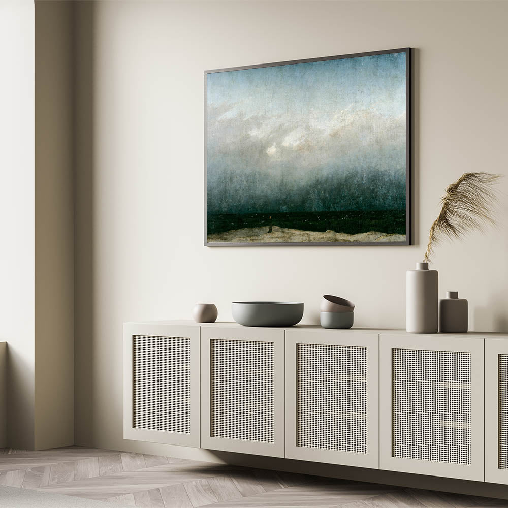 Capture the tranquil yet dramatic beauty of the seaside with this vintage seascape artwork. Featuring a solitary figure standing on a beach, gazing into the vast, darkened ocean under moody skies, this piece evokes a sense of reflection and serenity. The muted tones and dramatic contrast of the waves and sky create a timeless, nostalgic atmosphere, perfect for vintage-inspired home decor.