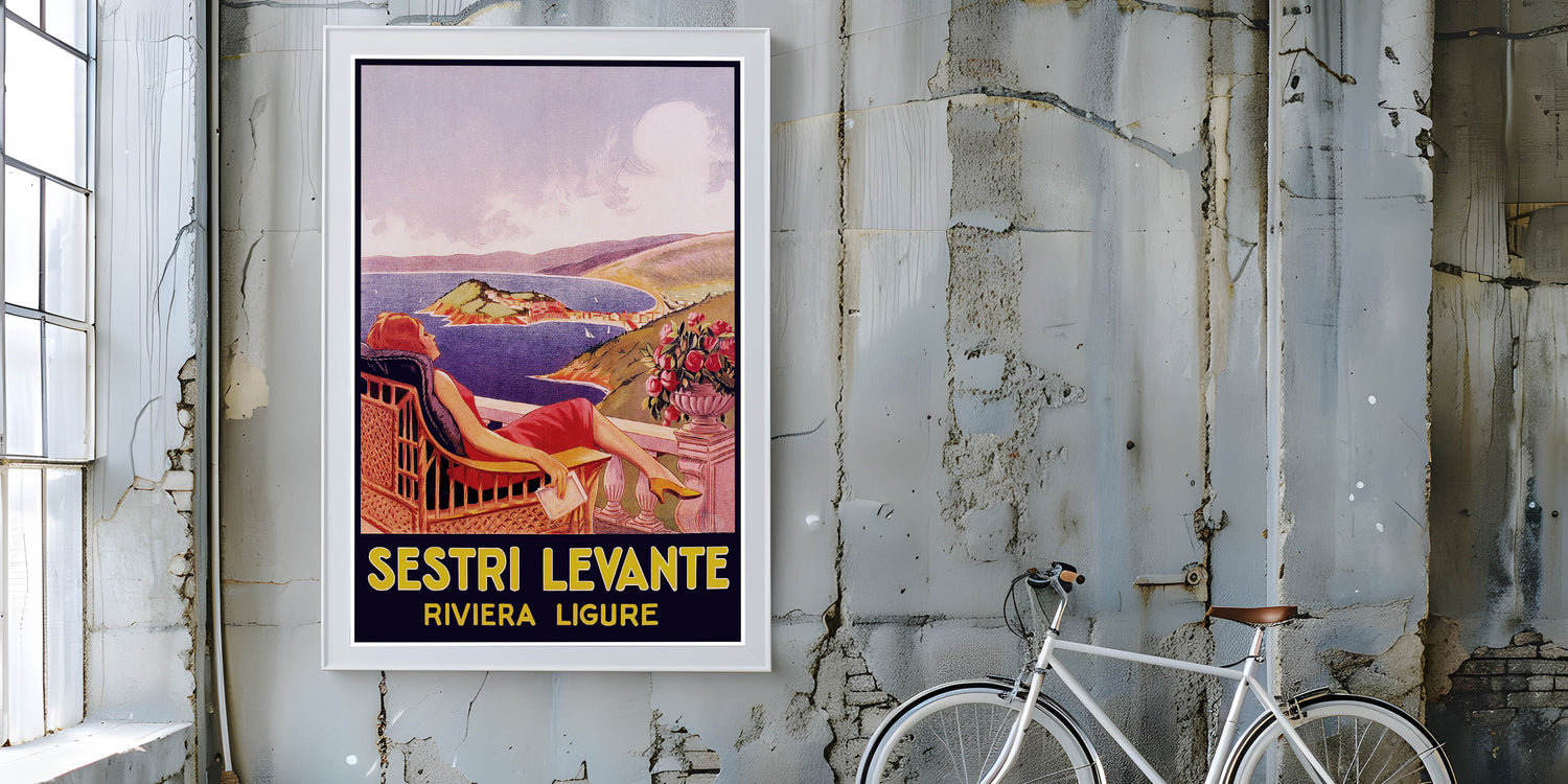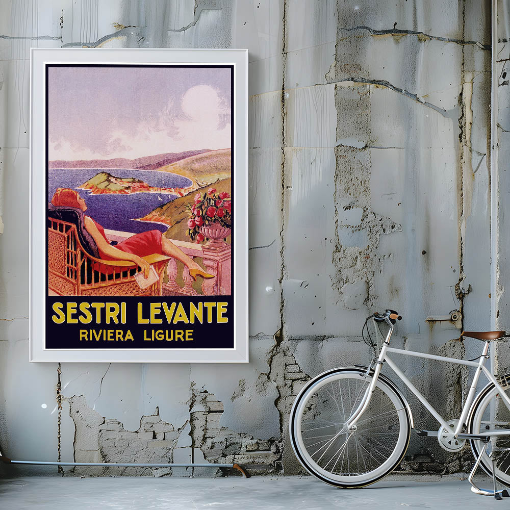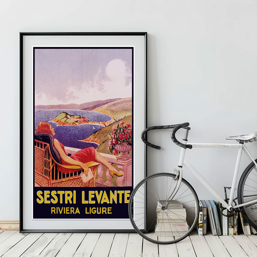 Transport yourself to the stunning Italian Riviera with this vintage Sestri Levante poster. Featuring a peaceful scene of a woman relaxing while overlooking the serene coastline, this art piece evokes the charm and tranquility of Sestri Levante, one of Italy's most picturesque seaside towns. Perfect for adding a touch of retro travel flair to any room.