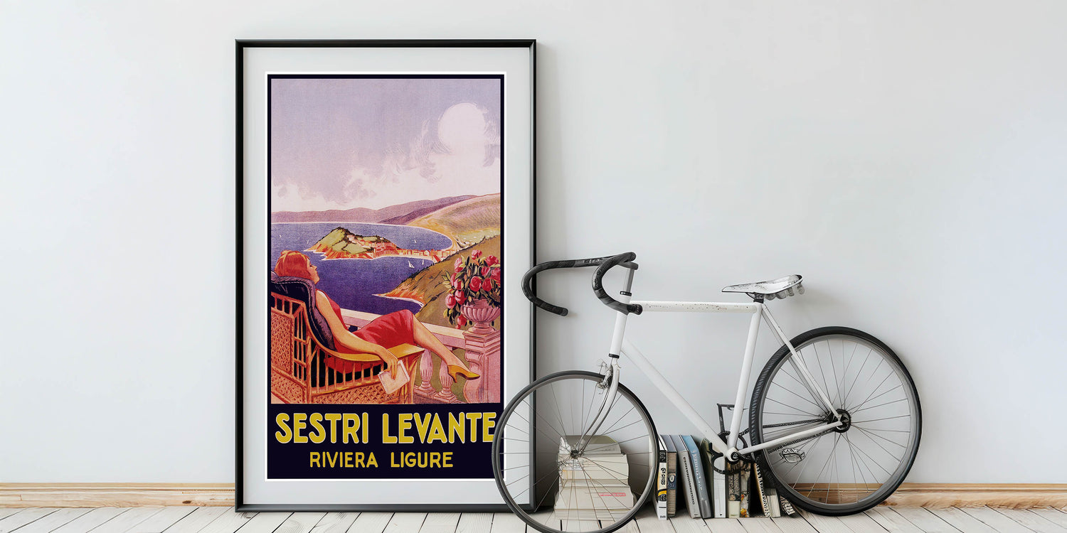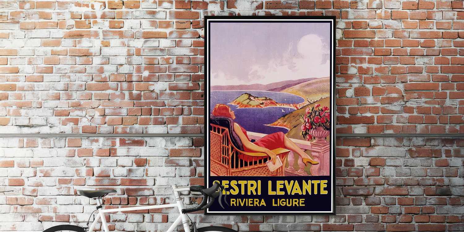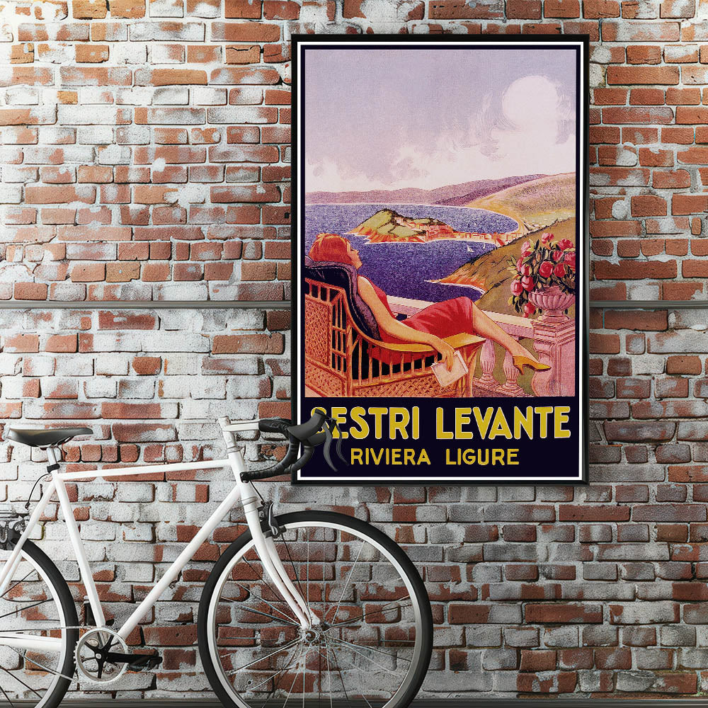 Transport yourself to the stunning Italian Riviera with this vintage Sestri Levante poster. Featuring a peaceful scene of a woman relaxing while overlooking the serene coastline, this art piece evokes the charm and tranquility of Sestri Levante, one of Italy's most picturesque seaside towns. Perfect for adding a touch of retro travel flair to any room.