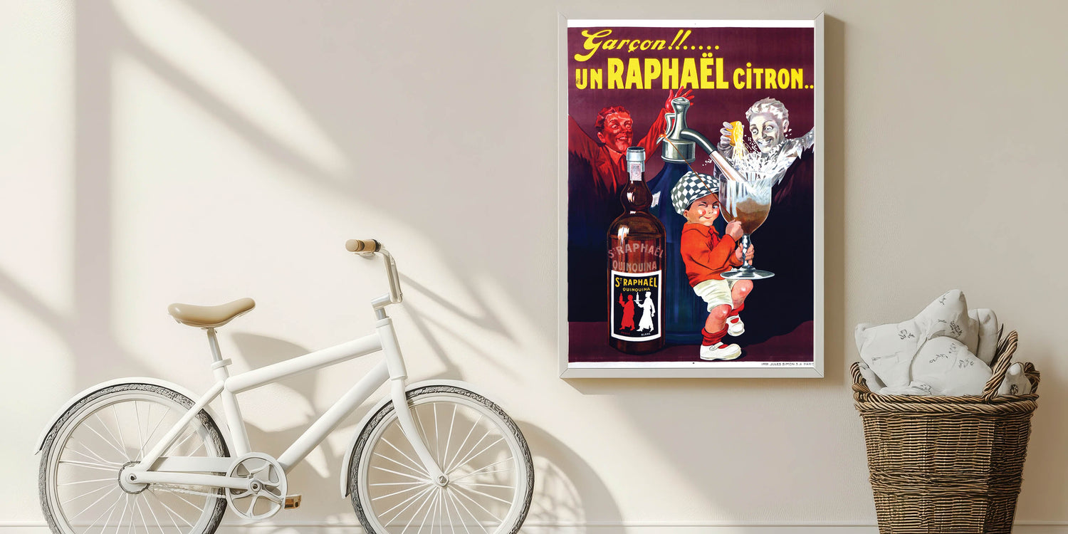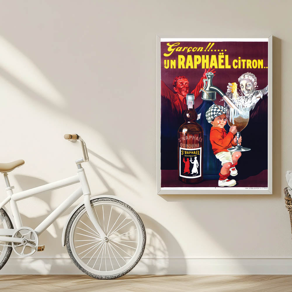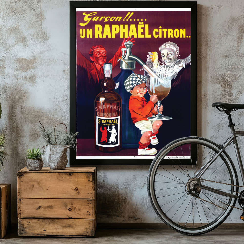 This Vintage St. Raphaël Quinquina Poster is a lively and colorful example of vintage-inspired wall art. Featuring a playful scene with a child preparing a refreshing St. Raphaël Quinquina drink, this design captures the fun and dynamic energy of early 20th-century advertising. The bold colors and enthusiastic figures make this a perfect addition to any collection of nostalgic advertising prints or retro home decor.