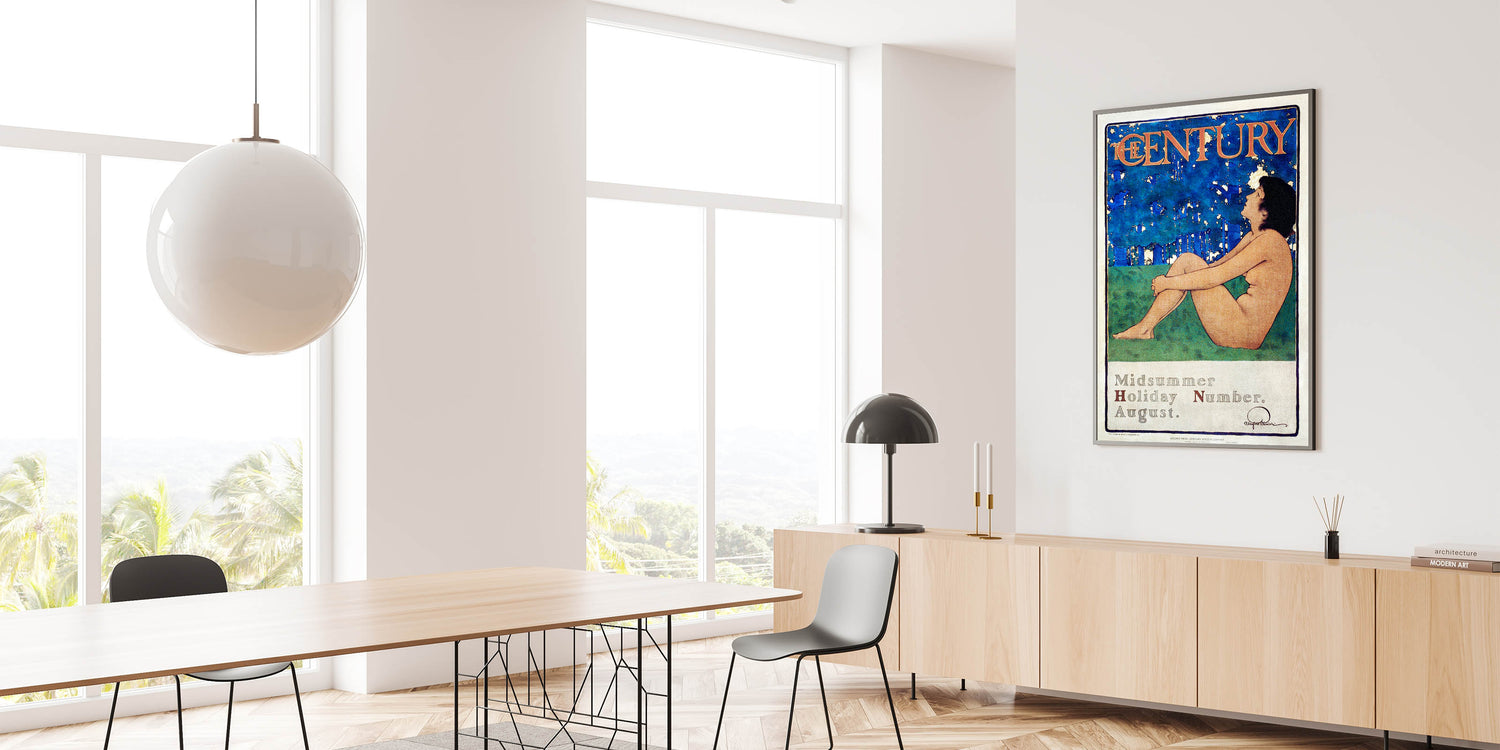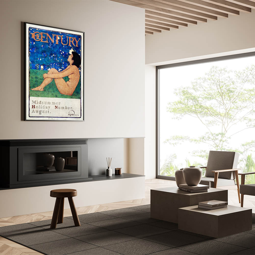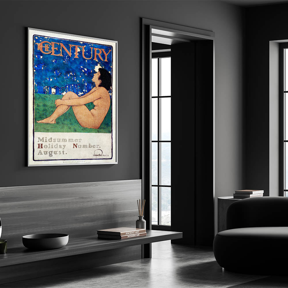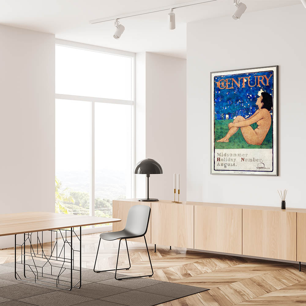 Capture the essence of summer with this beautiful vintage poster, "The Century Midsummer Holiday Number," by Maxfield Parrish. Featuring a serene figure against a striking blue and green background, this artwork reflects the peaceful beauty of nature and relaxation. With its soft colors and timeless style, it is an ideal addition for those looking to bring a touch of vintage elegance into their space.