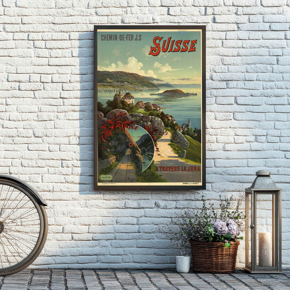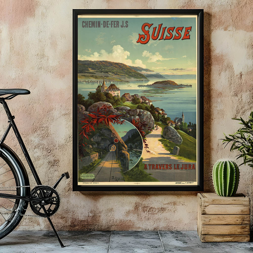 This Retro Switzerland Travel Poster invites you to explore the stunning Jura region, with its picturesque landscapes and tranquil lakeside views. Featuring a classic illustration of the beautiful Swiss countryside, the poster showcases a charming village, winding paths, and a railway journey through lush hills. The serene color palette and vintage style evoke the peace and beauty of Switzerland, making it a perfect addition to any retro or travel-inspired decor. Whether you’re a fan of Swiss nature or vintage travel art, this print will bring a sense of adventure and nostalgia to your space.