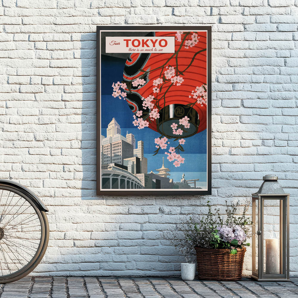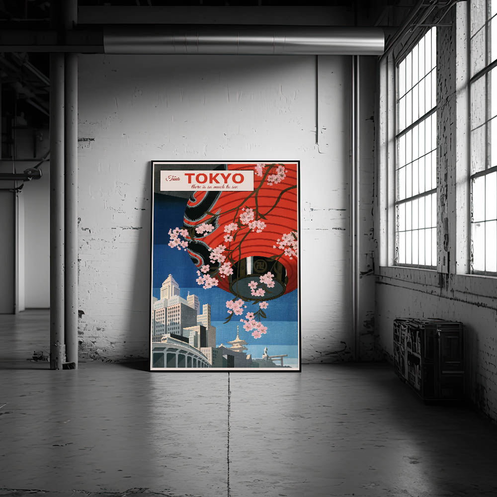Step into the vibrant world of Tokyo with this stunning vintage travel poster. Featuring the perfect blend of modern architecture and traditional elements, this retro art print showcases a glowing red lantern, delicate cherry blossoms, and the majestic Tokyo skyline. The artistic style beautifully contrasts the bustling city with the tranquility of nature, offering a glimpse of Tokyo's unique blend of past and present.