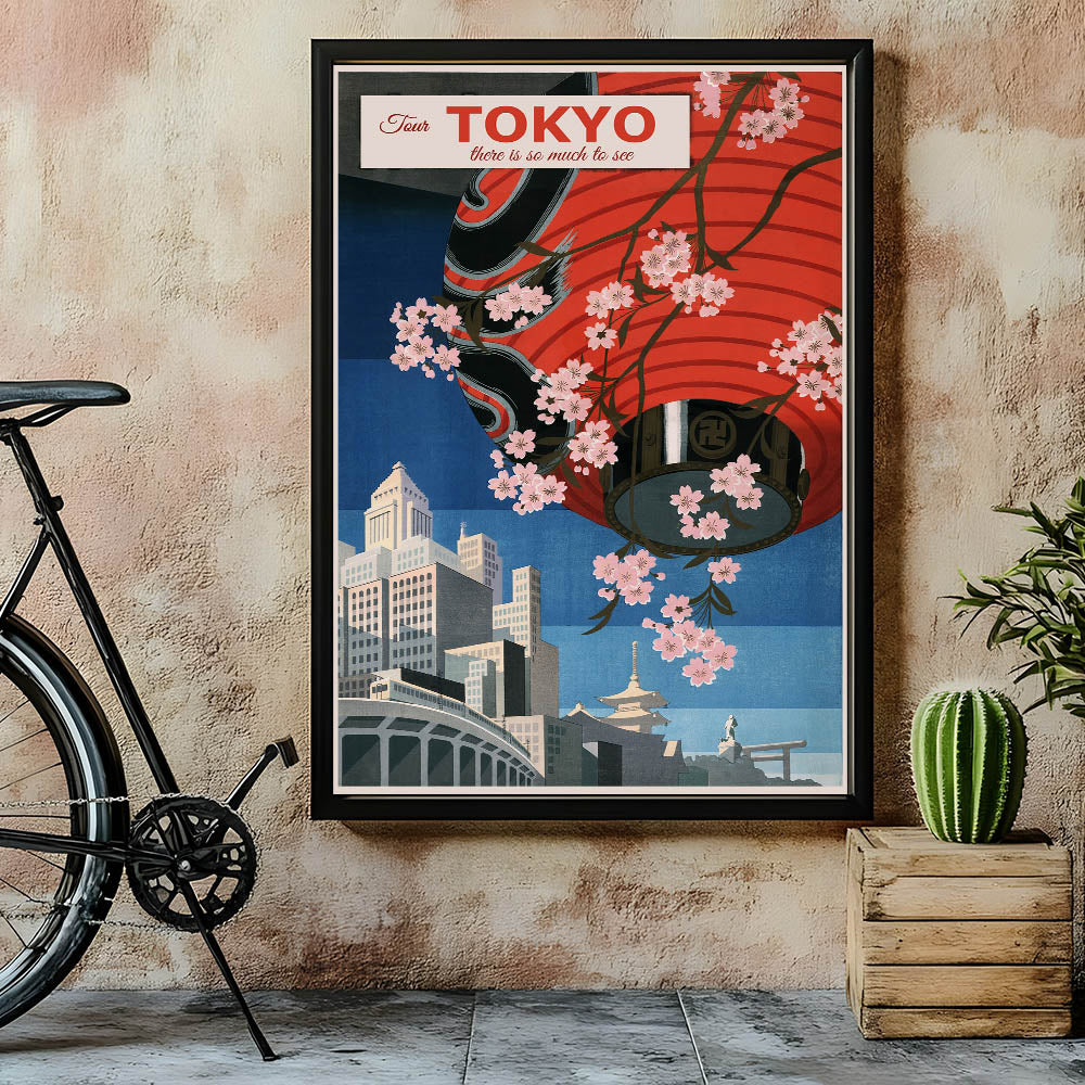 The iconic cherry blossoms set against the bold red lantern symbolize the beauty and cultural richness of Japan, making this vintage decor perfect for anyone who appreciates the retro aesthetic of mid-century travel posters. Whether you've visited Tokyo or dream of experiencing it, this print captures the essence of the city in an unforgettable way.