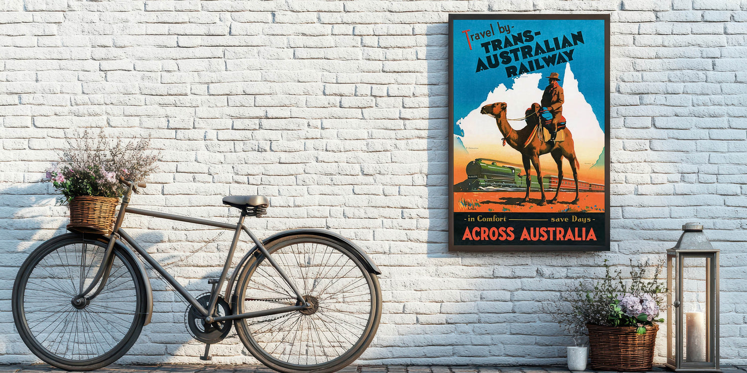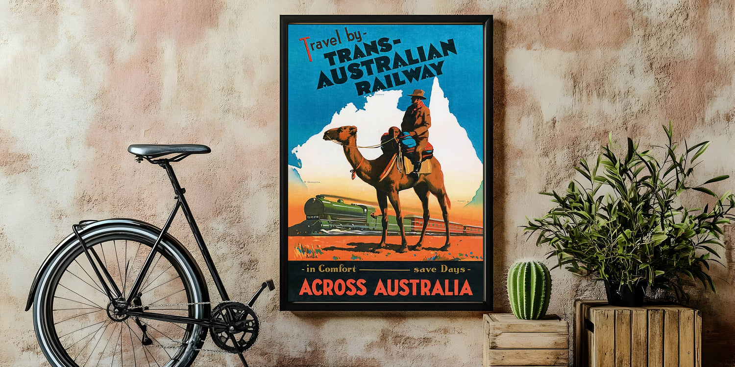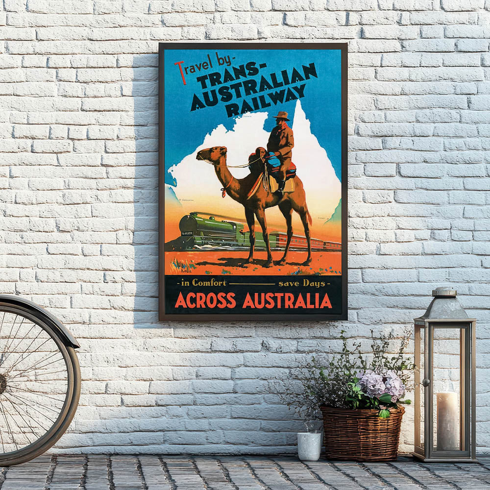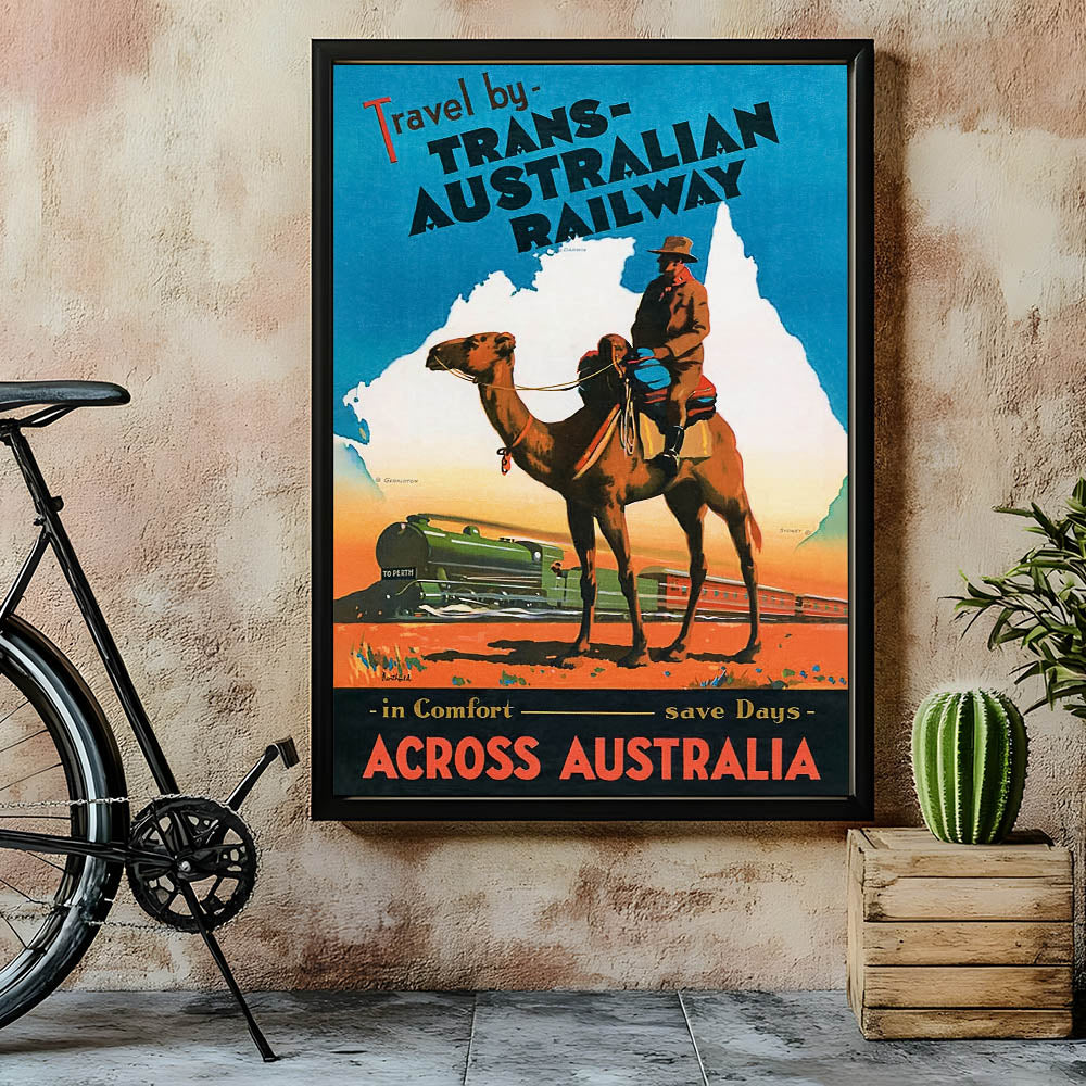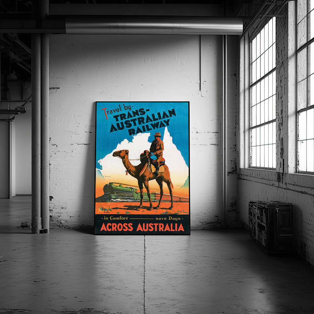 Embark on an unforgettable journey through Australia with this Vintage Trans-Australian Railway Poster. Featuring a striking scene of a camel rider and a vibrant train, this classic travel art captures the adventurous spirit of traveling across the vast Australian outback. With bold colors of orange, blue, and green, it’s a perfect piece to bring a sense of wanderlust and nostalgia into any space.