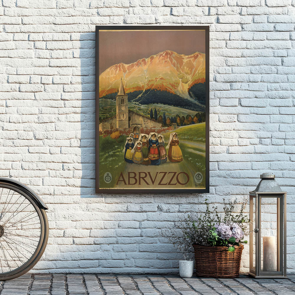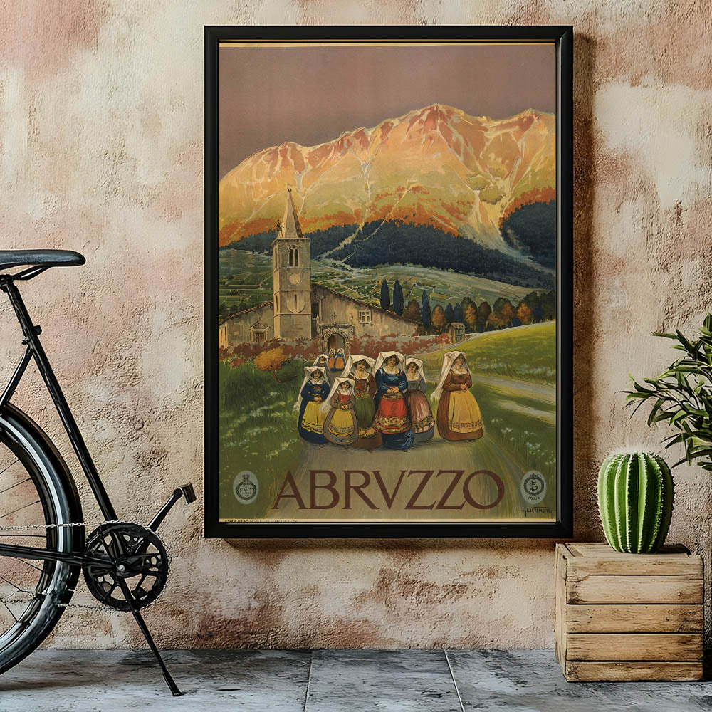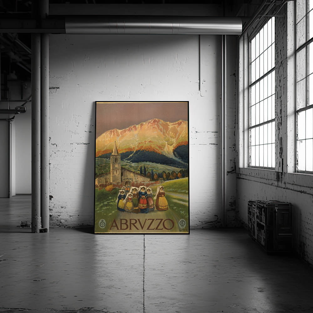 Capture the timeless beauty of Italy with this Vintage Travel Poster featuring the enchanting region of Abruzzo. Showcasing traditional Italian architecture and vibrant cultural attire against the backdrop of majestic mountains, this piece brings a touch of nostalgia and heritage to any space. Perfect for travel enthusiasts and art lovers alike, this artwork celebrates the charm of old-world travel.