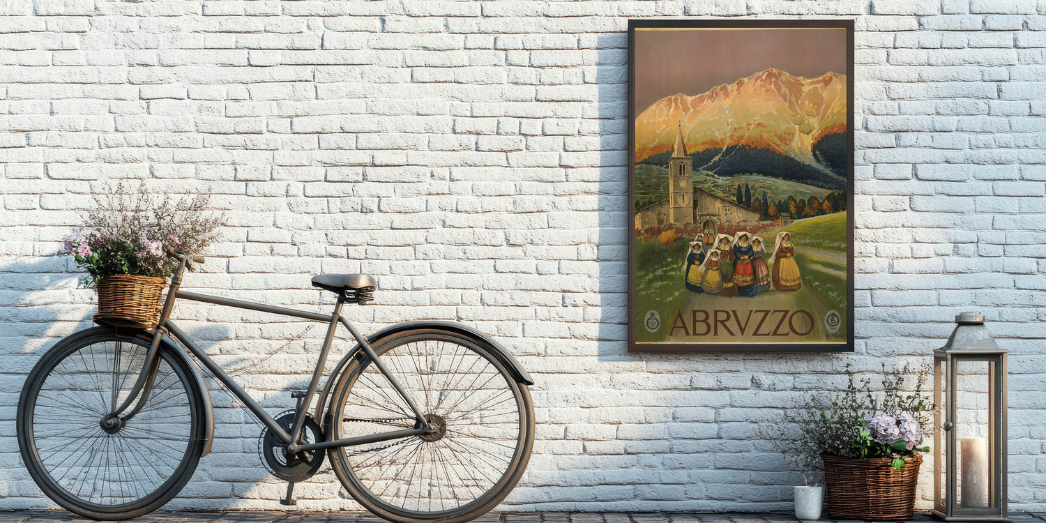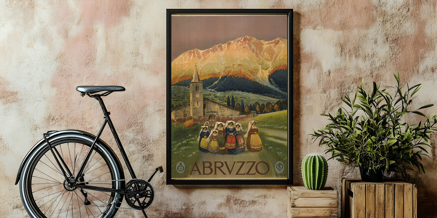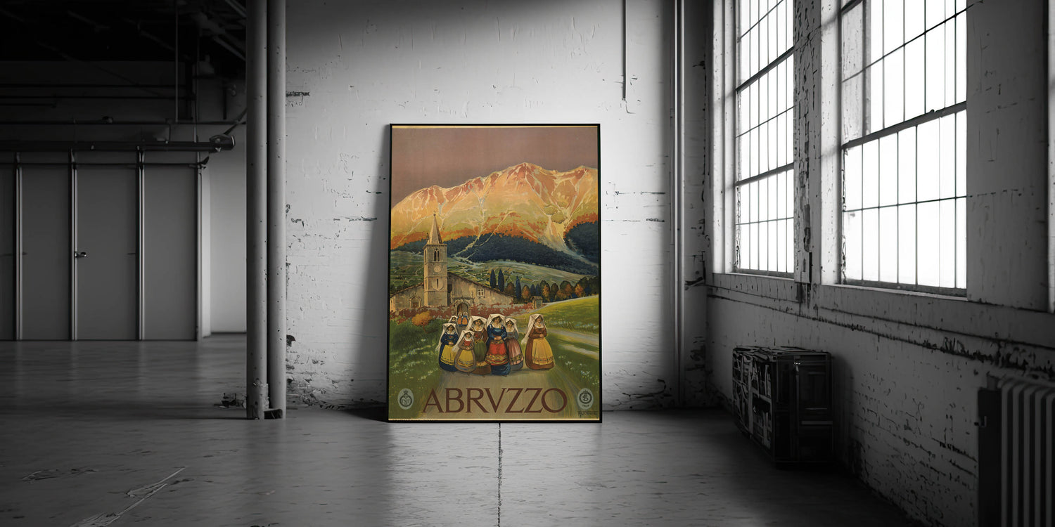 Capture the timeless beauty of Italy with this Vintage Travel Poster featuring the enchanting region of Abruzzo. Showcasing traditional Italian architecture and vibrant cultural attire against the backdrop of majestic mountains, this piece brings a touch of nostalgia and heritage to any space. Perfect for travel enthusiasts and art lovers alike, this artwork celebrates the charm of old-world travel.