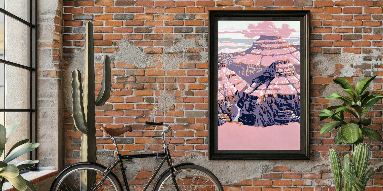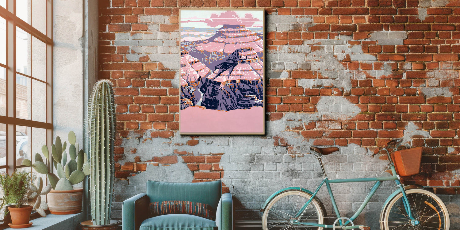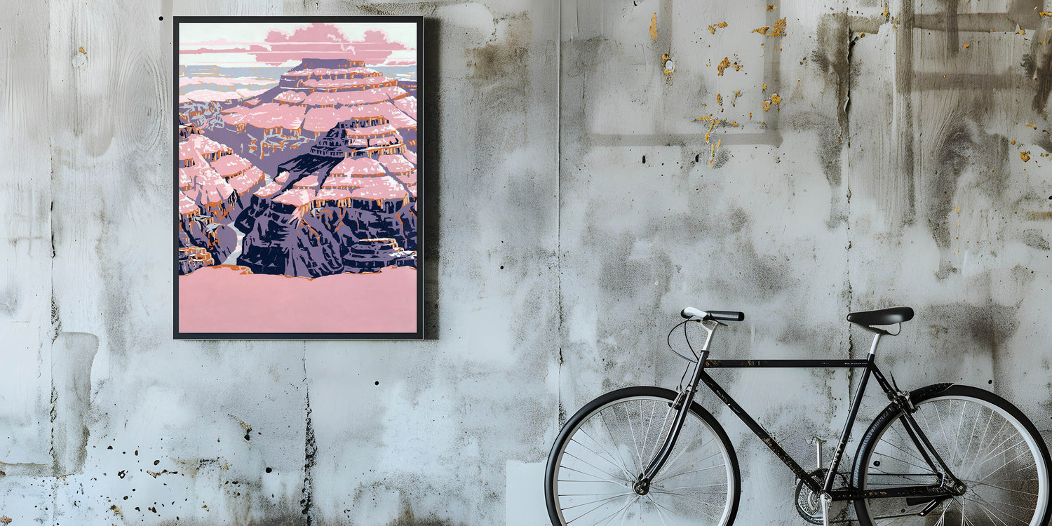 Experience the breathtaking beauty of the Grand Canyon with this Vintage Travel Poster. Featuring soft pinks, purples, and warm oranges, this artwork captures the essence of retro tourism art. The layered canyon formations and delicate hues evoke a sense of nostalgia, making it an ideal choice for those who appreciate classic travel decor. The bold contrasts and serene landscape transport you to a timeless era of exploration and wonder.