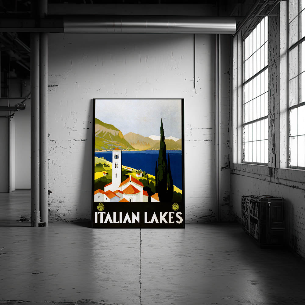 This stunning vintage travel poster captures the charm of Italy's famous lakes, showcasing the tranquil beauty of its serene waters and picturesque landscapes. Designed by the Italian government, this artwork brings timeless appeal and classic vacation vibes to any space. Whether you're a fan of vintage tourism illustrations or retro destination prints, this piece is a perfect addition to your collection.