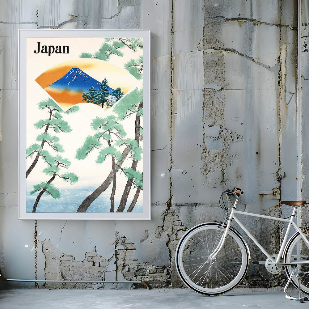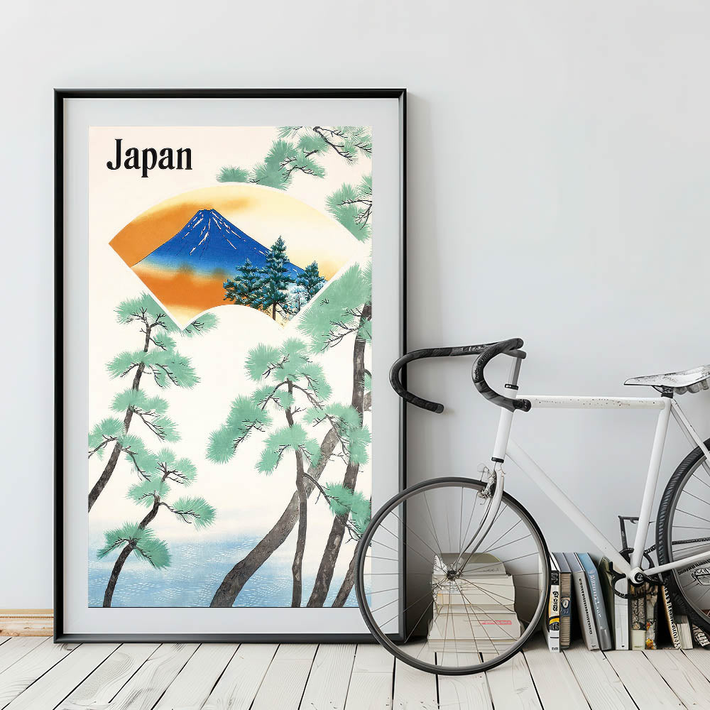 Immerse yourself in the serene beauty of Japan with this Vintage Travel Poster, featuring Mount Fuji framed by delicate pine trees. The soft hues of green and blue paired with the warm tones of the sky create a harmonious blend that captures the essence of traditional Japanese aesthetics. The fan-shaped design element adds a unique touch, making this artwork a captivating choice for lovers of classic travel decor and Japanese culture.