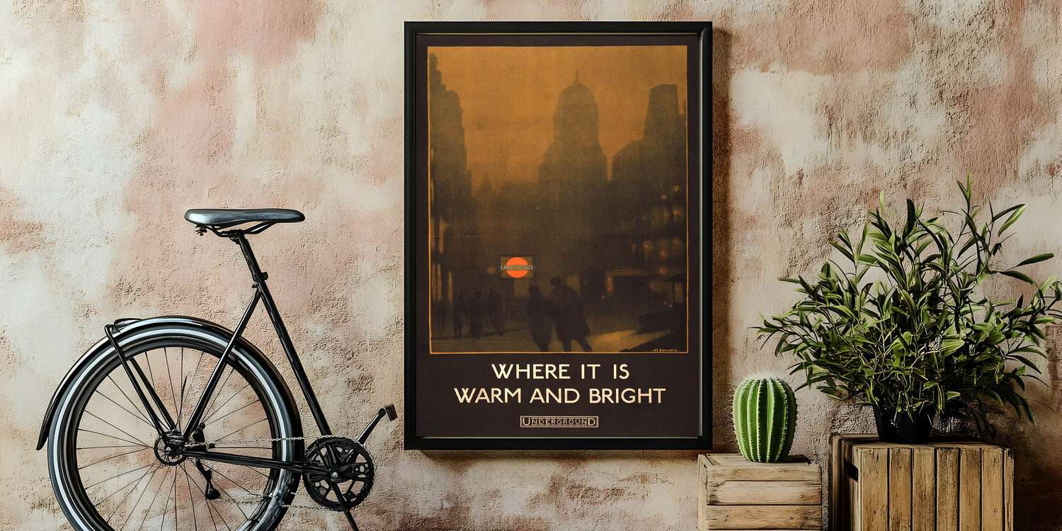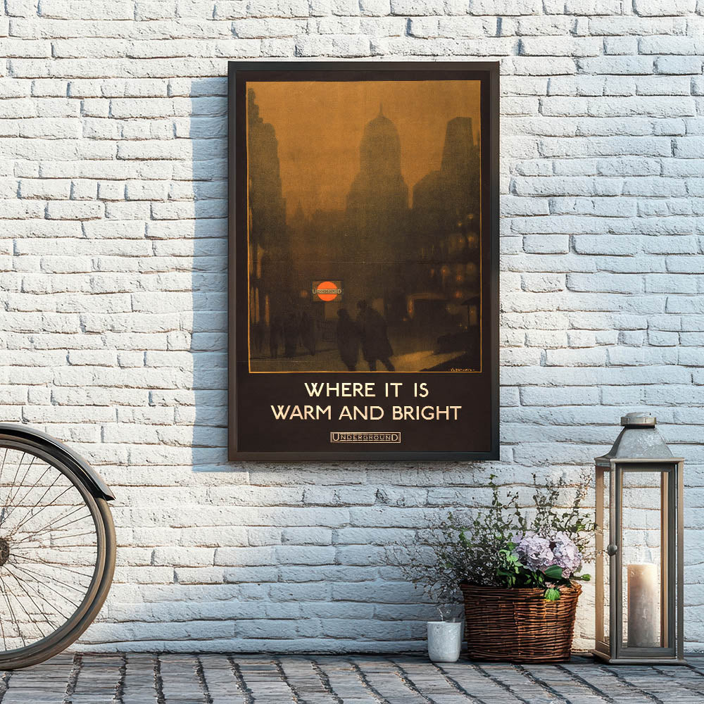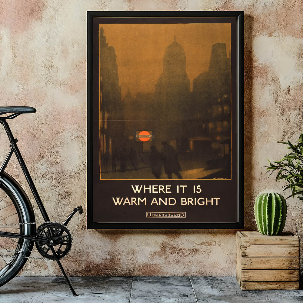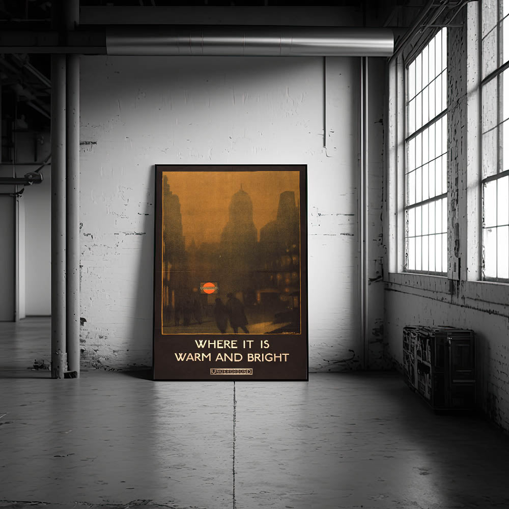 Step into the misty streets of London with this Vintage Travel Poster featuring the iconic Underground sign. The warm hues of amber and deep shadows capture the essence of early 20th-century city life, where foggy silhouettes and glowing streetlights evoke a sense of nostalgia. The soft, muted palette and elegant typography make this artwork an ideal choice for those who appreciate both vintage travel decor and the timeless allure of London’s historic charm.