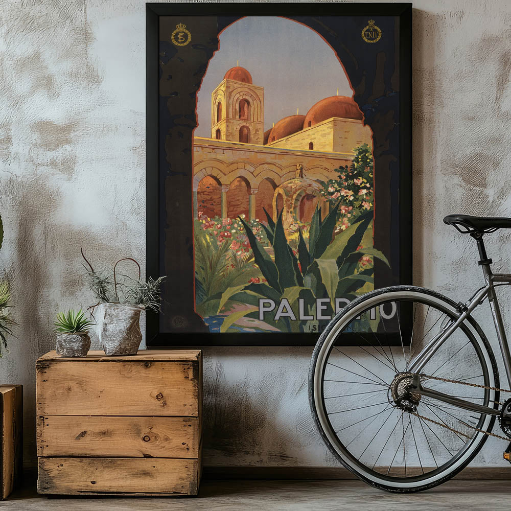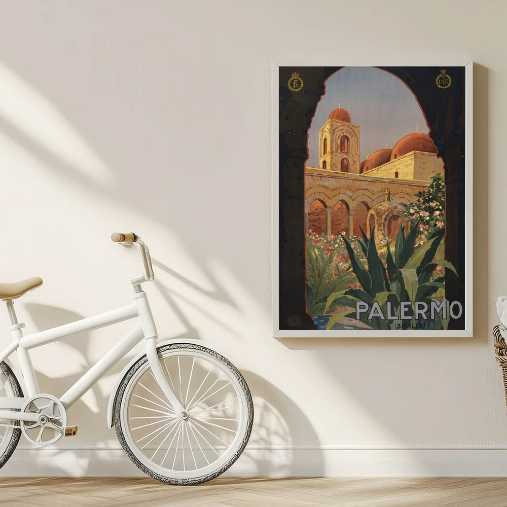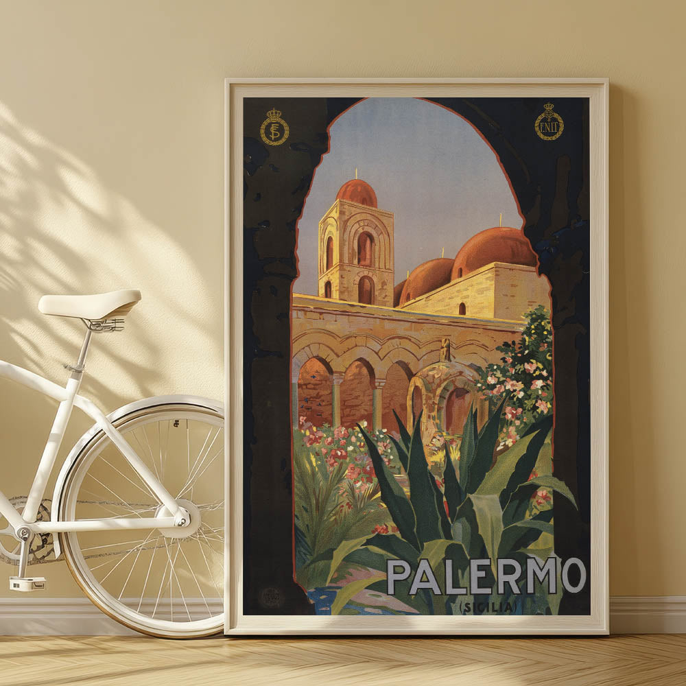 Step into the charm of Southern Italy with this Vintage Travel Poster showcasing the historic beauty of Palermo, Sicily. Featuring intricate architecture, vibrant flora, and the rich warmth of sunlit stones, this artwork captures the essence of Mediterranean elegance. The classic arches and domes framed by lush greenery invite viewers to explore the timeless allure of this iconic destination.
