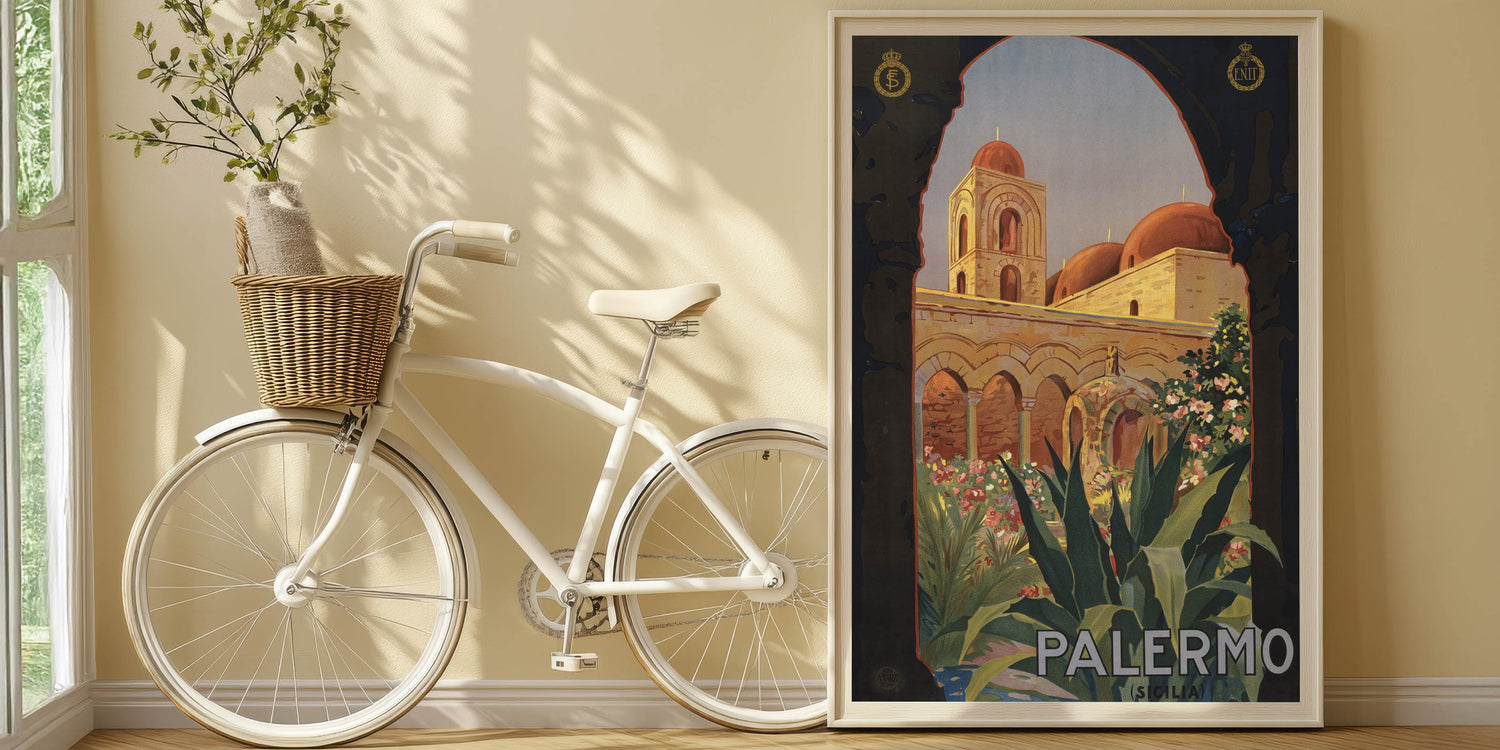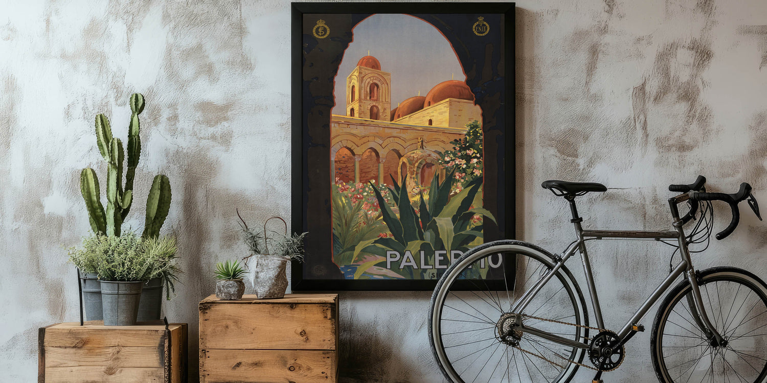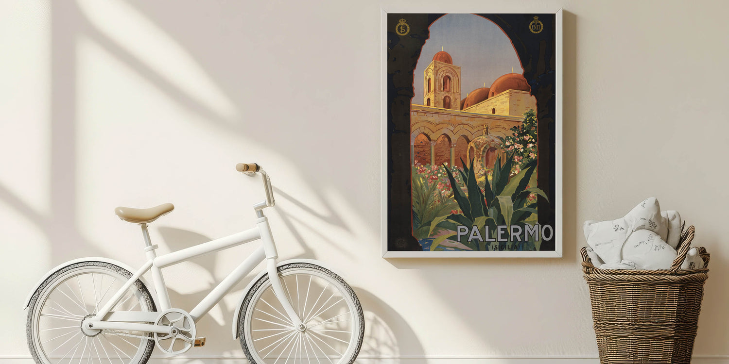 Step into the charm of Southern Italy with this Vintage Travel Poster showcasing the historic beauty of Palermo, Sicily. Featuring intricate architecture, vibrant flora, and the rich warmth of sunlit stones, this artwork captures the essence of Mediterranean elegance. The classic arches and domes framed by lush greenery invite viewers to explore the timeless allure of this iconic destination.