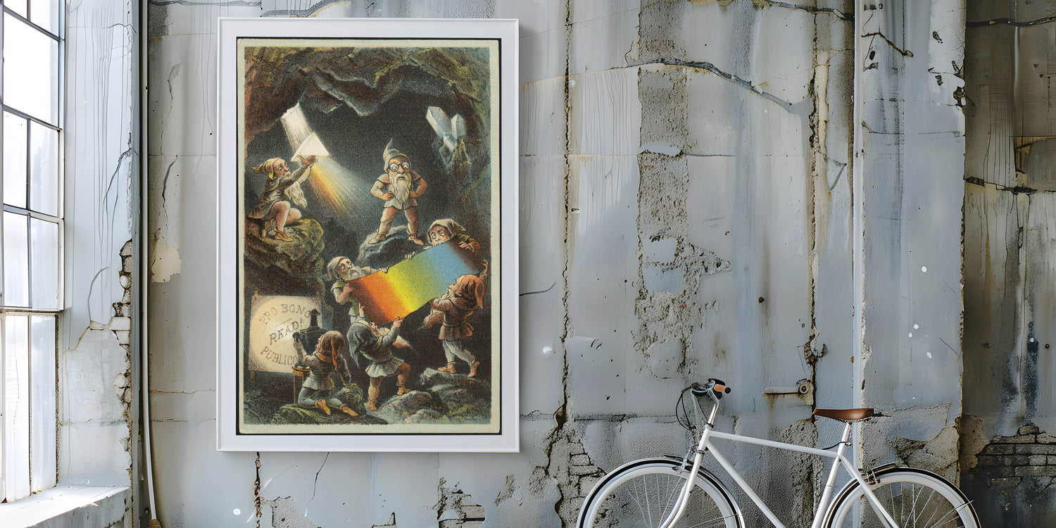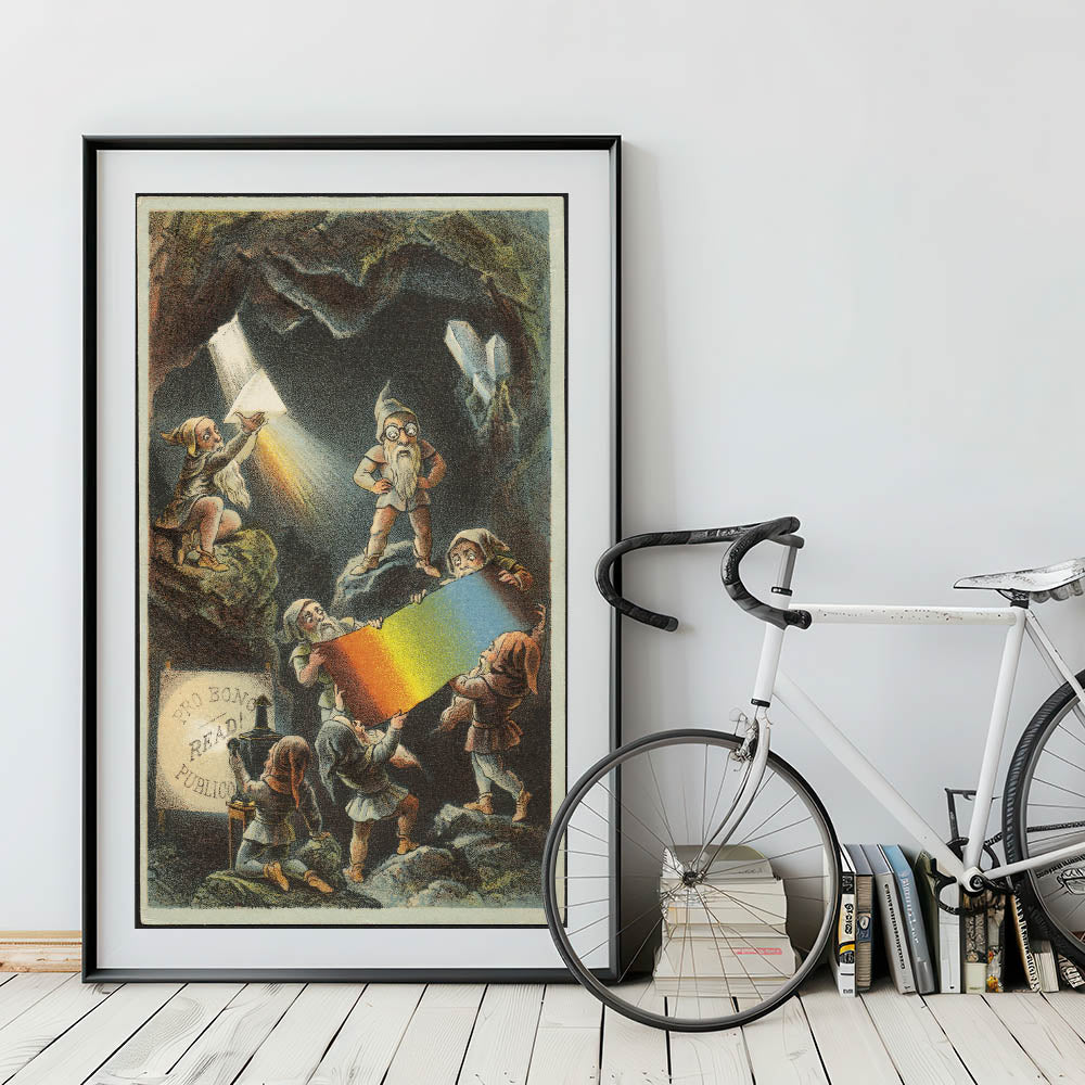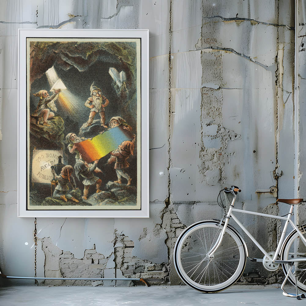 Step into the world of vintage adventure with this timeless travel art featuring a whimsical scene from a classic fantasy illustration. This retro tourism art showcases a playful group of gnomes working together in a colorful underground setting, highlighting a nostalgic, old-world charm. Perfect for those who love unique, iconic travel poster art with a magical twist.