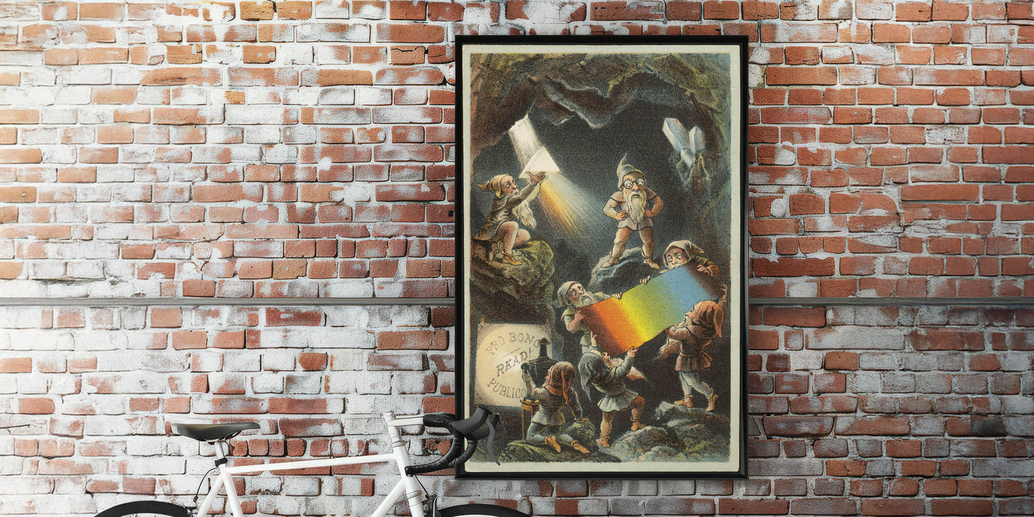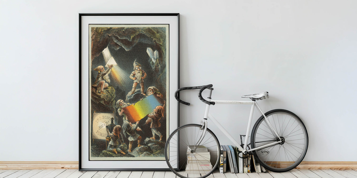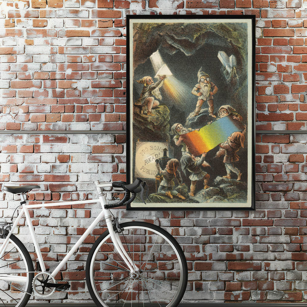 Step into the world of vintage adventure with this timeless travel art featuring a whimsical scene from a classic fantasy illustration. This retro tourism art showcases a playful group of gnomes working together in a colorful underground setting, highlighting a nostalgic, old-world charm. Perfect for those who love unique, iconic travel poster art with a magical twist.