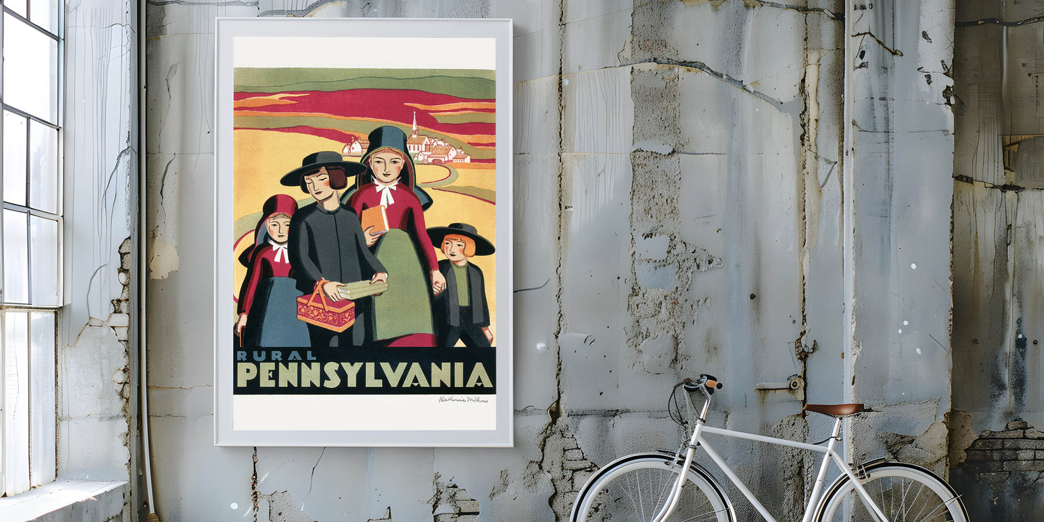 Transform your space with this nostalgic travel print, celebrating the history and charm of Pennsylvania's countryside. Perfect for those who appreciate classic travel decor and heritage travel illustrations.