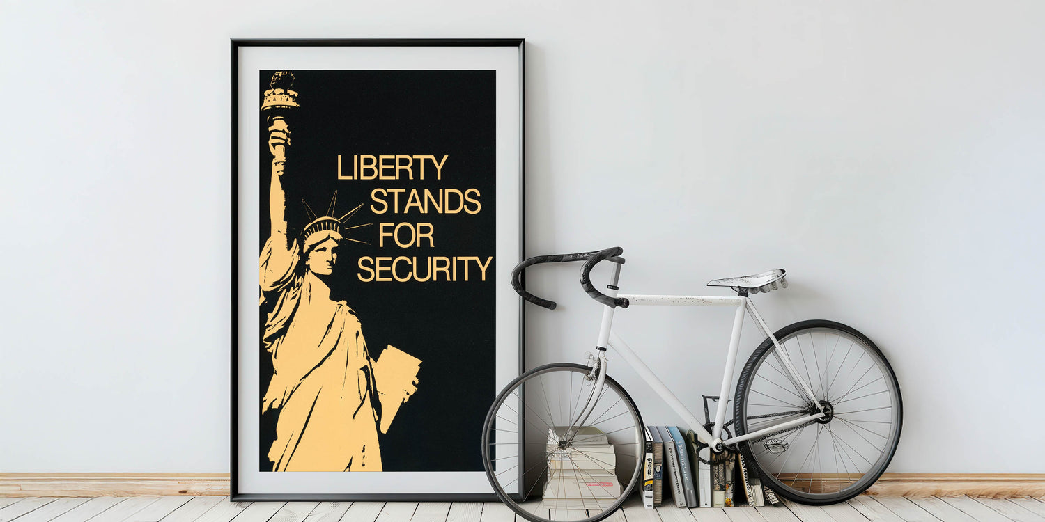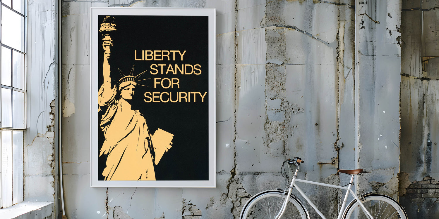 Celebrate the spirit of freedom with this Vintage Travel Poster featuring the Statue of Liberty. The bold contrast of black and warm beige creates a striking, timeless design that embodies the essence of classic travel art. The powerful message, "Liberty Stands for Security," adds a patriotic touch, making this artwork an ideal choice for history enthusiasts and those who appreciate vintage tourism illustrations.