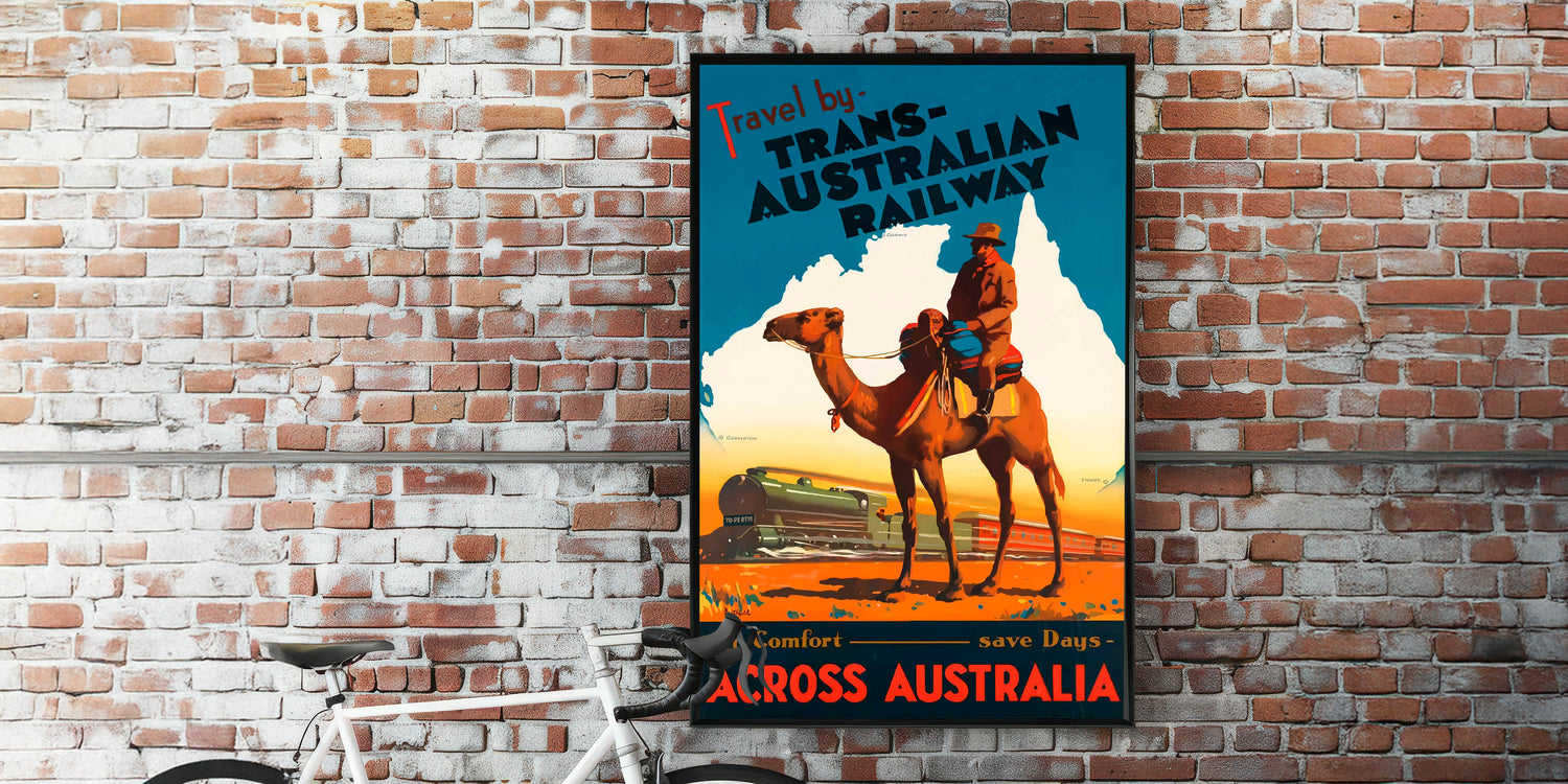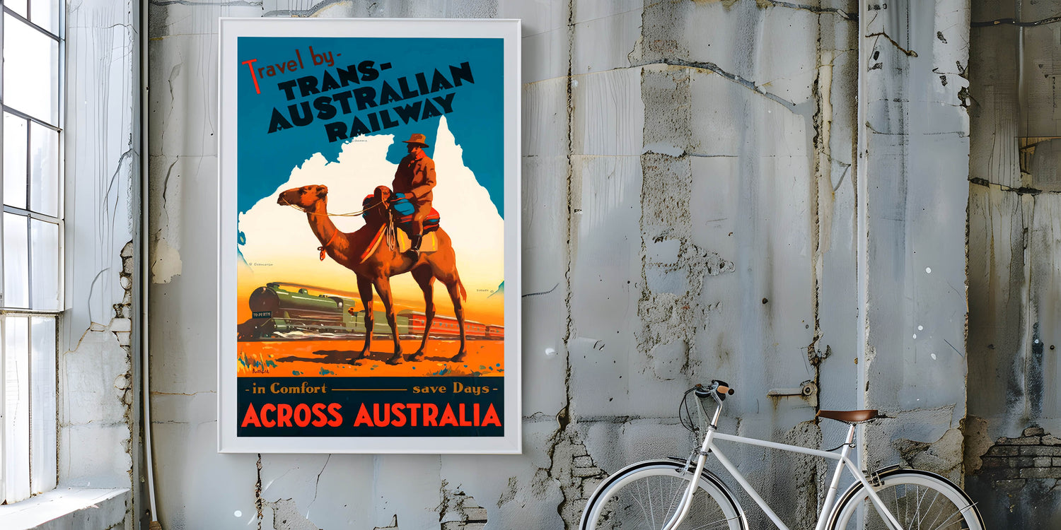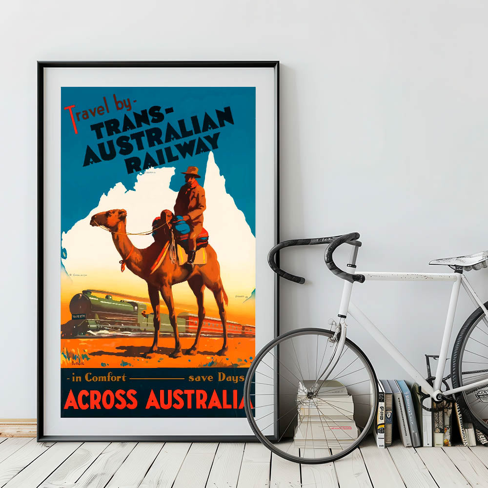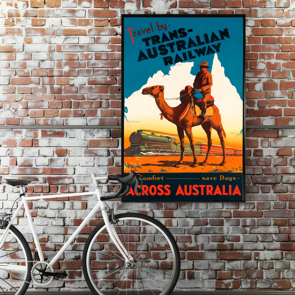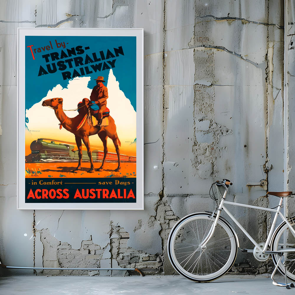 Experience the allure of the Australian outback with our Vintage Travel Poster - Trans-Australian Railway. This classic travel art captures a nostalgic journey across Australia, featuring a camel rider set against a bold backdrop of deep blues, warm oranges, and desert tones. The authentic vintage travel art style adds a timeless charm to any decor, making it a perfect piece for travel enthusiasts and collectors alike.