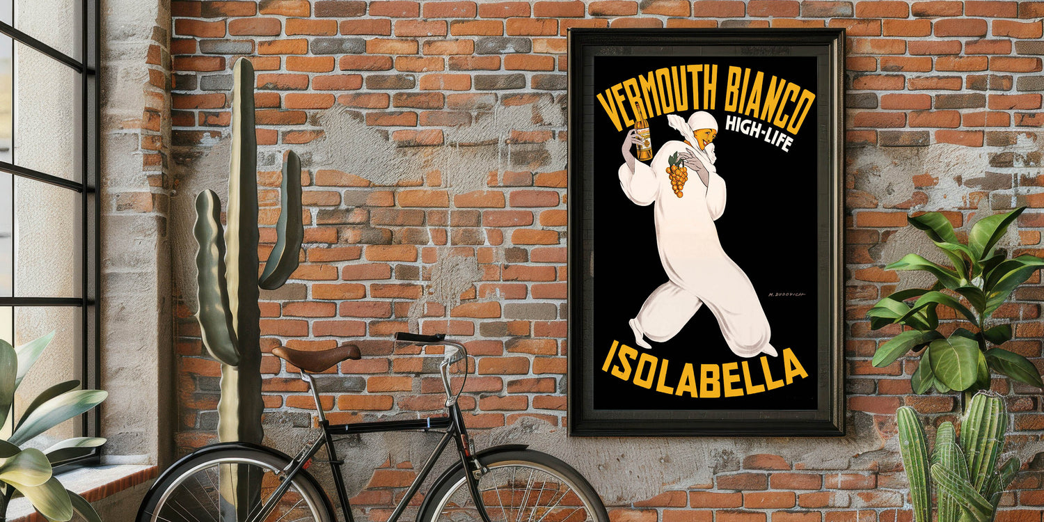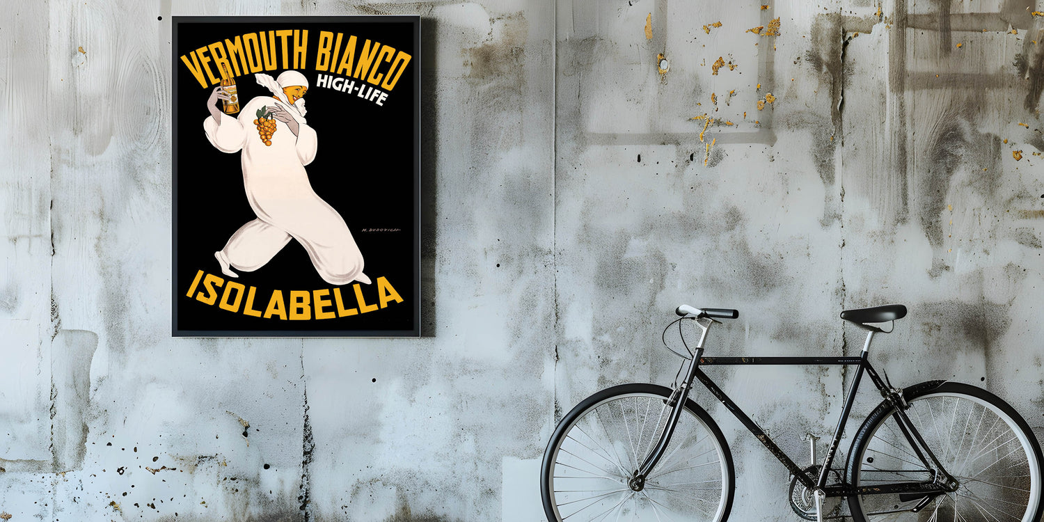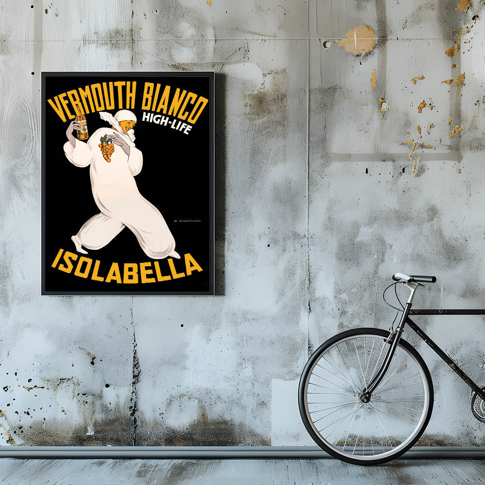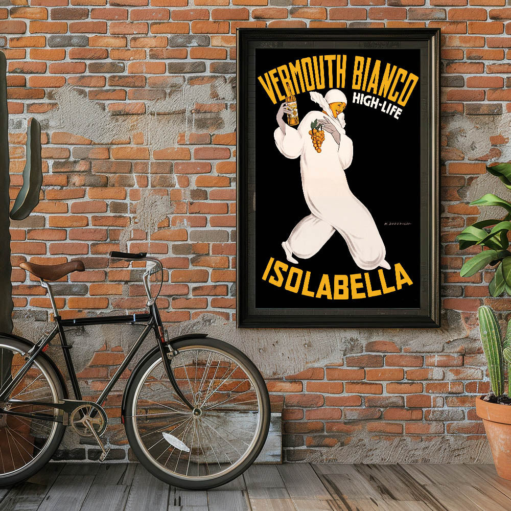 Bring a touch of Italian elegance to your space with this Vintage Vermouth Bianco Advertising Poster. Featuring a stylish figure holding a bottle of Vermouth Bianco and grapes, this iconic vintage-inspired wall art captures the allure and sophistication of early 20th-century advertising. The bold yellow lettering and dramatic black background make this nostalgic advertising print stand out in any room.