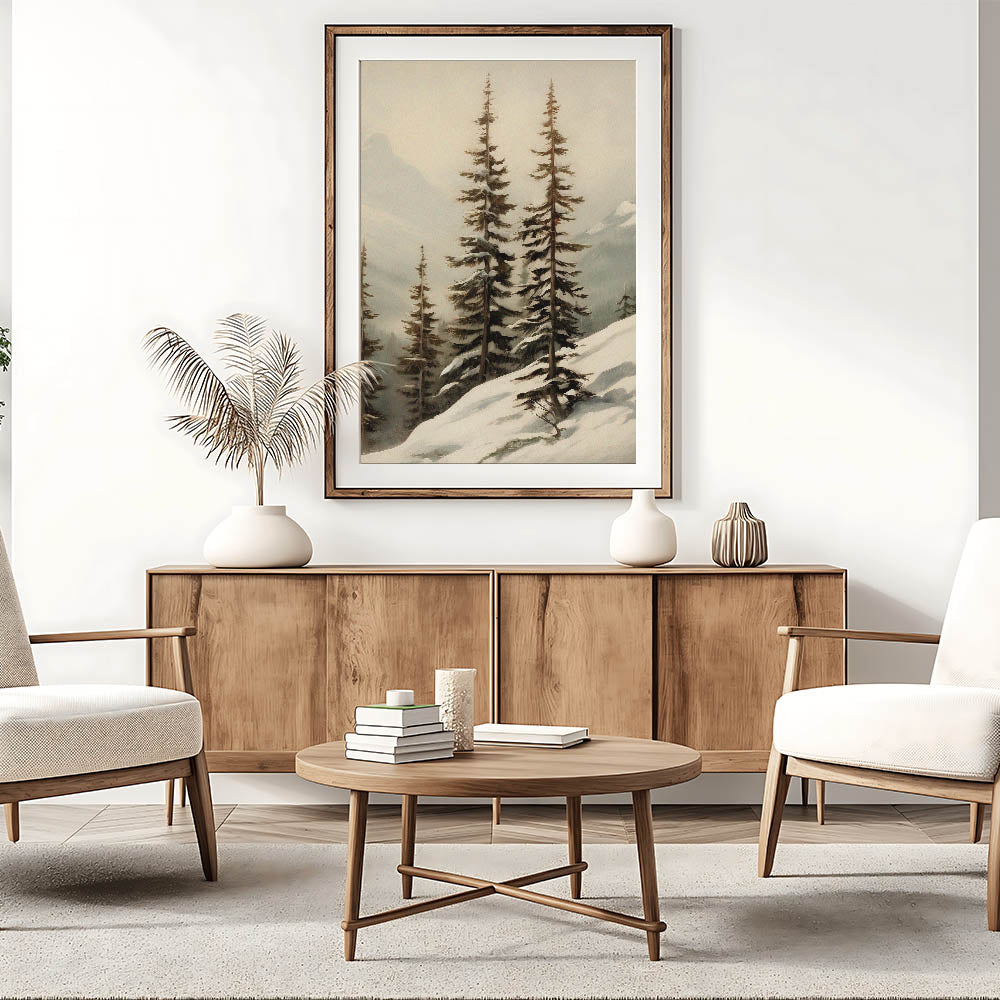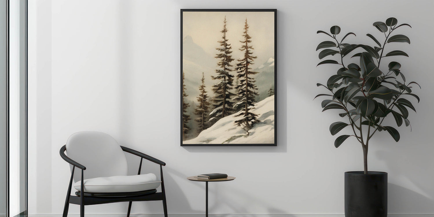 This retro plant poster brings the peaceful ambiance of a winter forest into your space. Whether displayed as a standalone statement or paired with other timeless botanical prints, this artwork enhances any setting with its elegant and calming nature.