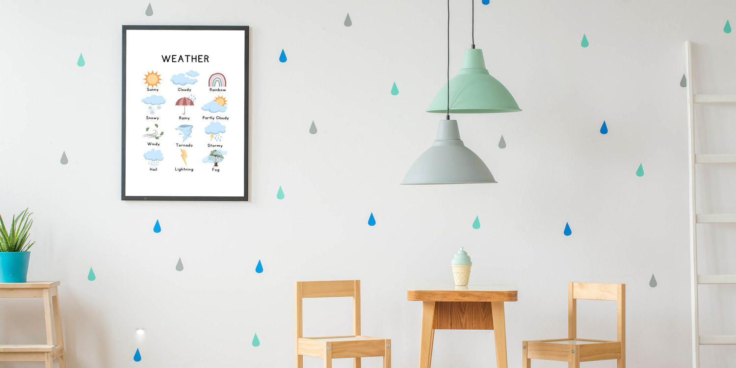 - High-quality, vibrant typography art prints showcasing different weather elements.
