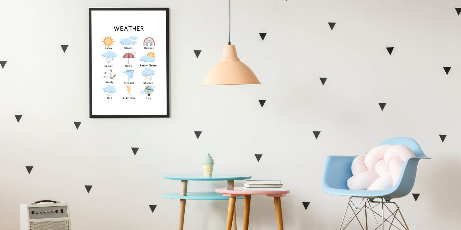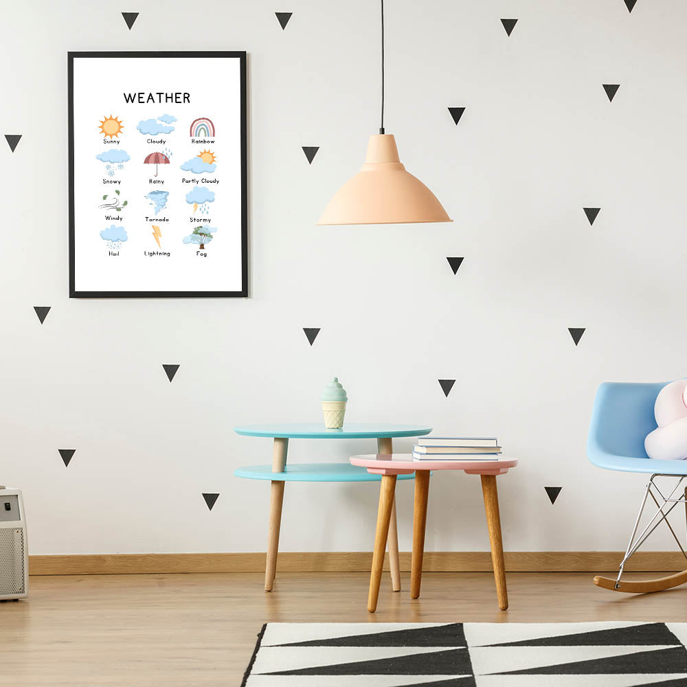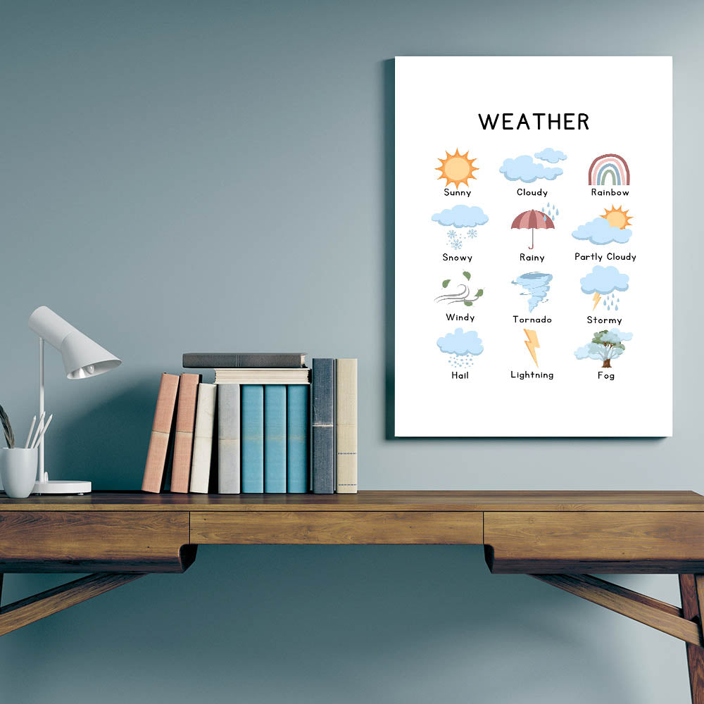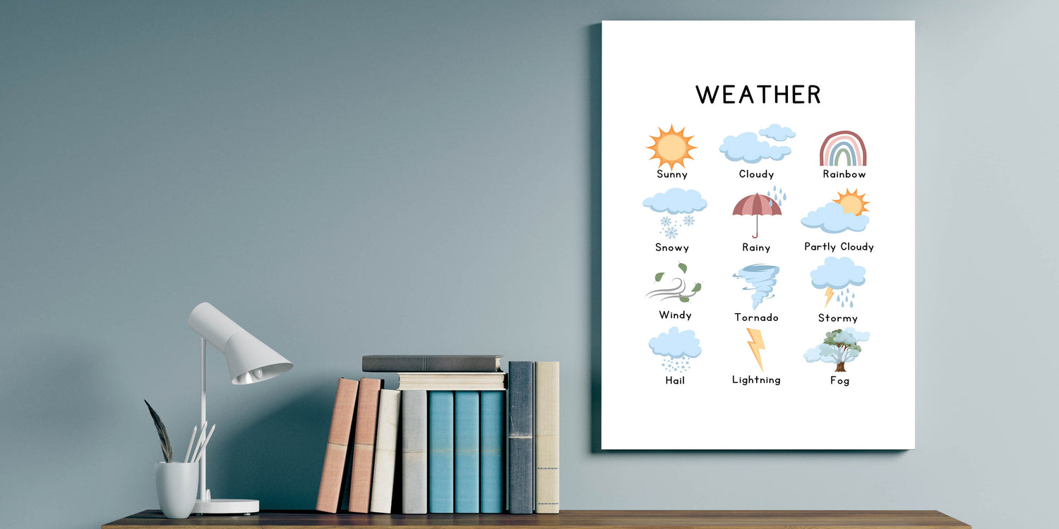 This Weather Typography Art Print brings a playful and modern touch to your home décor. Featuring vibrant weather icons like sunny skies, rainbows, and cloudy clouds, this minimalist typography canvas is perfect for brightening up your living space. Ideal for adding a whimsical yet contemporary element to any room.