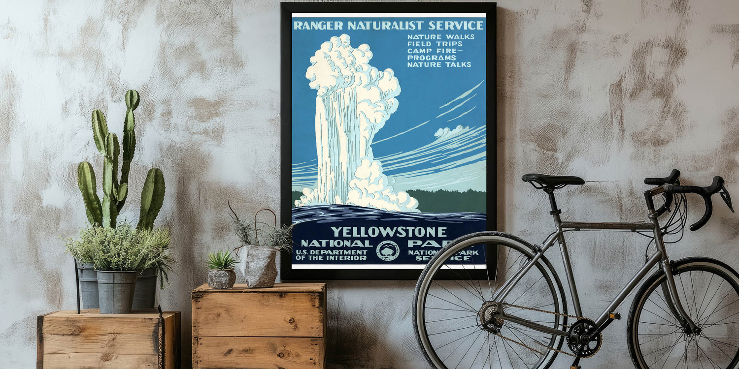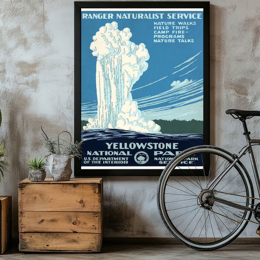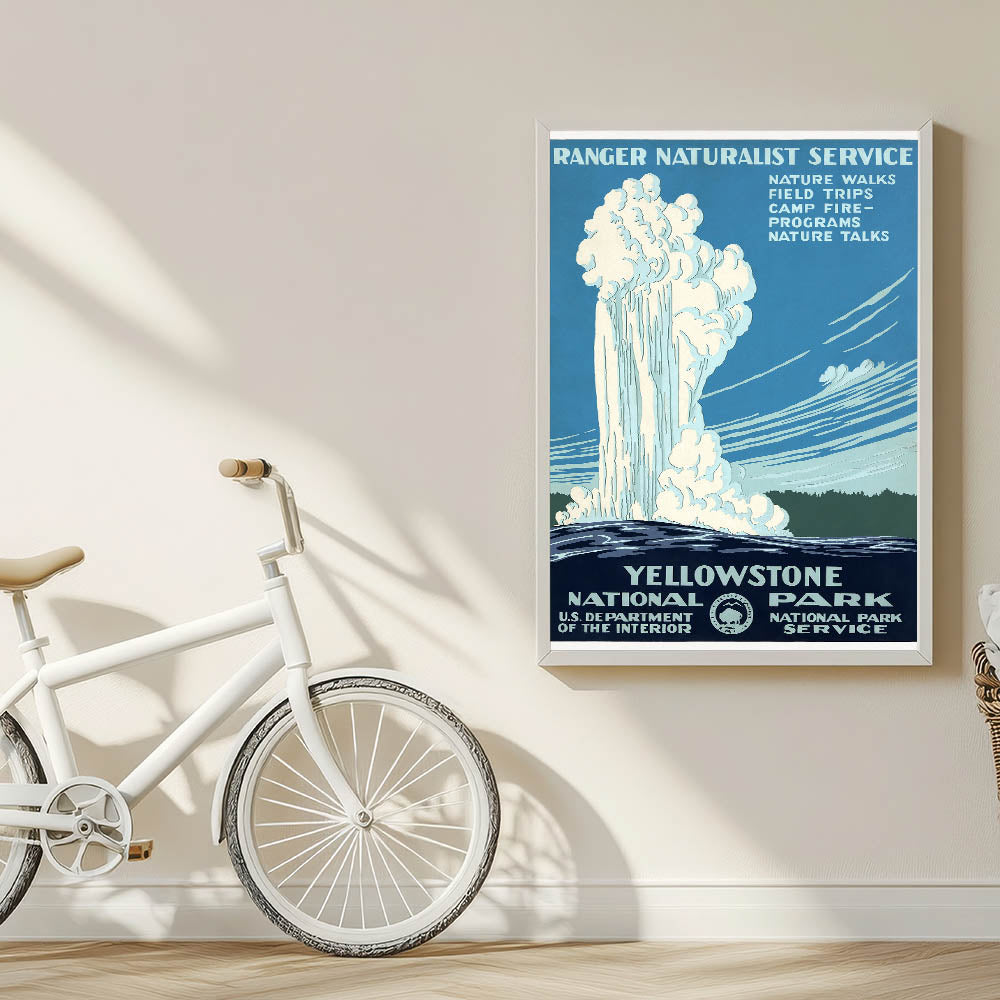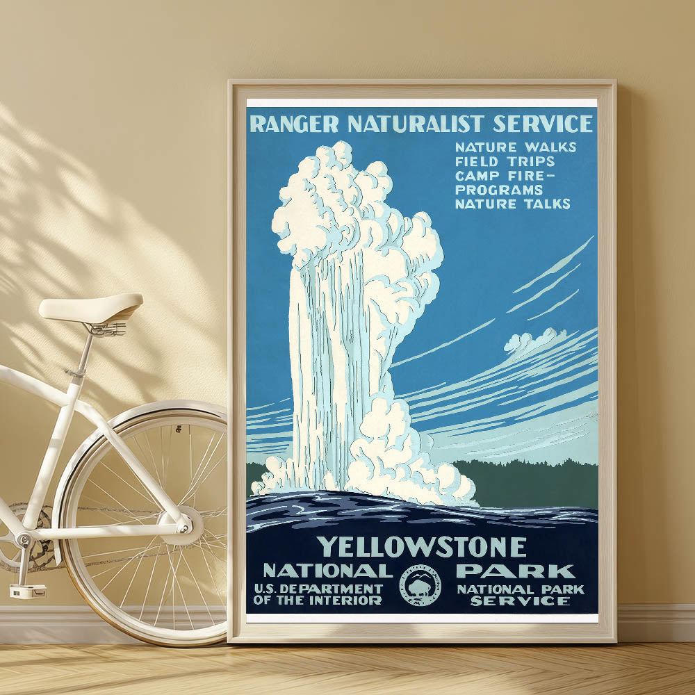 Experience the majesty of Yellowstone National Park with this vintage destination poster featuring the famous geyser in full eruption. The design promotes the Ranger Naturalist Service, highlighting programs like nature walks, field trips, and nature talks, all set against the park's iconic landscape. This classic travel art piece captures the essence of Yellowstone, a place of natural beauty and adventure, making it a must-have for nature lovers and collectors of nostalgic travel prints.