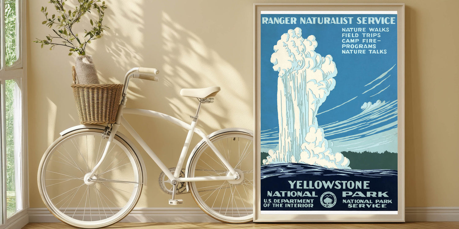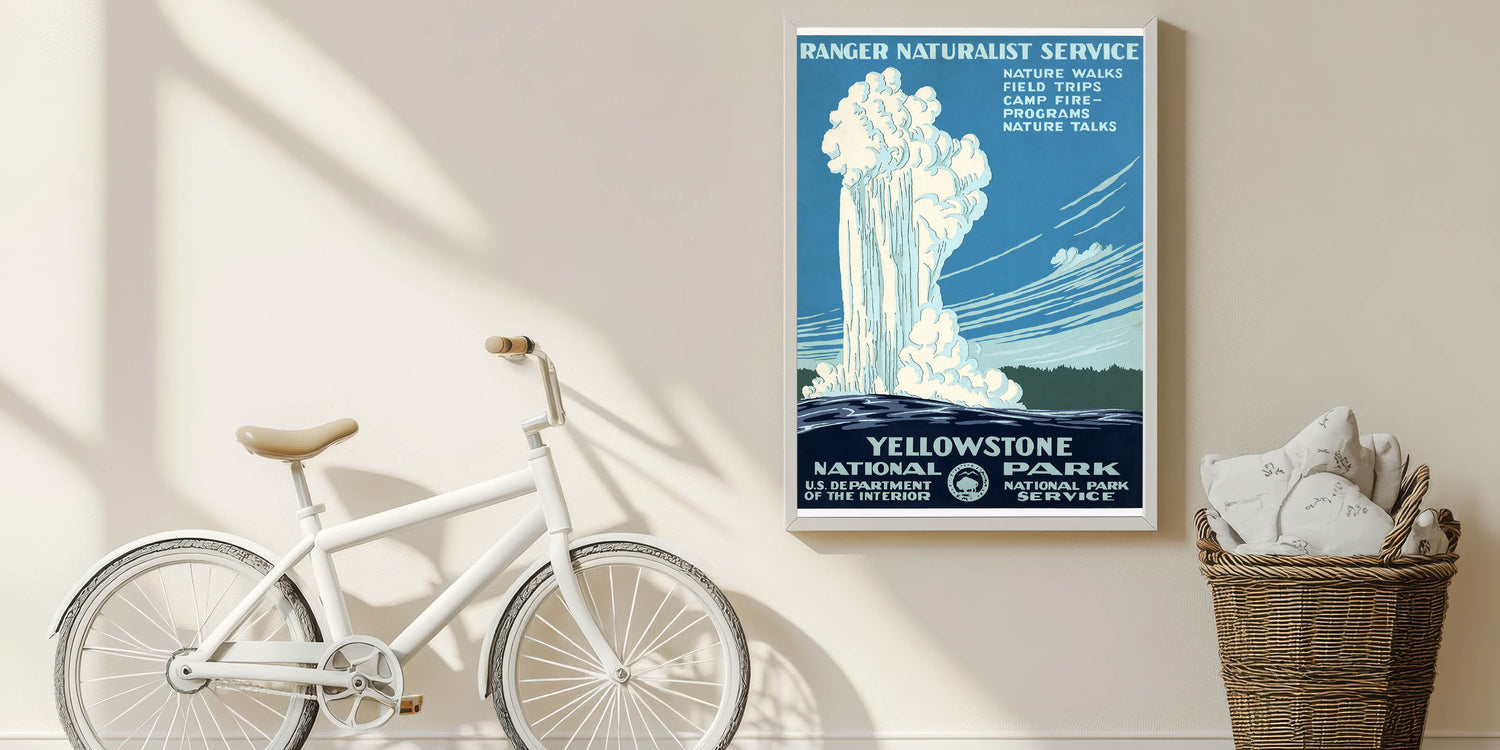 Bring the beauty of Yellowstone’s geysers and majestic landscapes into your home with this timeless retro tourism art print.