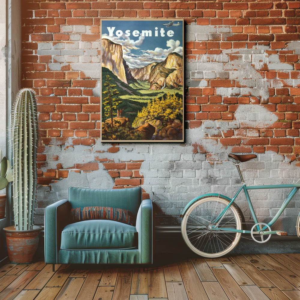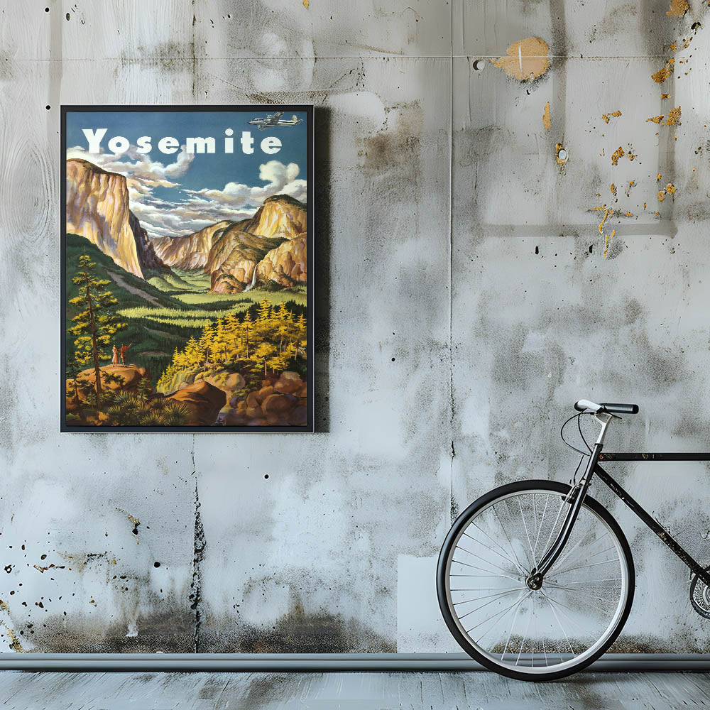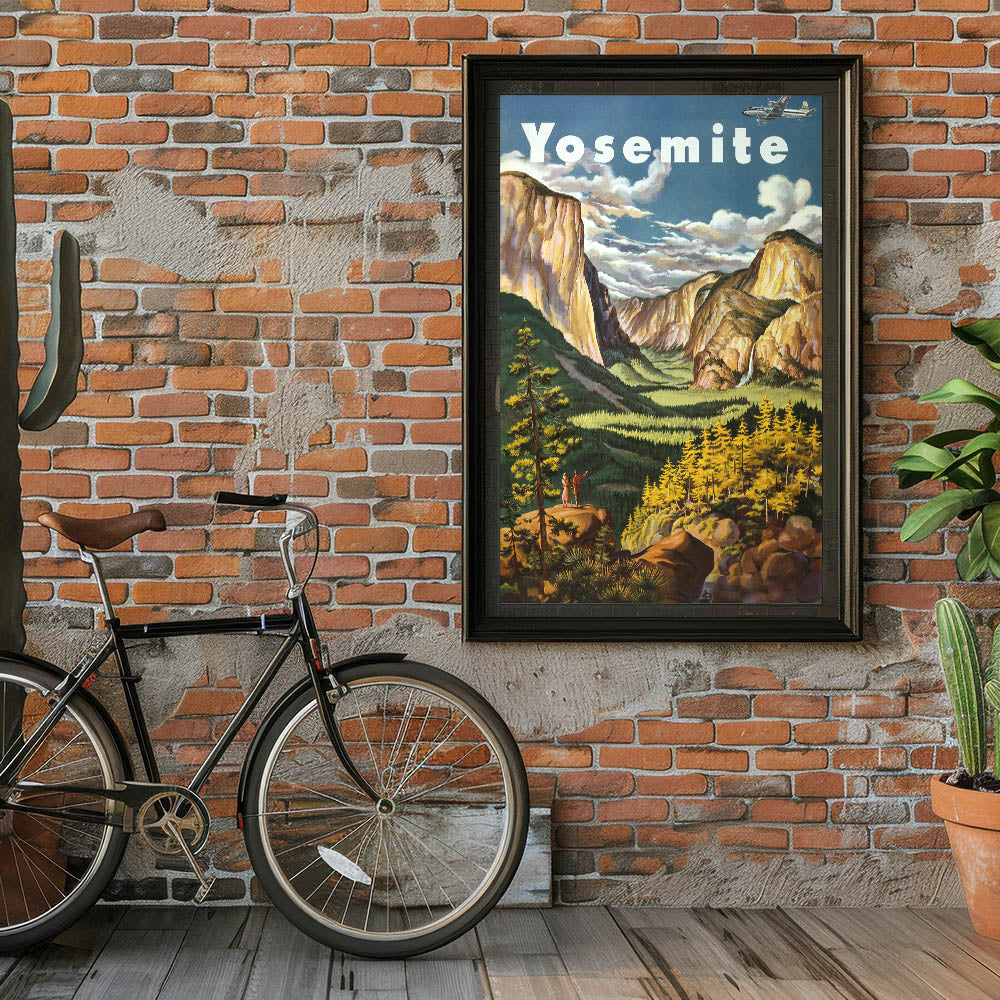 - Timeless Travel Art: A vintage depiction of Yosemite’s majestic landscape, perfect for those who appreciate iconic travel decor.