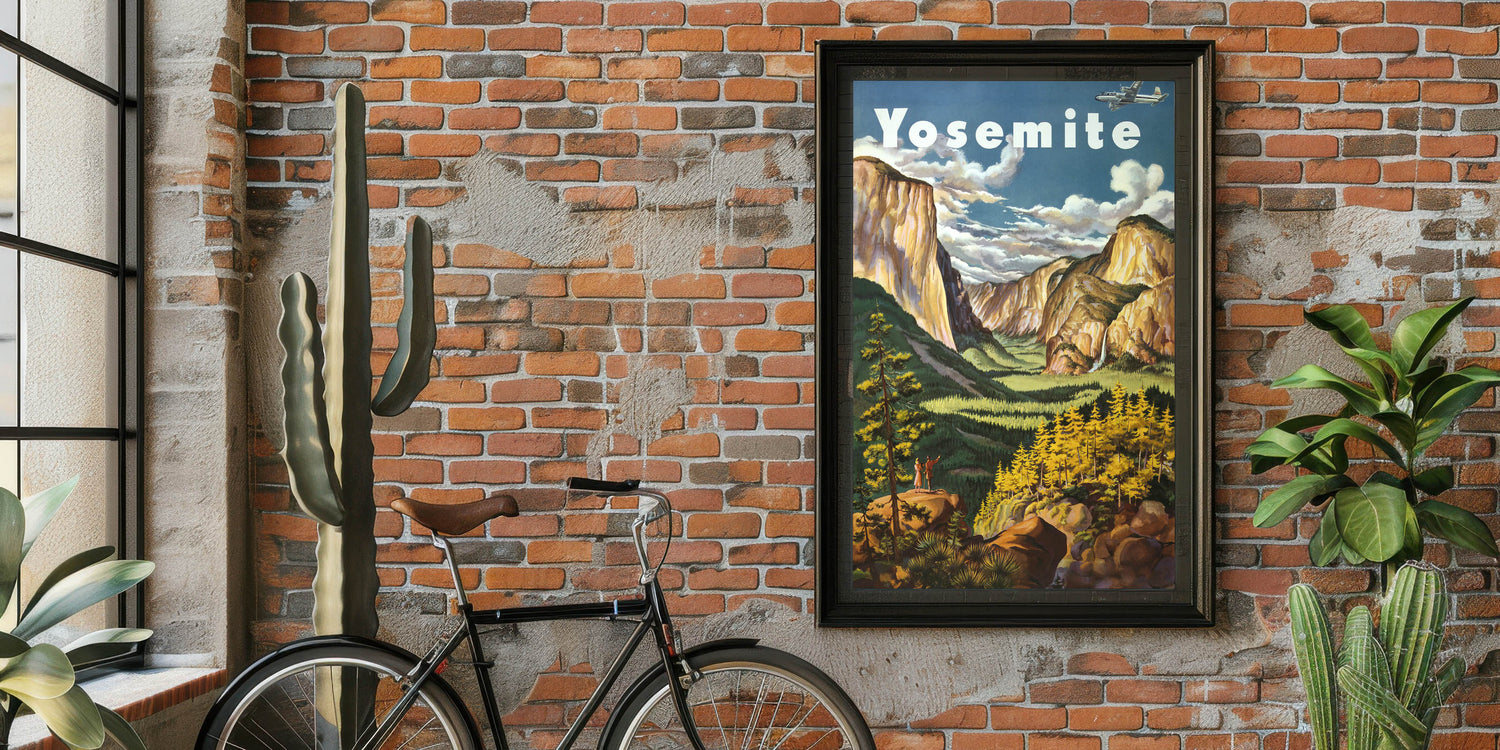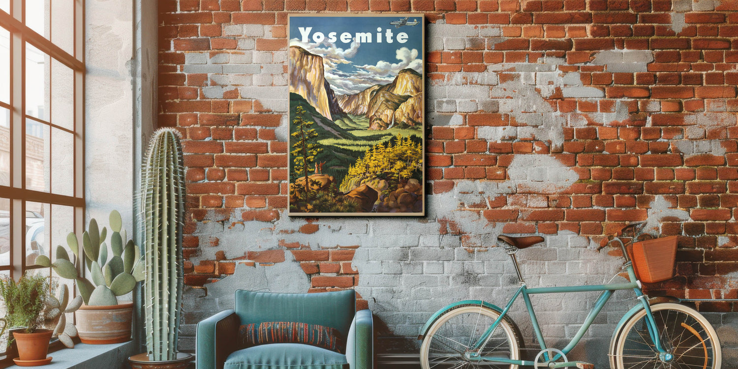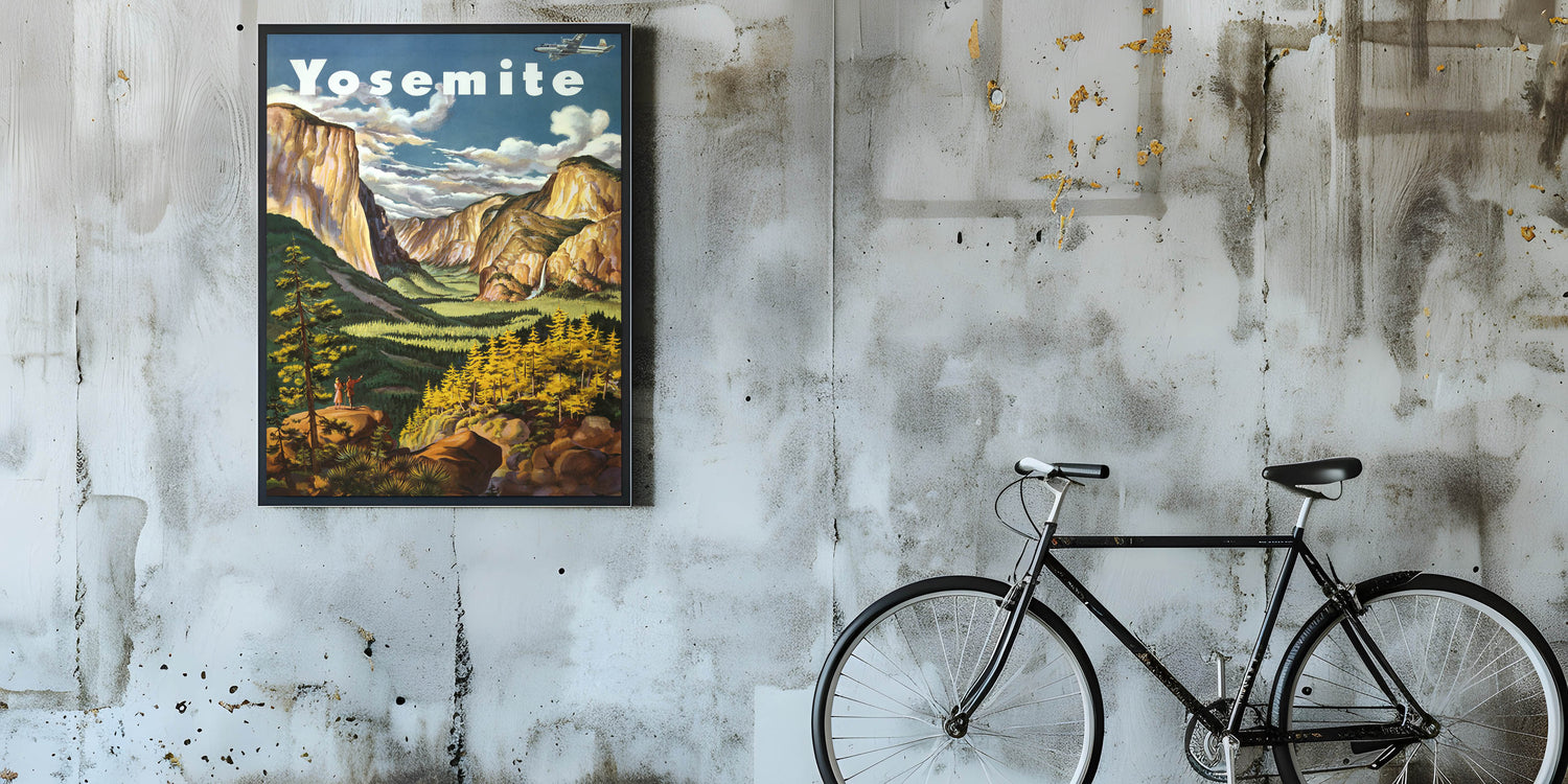 - Timeless Travel Art: A vintage depiction of Yosemite’s majestic landscape, perfect for those who appreciate iconic travel decor.