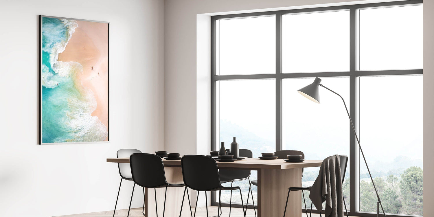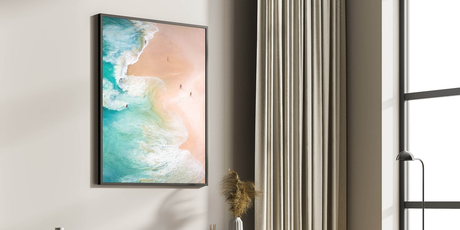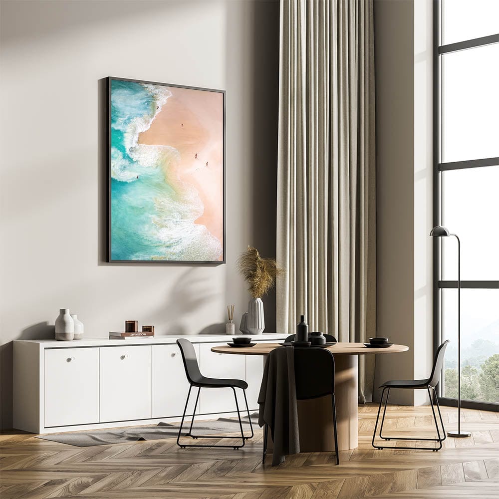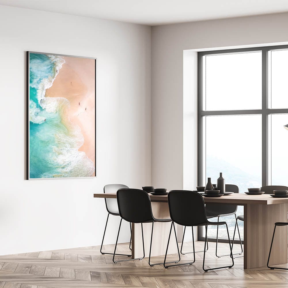 This aerial beach artwork invites you to immerse yourself in the natural beauty of the coast. Whether as a centerpiece for a beach-themed room or as a versatile decorative piece, it brings an elegant and refreshing atmosphere to your home.