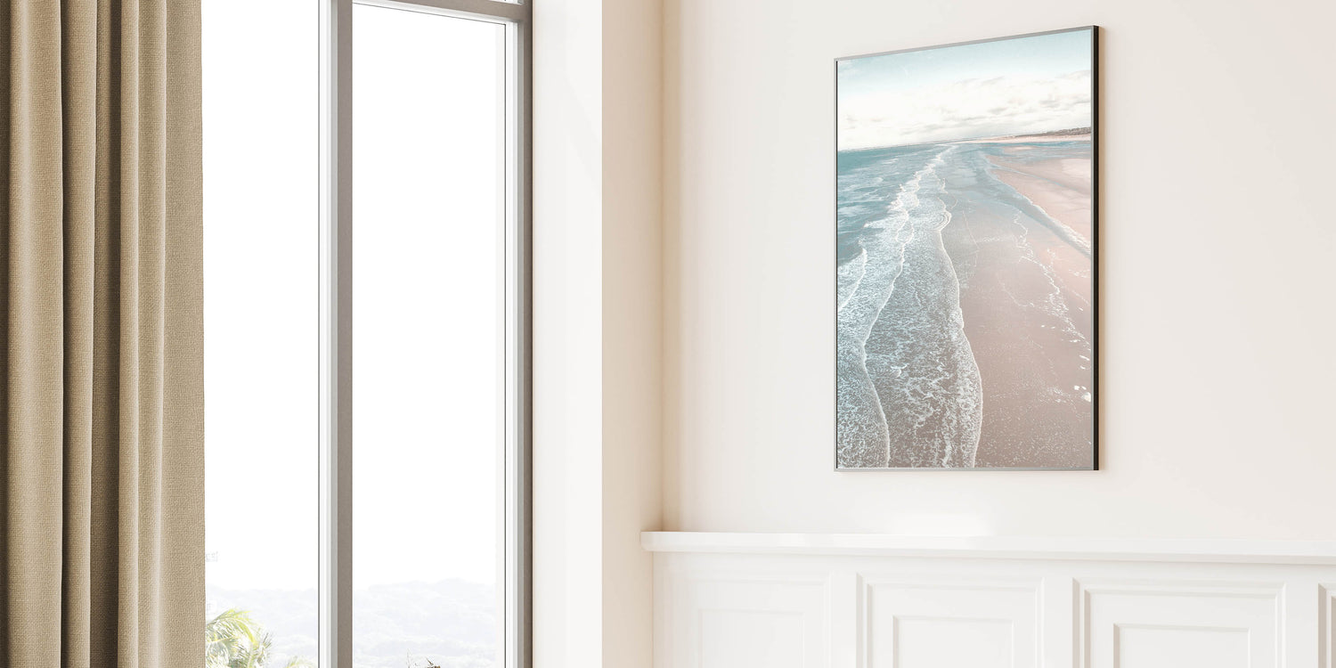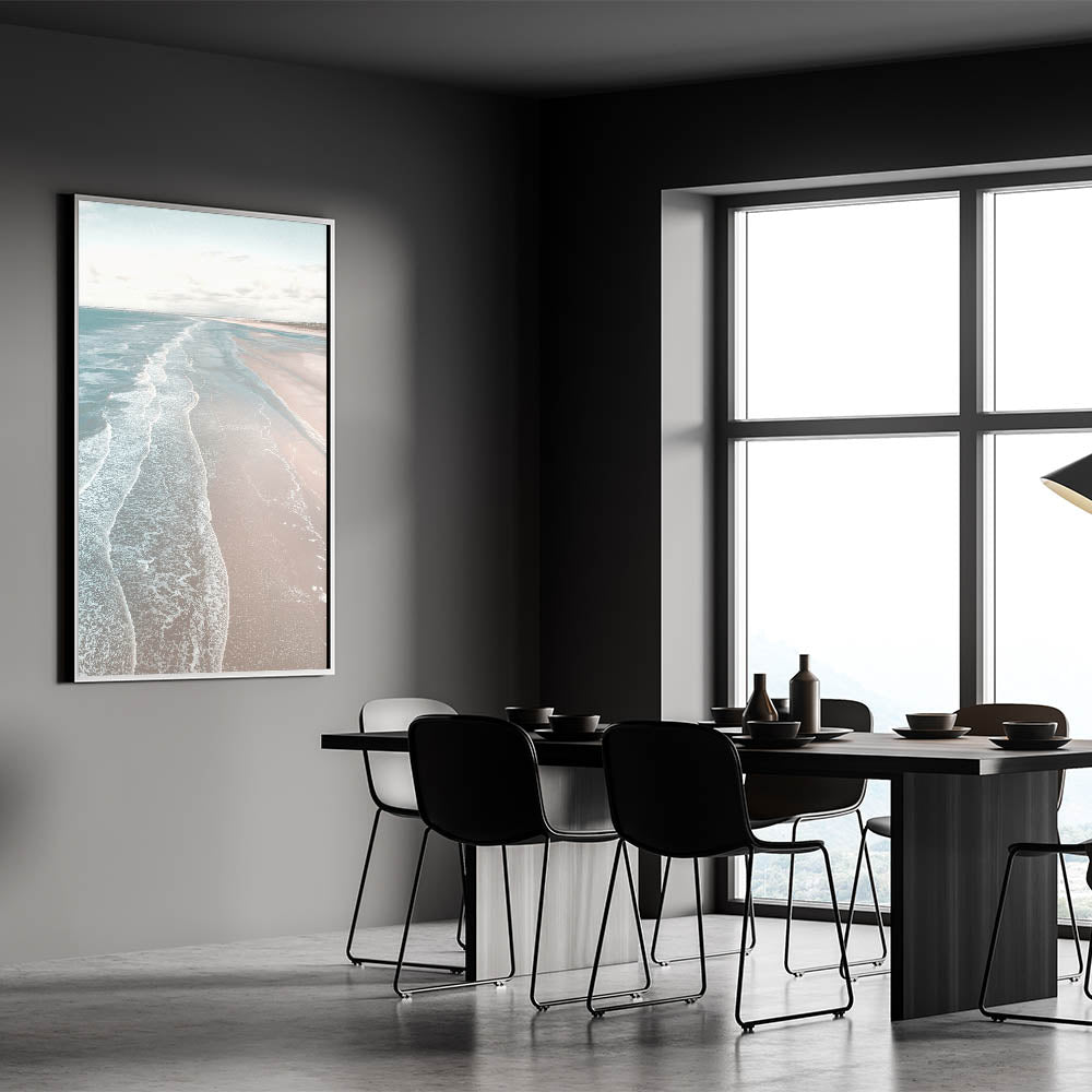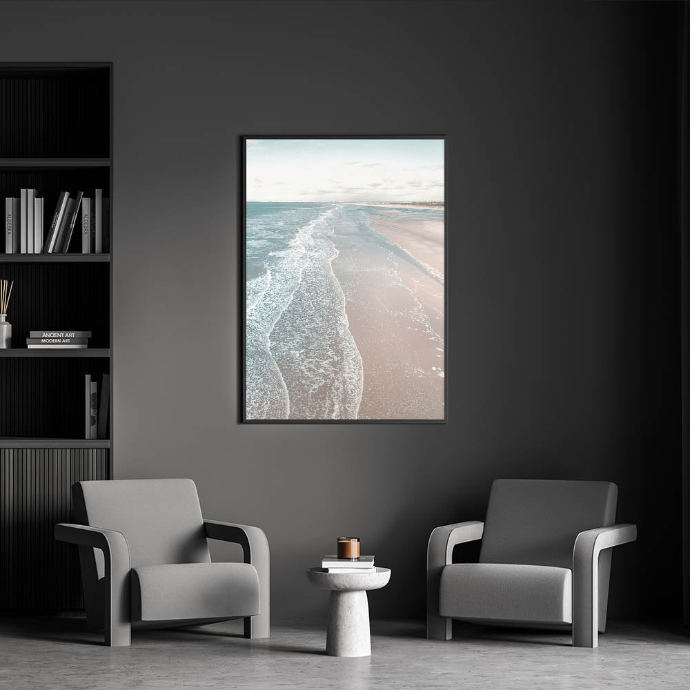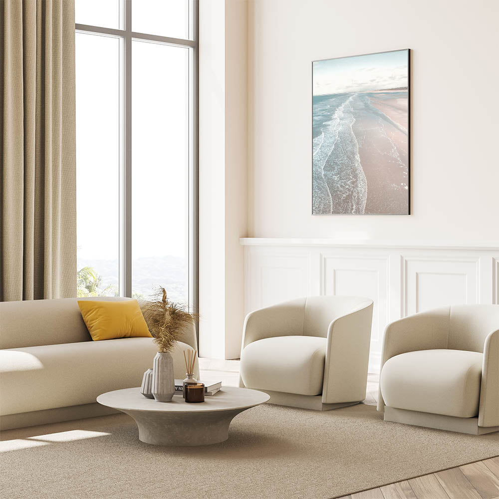 Experience the tranquil beauty of the shore with this aerial beach wall art, featuring soft ocean waves rolling onto the sandy coastline. The delicate blend of sky blue and beige tones creates a soothing, dreamlike atmosphere, making it a perfect choice for those looking to bring coastal elegance into their living space. Whether displayed in a living room, bedroom, or office, this summer wall art evokes the peaceful rhythm of the sea.