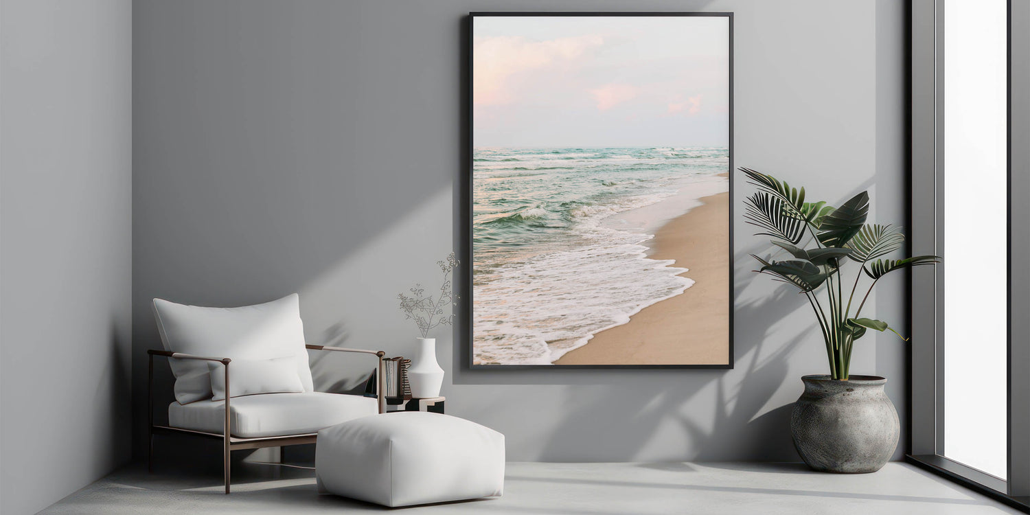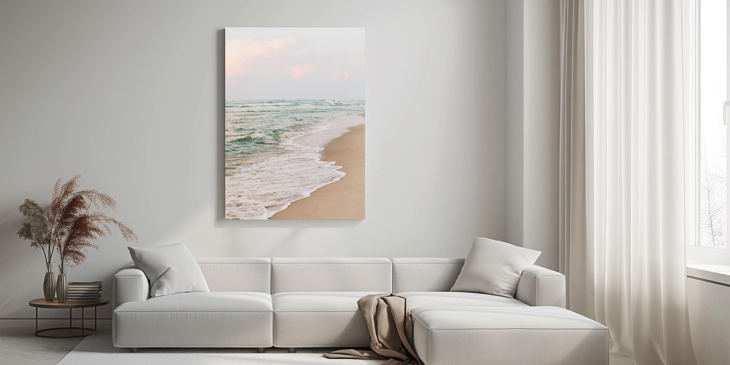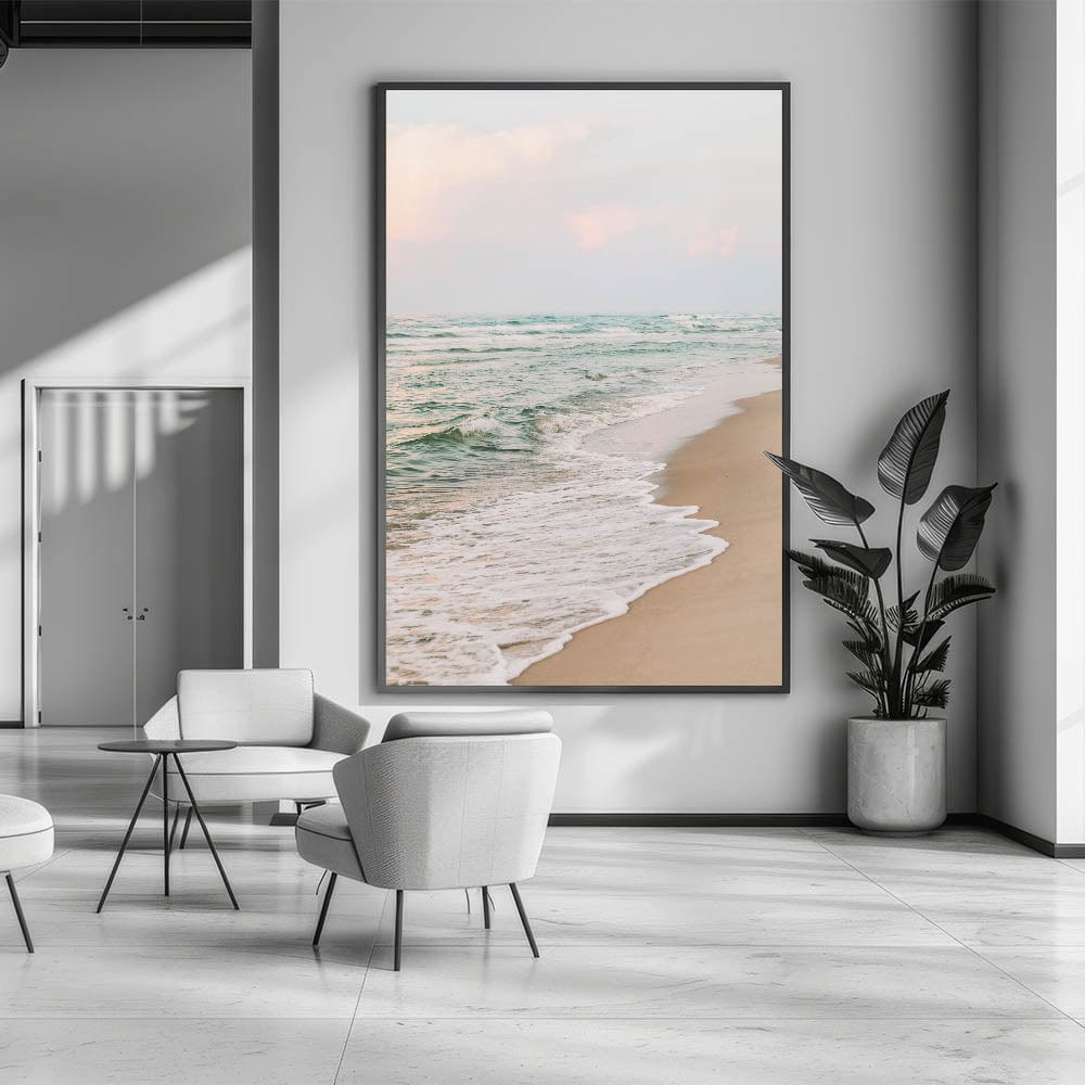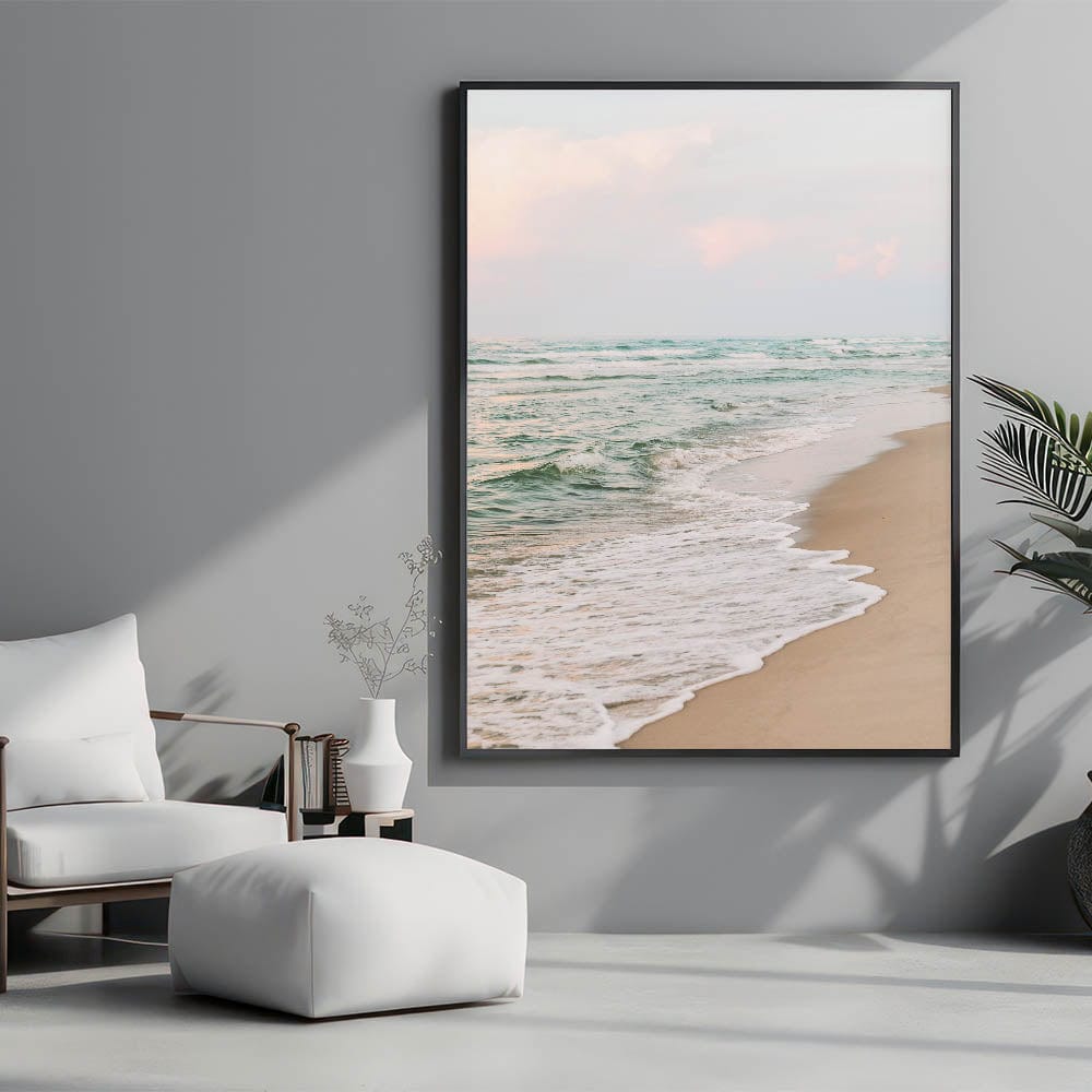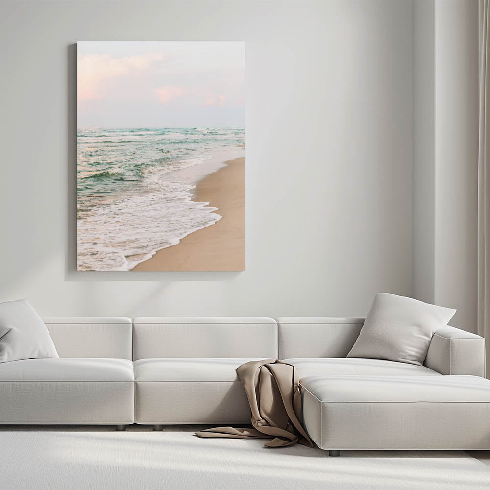 Capture the tranquility of the ocean with this stunning beach decor print featuring gentle waves rolling onto a soft, golden shoreline. With a pastel sky reflecting on the water, this artwork embodies relaxing summer landscapes and bright summer colors. Perfect for creating a calming, vacation-inspired atmosphere, this piece adds a timeless coastal charm to any room.