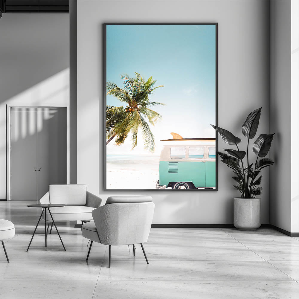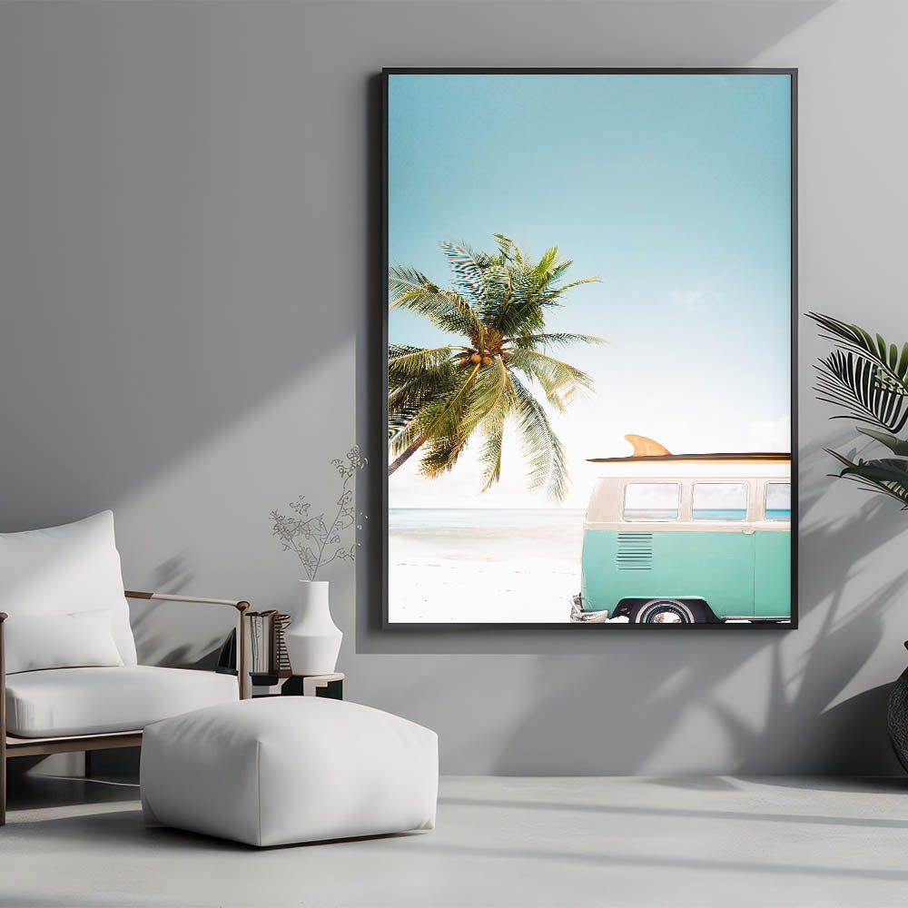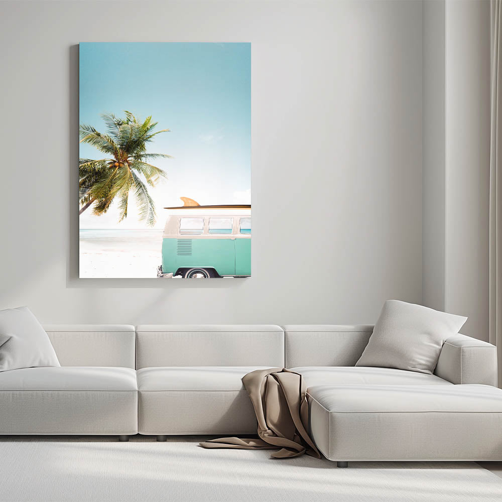 Embrace the carefree spirit of summer with this stunning beach wall art, featuring a classic vintage surf van parked by the shore, framed by a lush palm tree and an endless blue sky. This summer canvas art evokes the ultimate sense of adventure and relaxation, perfect for bringing coastal vibes into any space. Whether you're looking for tropical wall art or a unique piece of summer wall decor, this artwork is the perfect addition to your home.