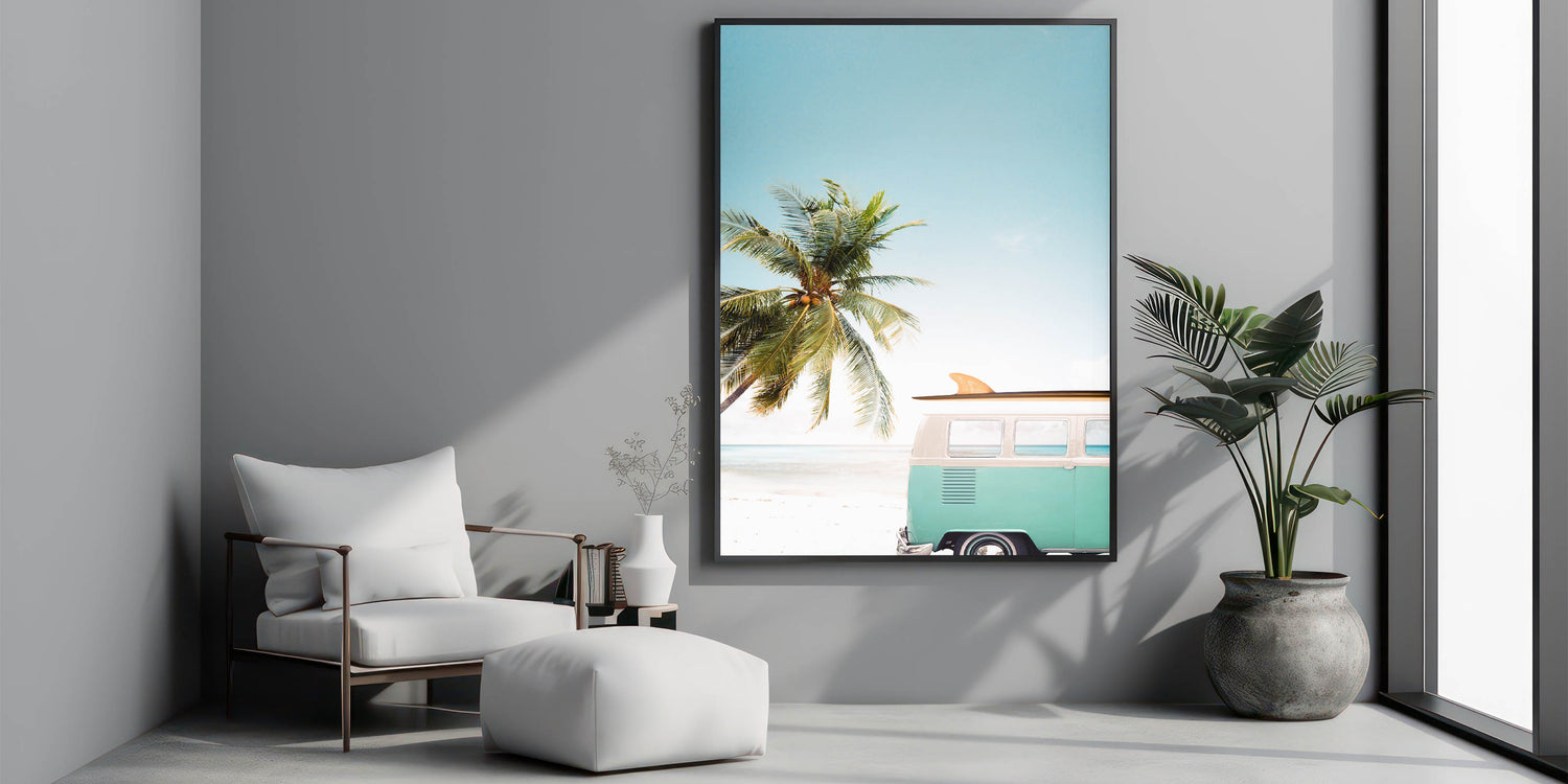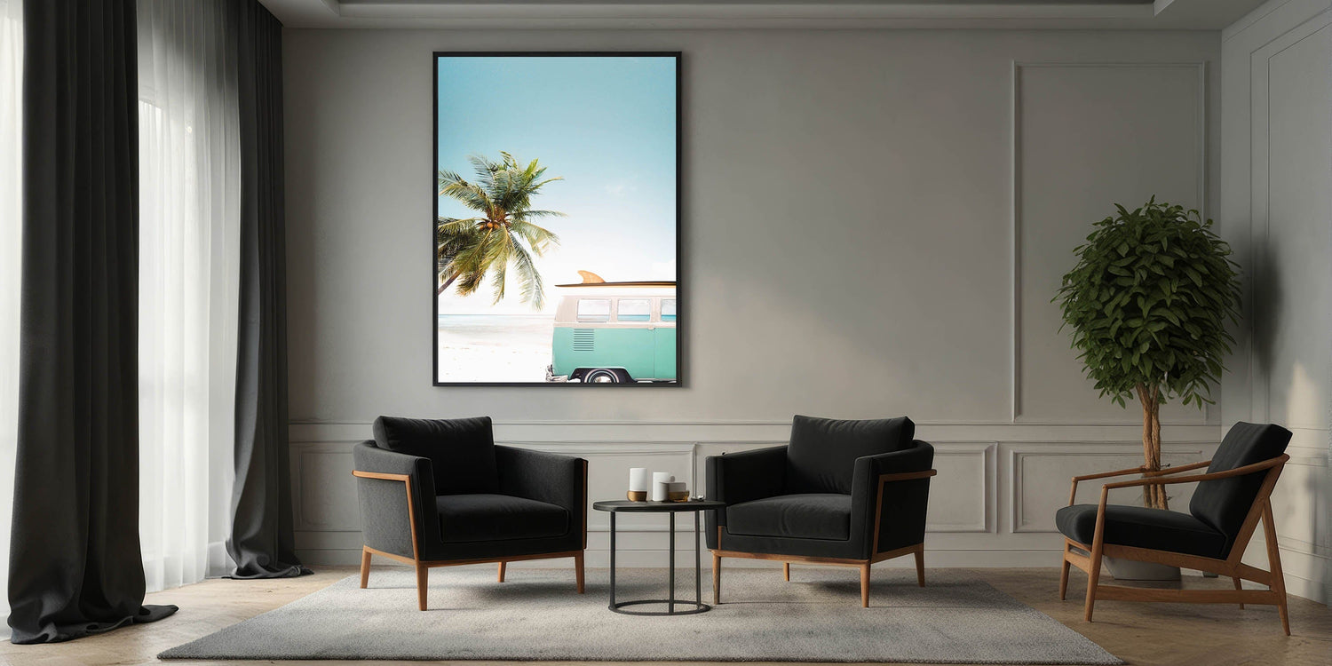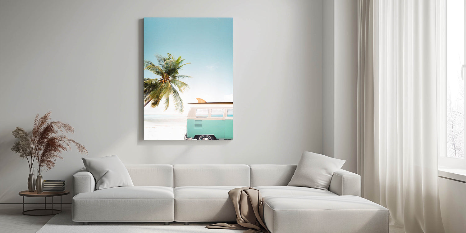 Embrace the carefree spirit of summer with this stunning beach wall art, featuring a classic vintage surf van parked by the shore, framed by a lush palm tree and an endless blue sky. This summer canvas art evokes the ultimate sense of adventure and relaxation, perfect for bringing coastal vibes into any space. Whether you're looking for tropical wall art or a unique piece of summer wall decor, this artwork is the perfect addition to your home.