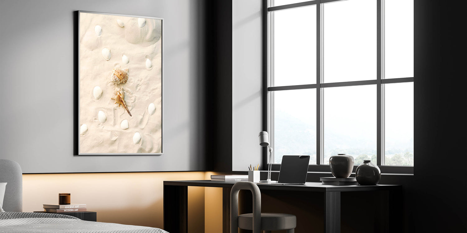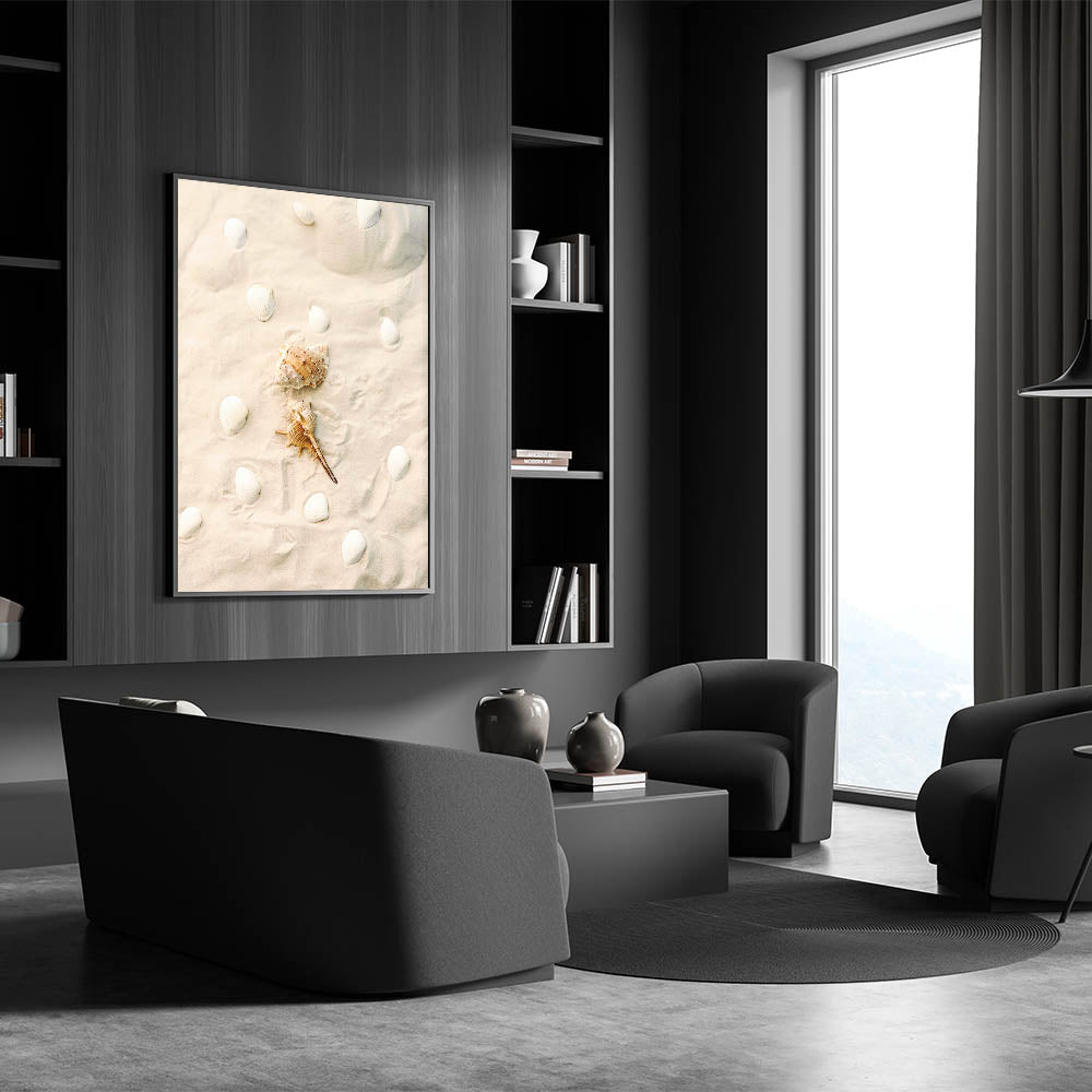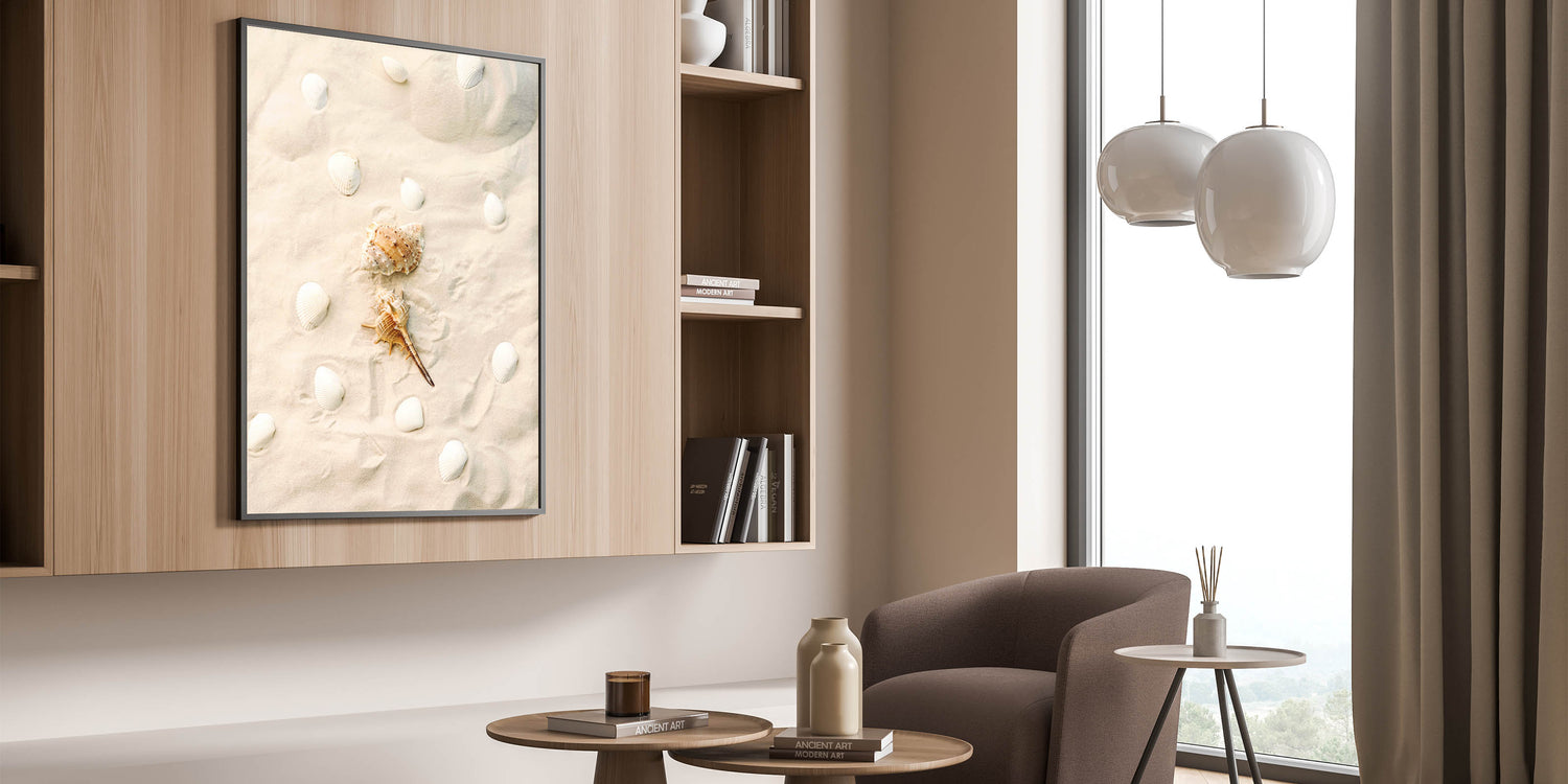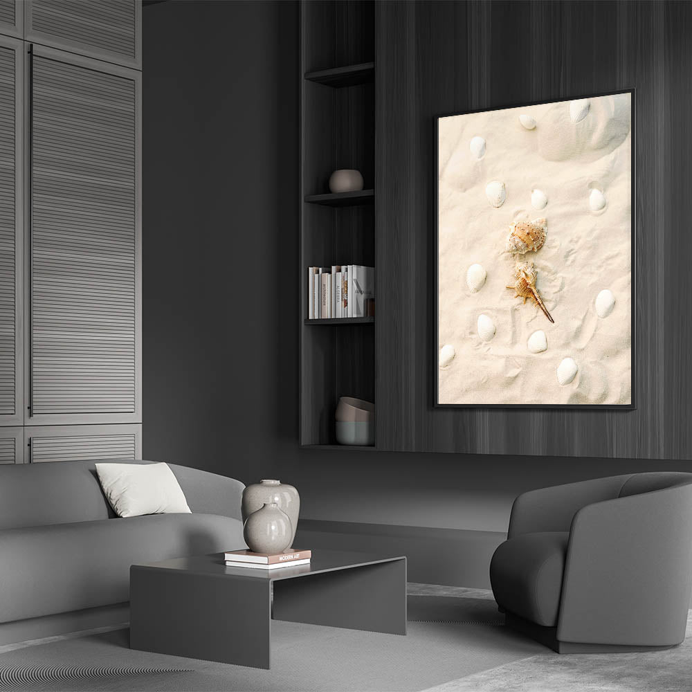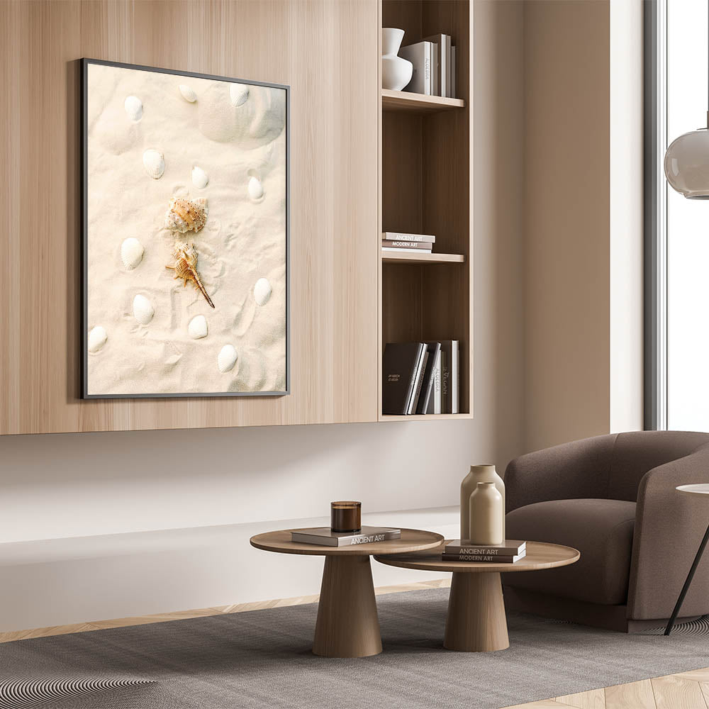 Create a calming coastal retreat in your home with this elegant summer wall art featuring seashells on soft sand. The natural textures and neutral tones of beige and white capture the essence of a peaceful summer day by the ocean. Whether displayed in a bedroom, bathroom, or beach house, this summer canvas art brings a touch of nature and tranquility to any space.