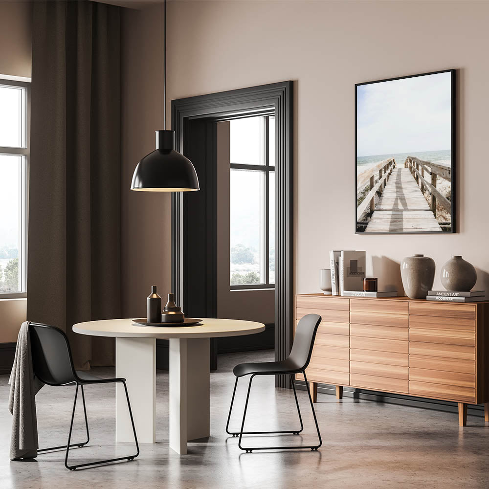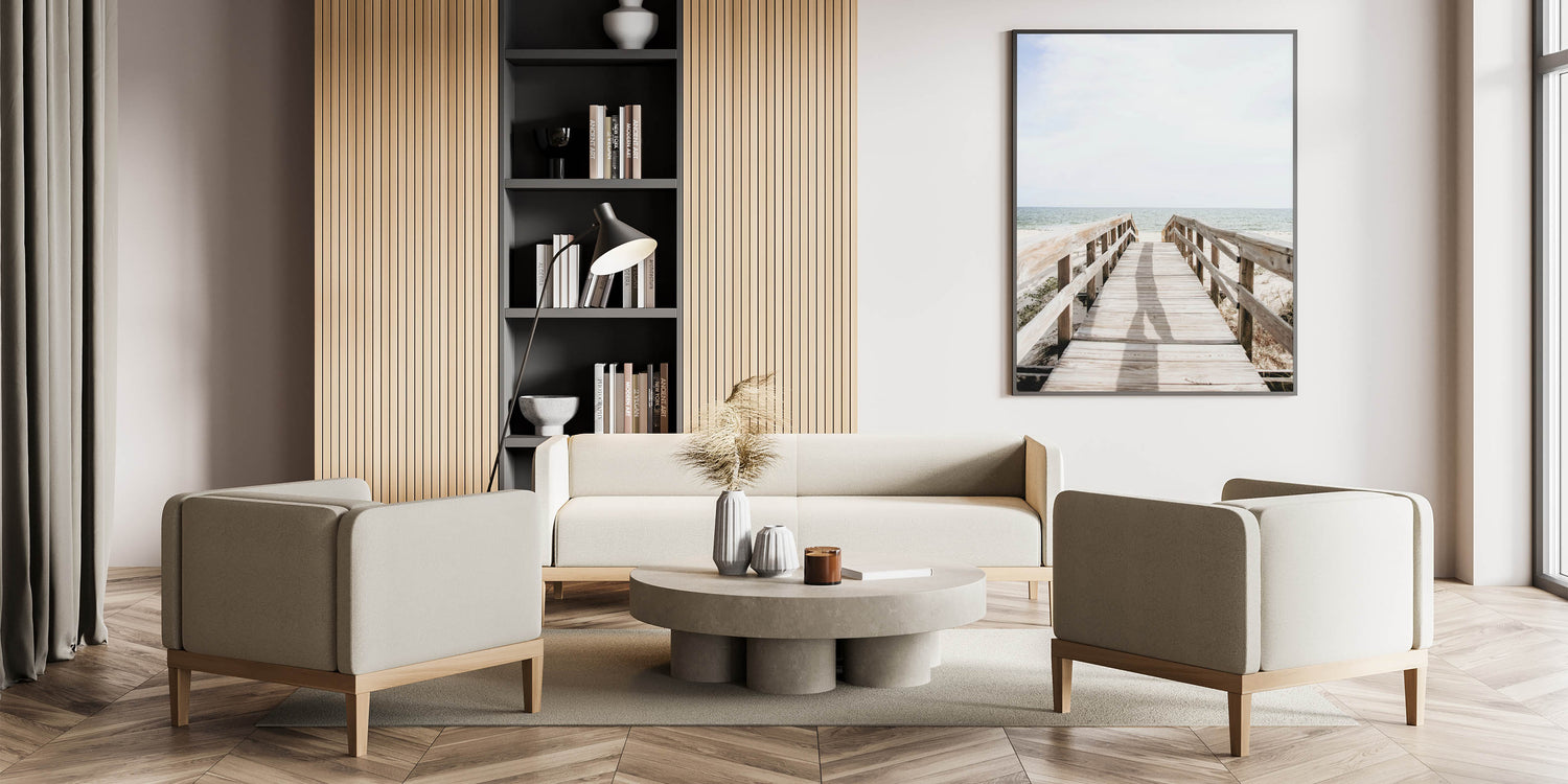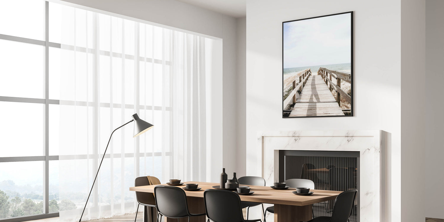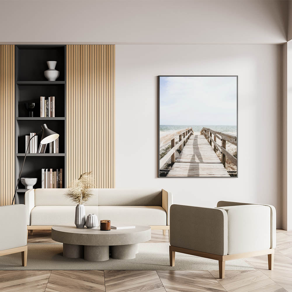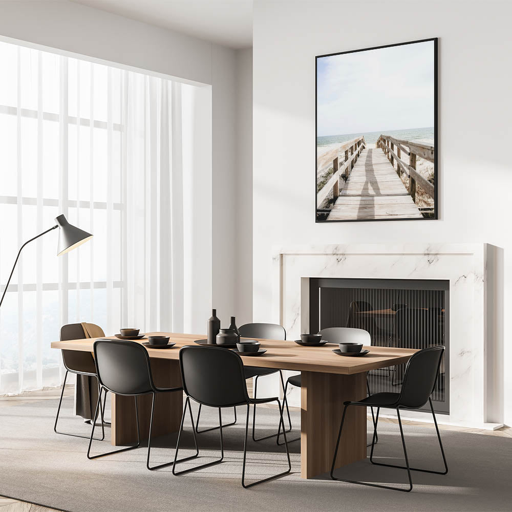 Step into the serenity of the shore with this summer wall art, featuring a rustic wooden boardwalk leading to the open ocean. The soft natural tones of sand, weathered wood, and gentle waves create a calm and inviting atmosphere, perfect for coastal-inspired interiors. Whether displayed in a living room, bedroom, or office, this beach wall decor offers a sense of relaxation and escape.