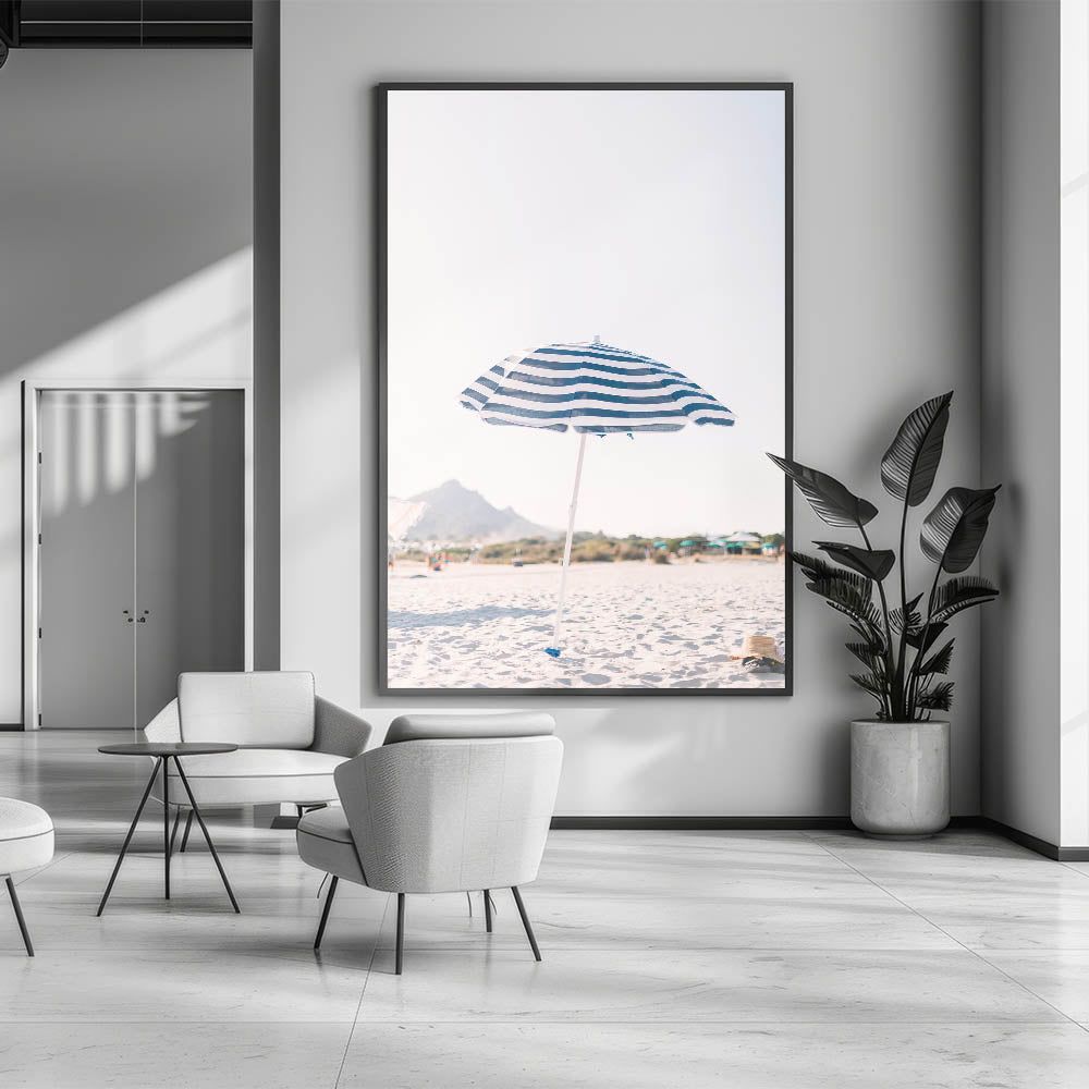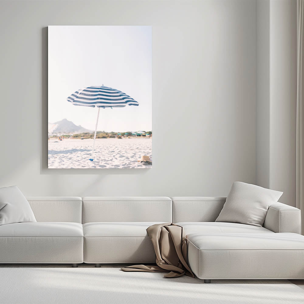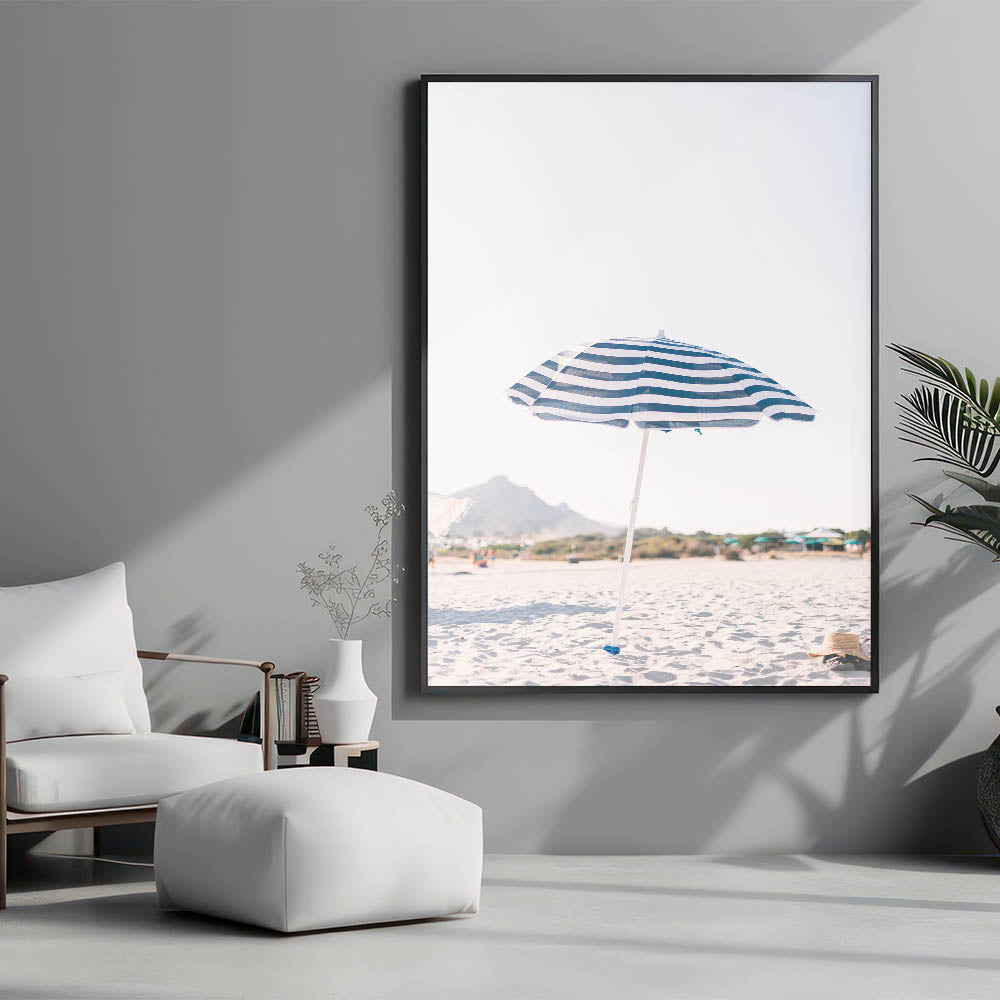 Bring the charm of a sun-kissed beach into your space with this stunning summer wall art featuring a classic striped beach umbrella set against soft sandy shores. The relaxed coastal atmosphere and the gentle backdrop of distant mountains make this summer canvas art a perfect addition to any beach-inspired or modern interior. Whether you love beach wall art or want to bring vacation vibes home, this elegant print enhances your décor effortlessly.