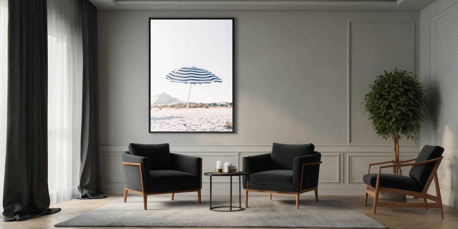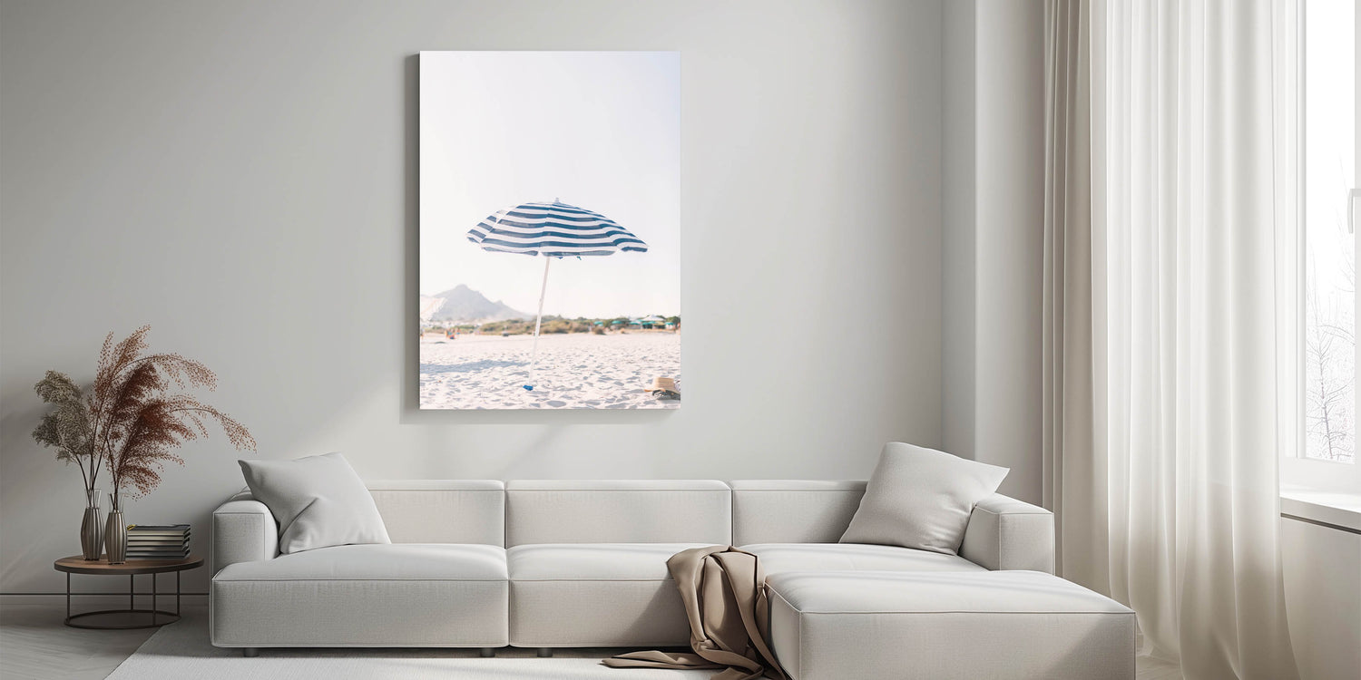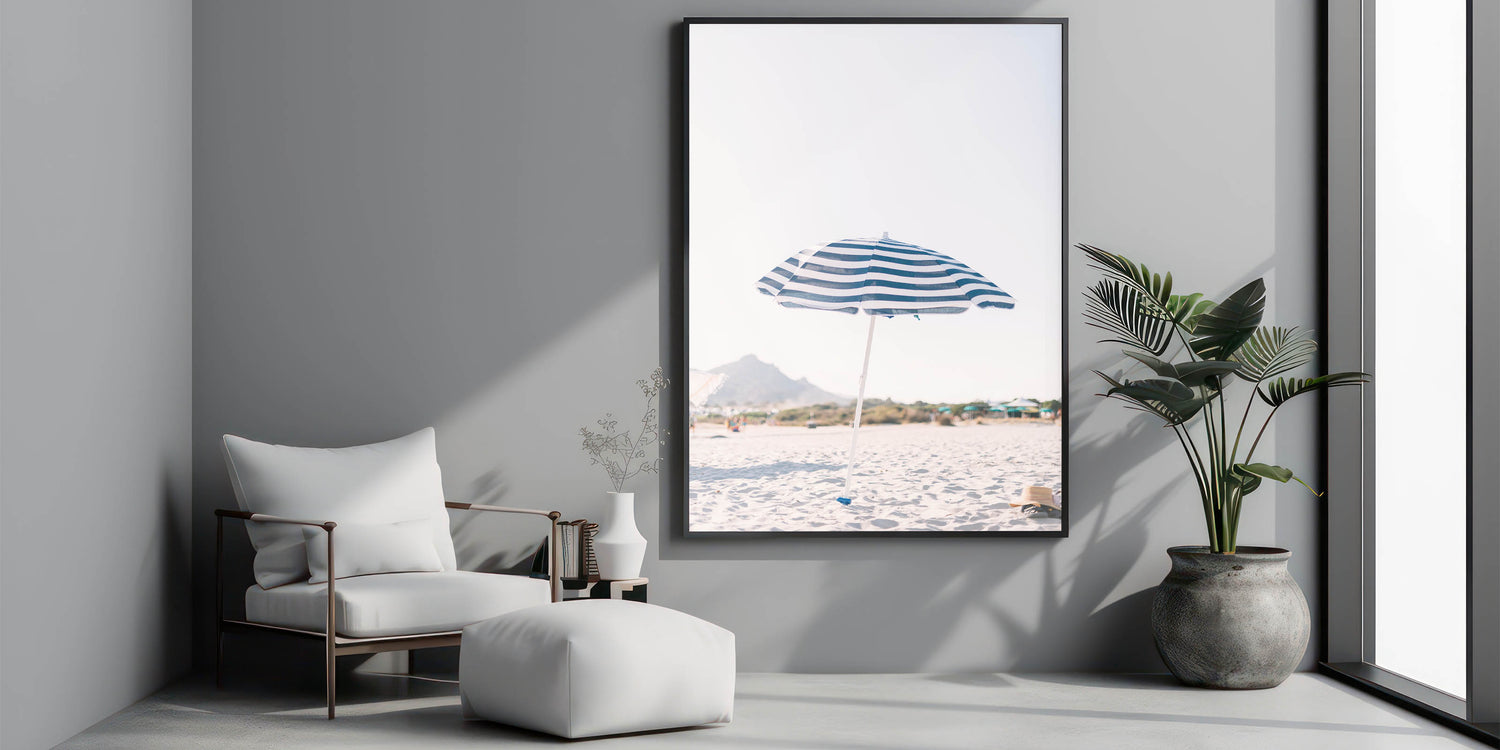 Bring the charm of a sun-kissed beach into your space with this stunning summer wall art featuring a classic striped beach umbrella set against soft sandy shores. The relaxed coastal atmosphere and the gentle backdrop of distant mountains make this summer canvas art a perfect addition to any beach-inspired or modern interior. Whether you love beach wall art or want to bring vacation vibes home, this elegant print enhances your décor effortlessly.