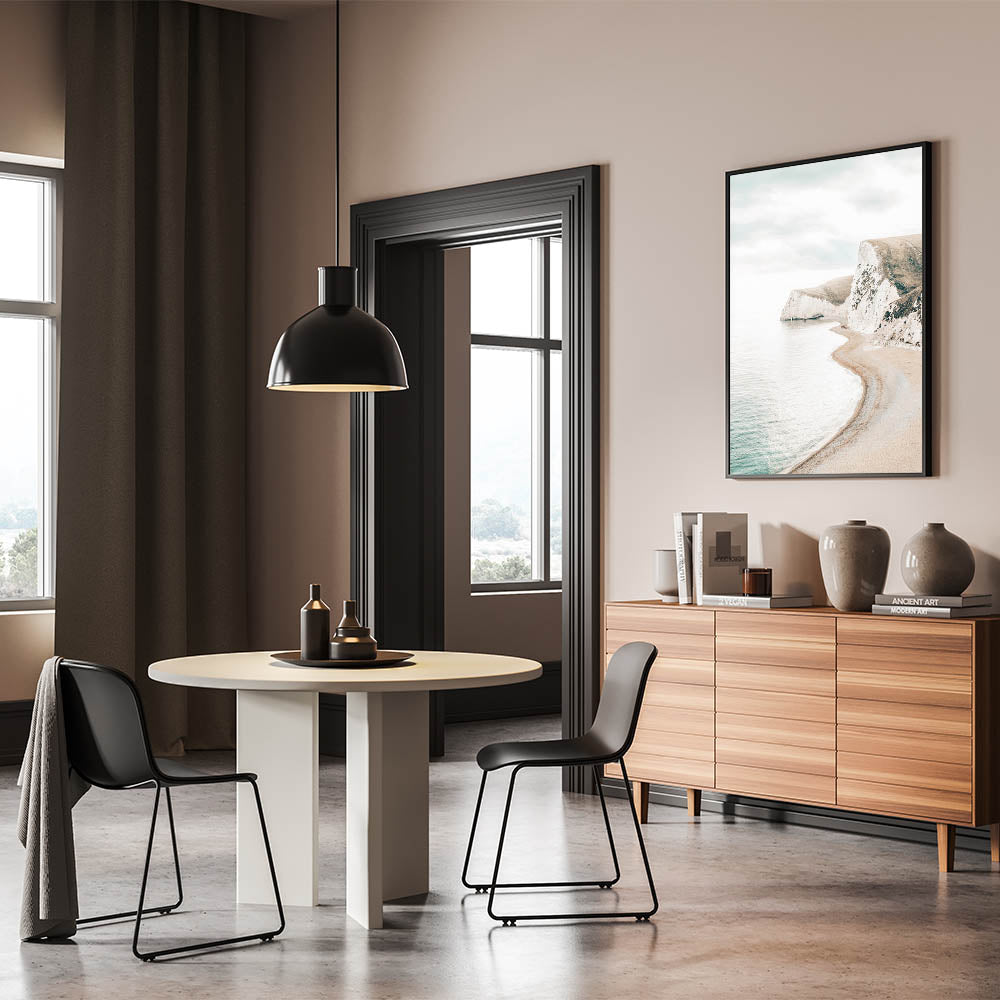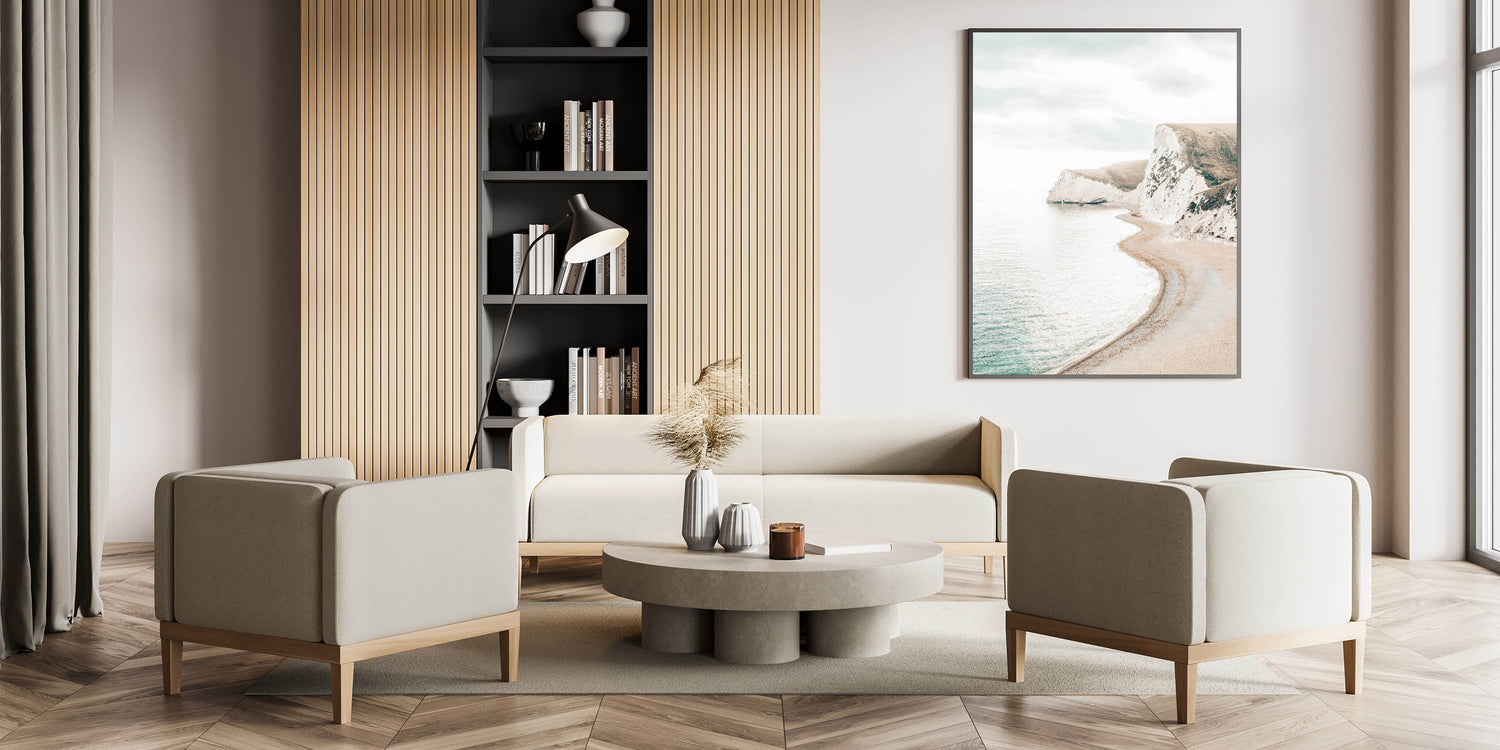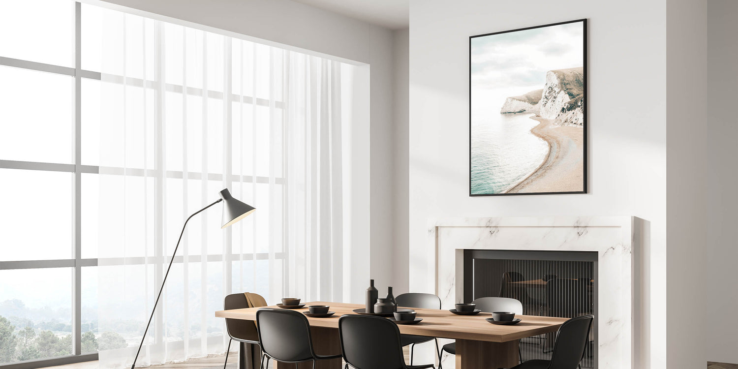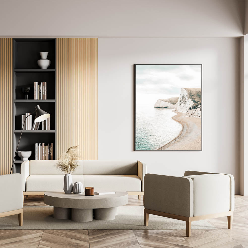 Bring the majestic beauty of coastal cliffs into your home with this Summer Landscape Art. This stunning print captures a serene beach curving along rugged cliffs under soft skies, embodying the essence of relaxing summer landscapes and nature-inspired summer art.