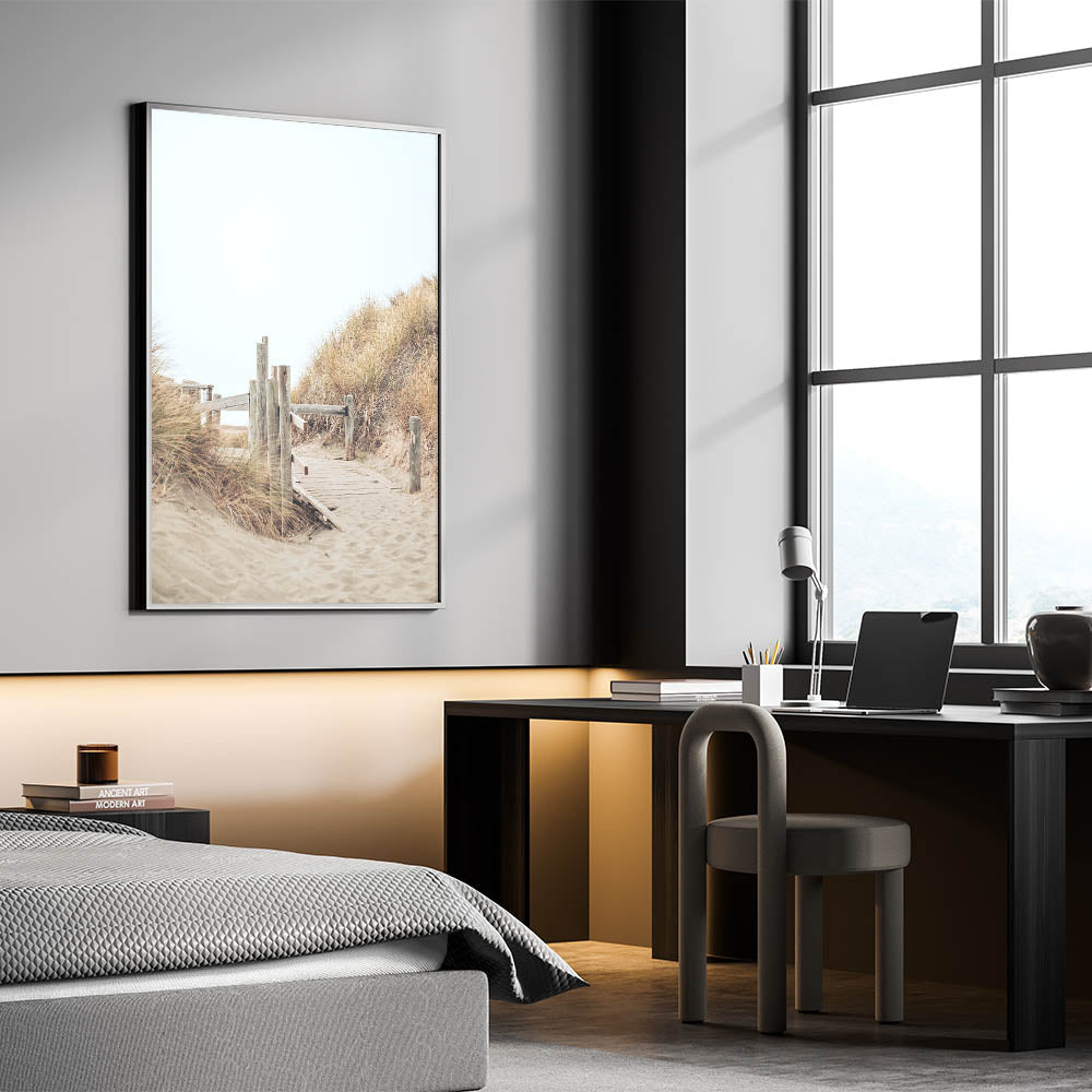 Bring the serenity of coastal summer landscapes into your home with this Sand Dune Wooden Path Canvas. Featuring a tranquil wooden walkway surrounded by soft sand dunes and golden beach grasses, this artwork perfectly captures the peaceful charm of a quiet coastal retreat.
