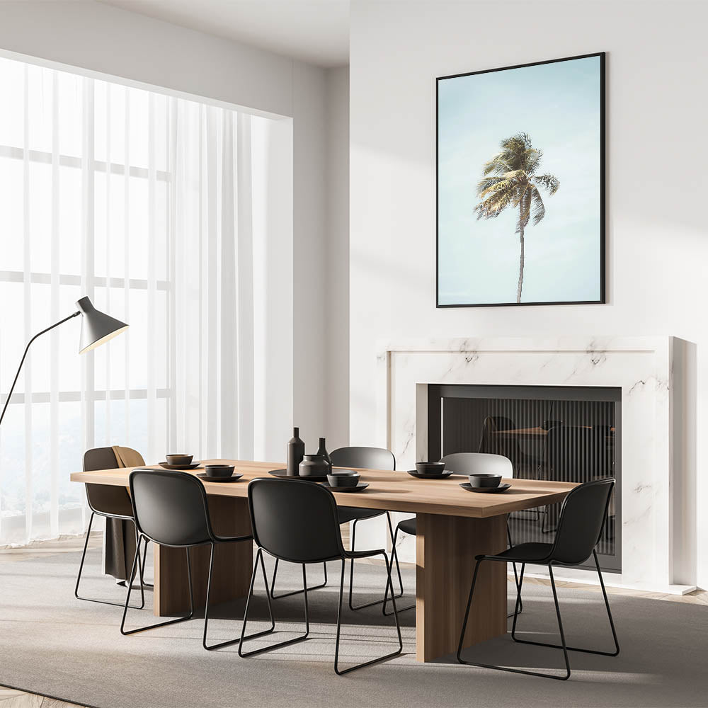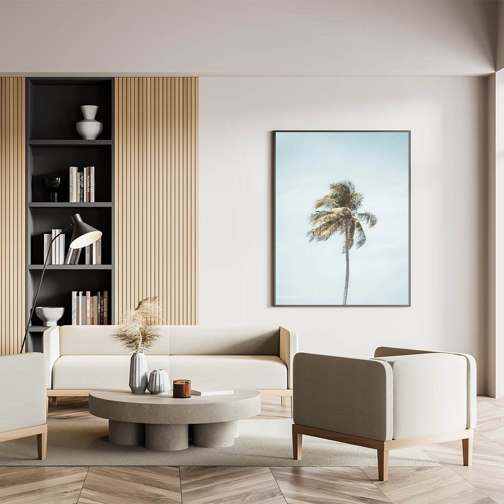 Bring the peaceful beauty of summer into your home with this Nature Inspired Palm Tree Wall Print. Featuring a tall, swaying palm tree against a tranquil, light blue summer sky, this artwork captures the essence of relaxation and tropical charm. Perfect for adding vacation-inspired art to your living space.