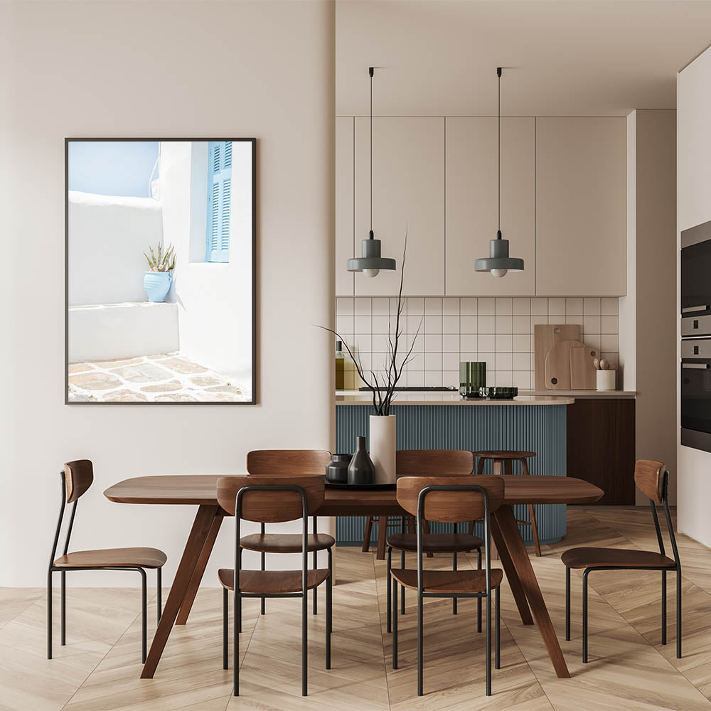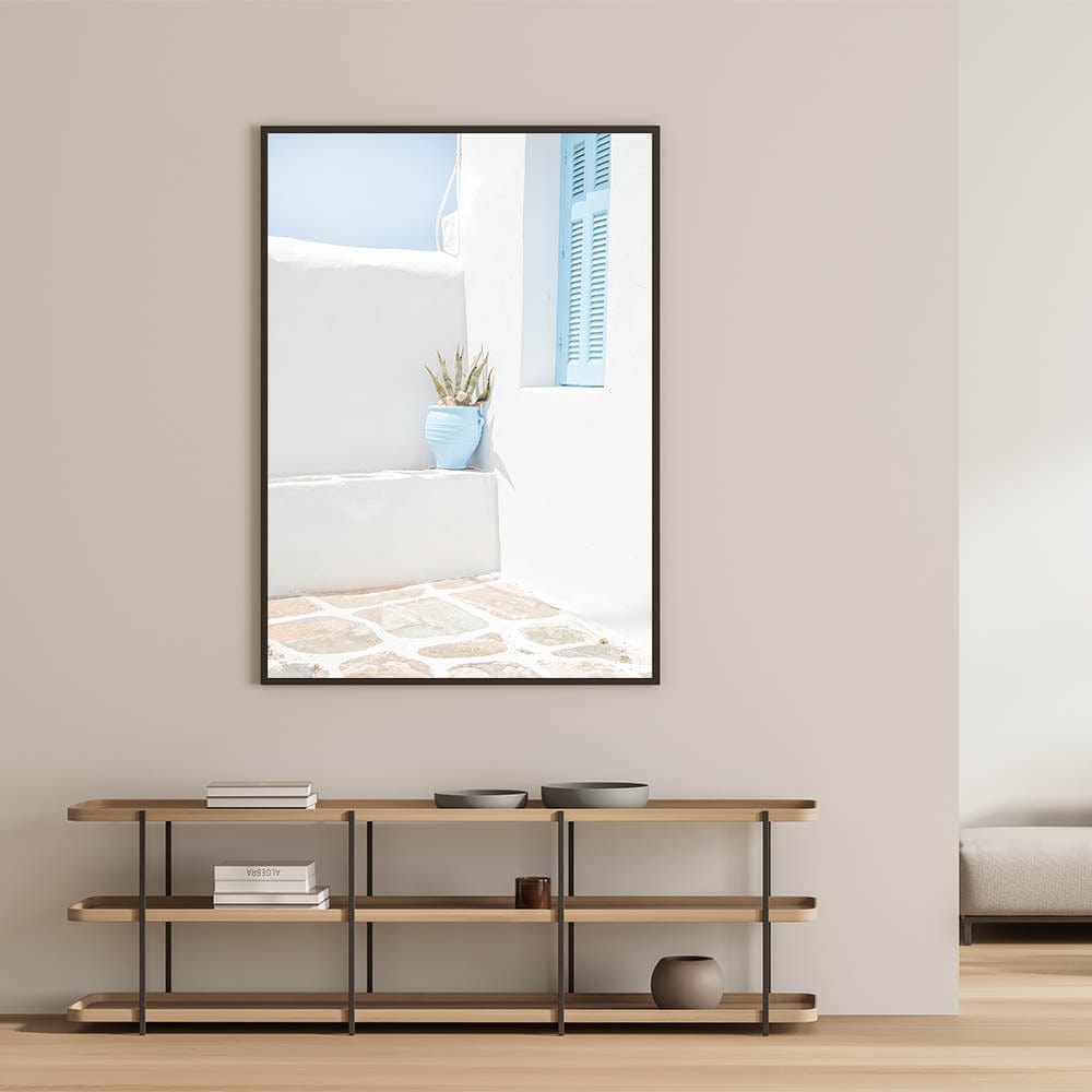Add a touch of serene elegance to your space with this minimalist summer vibes print. Featuring a pastel blue pot with a spiky green plant set against whitewashed walls and natural stone flooring, this artwork embodies simplicity and bright summer colors. Perfect for creating a relaxing summer ambiance, its clean design is a perfect blend of modern minimalism and tropical charm.