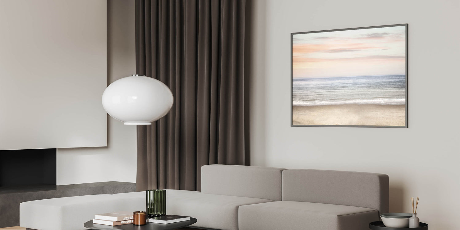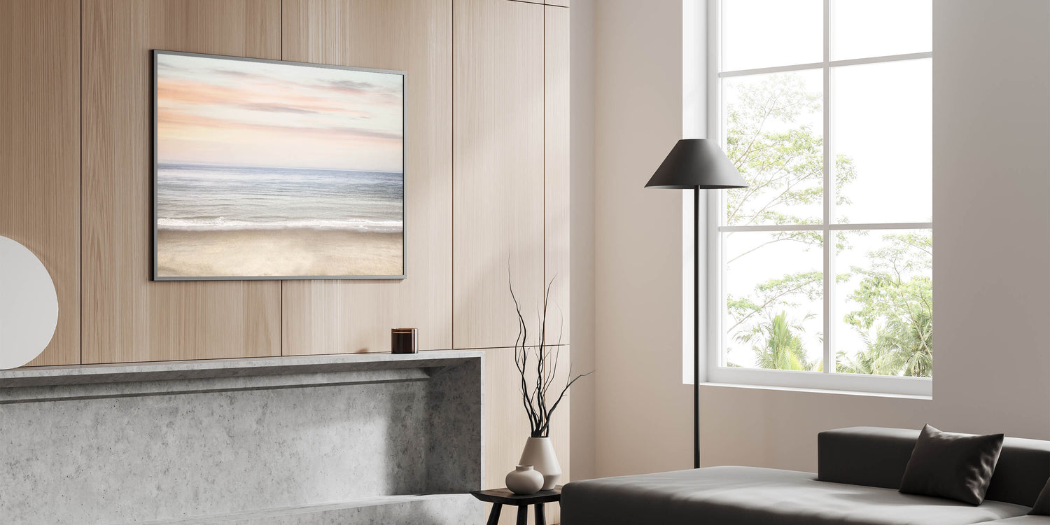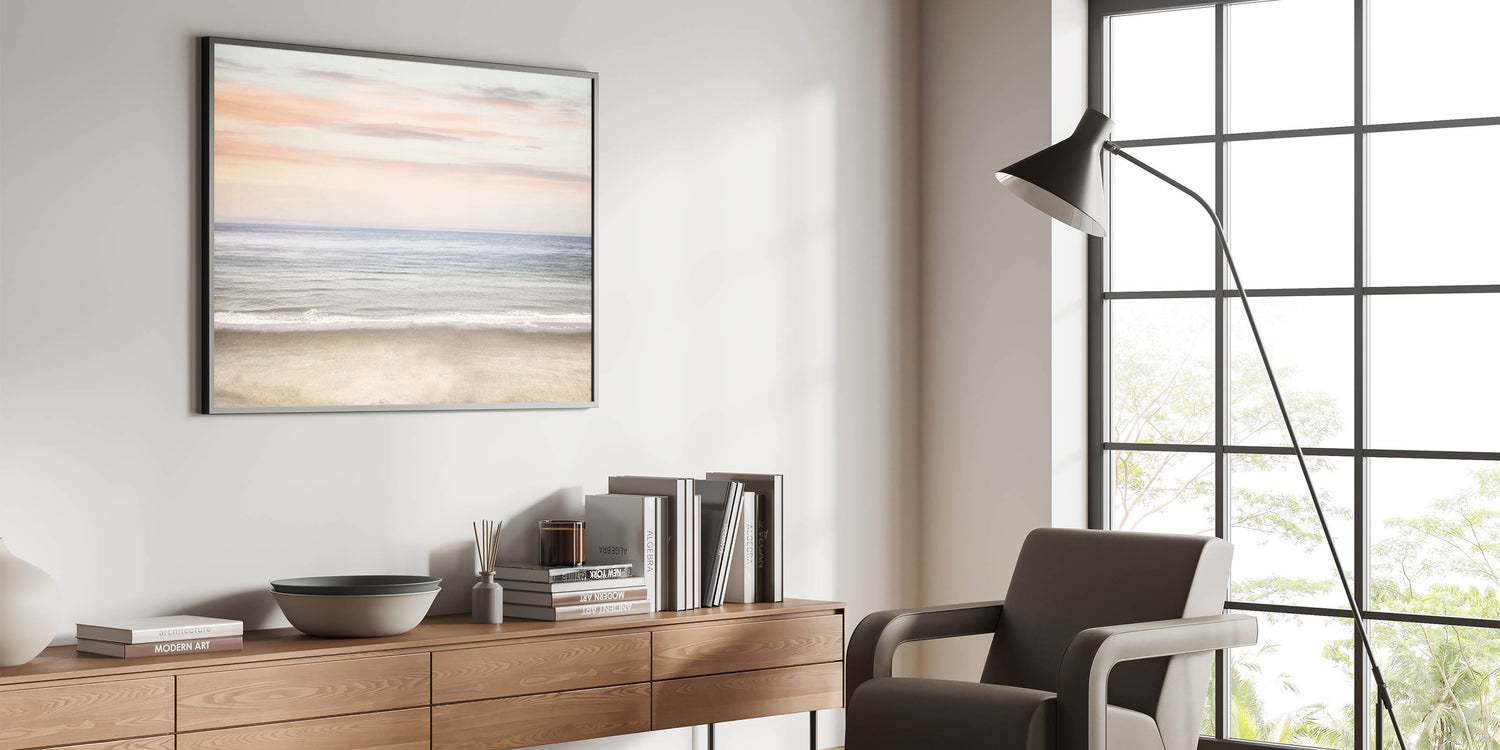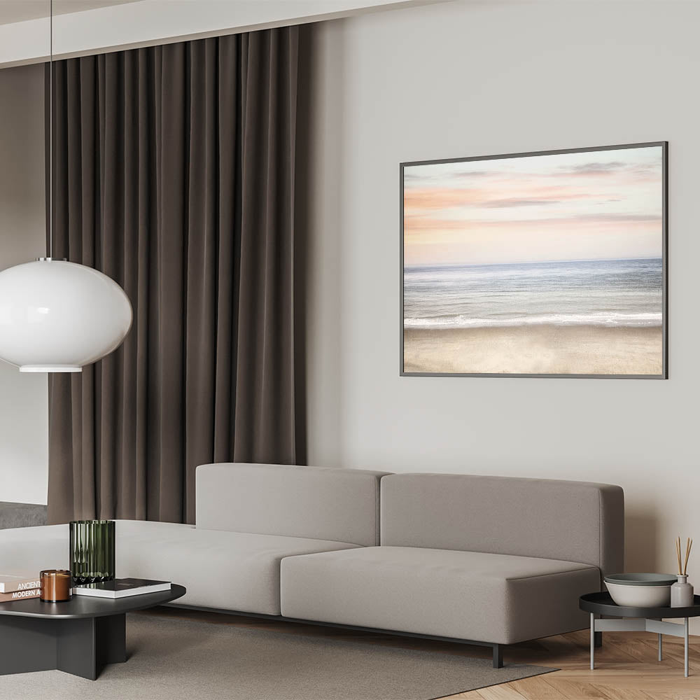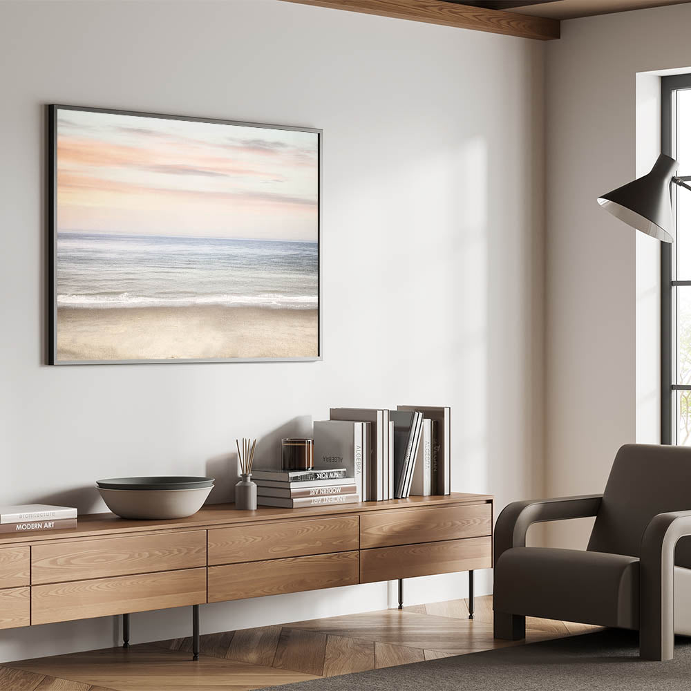 Transform your space with the serene beauty of this sunset canvas art, featuring a calm ocean horizon beneath a pastel-toned sky. This artwork beautifully blends soft shades of beige, light blue, and delicate pink, capturing the essence of bright summer colors and peaceful coastal moments. Ideal for creating a soothing and relaxing summer landscape in any room.