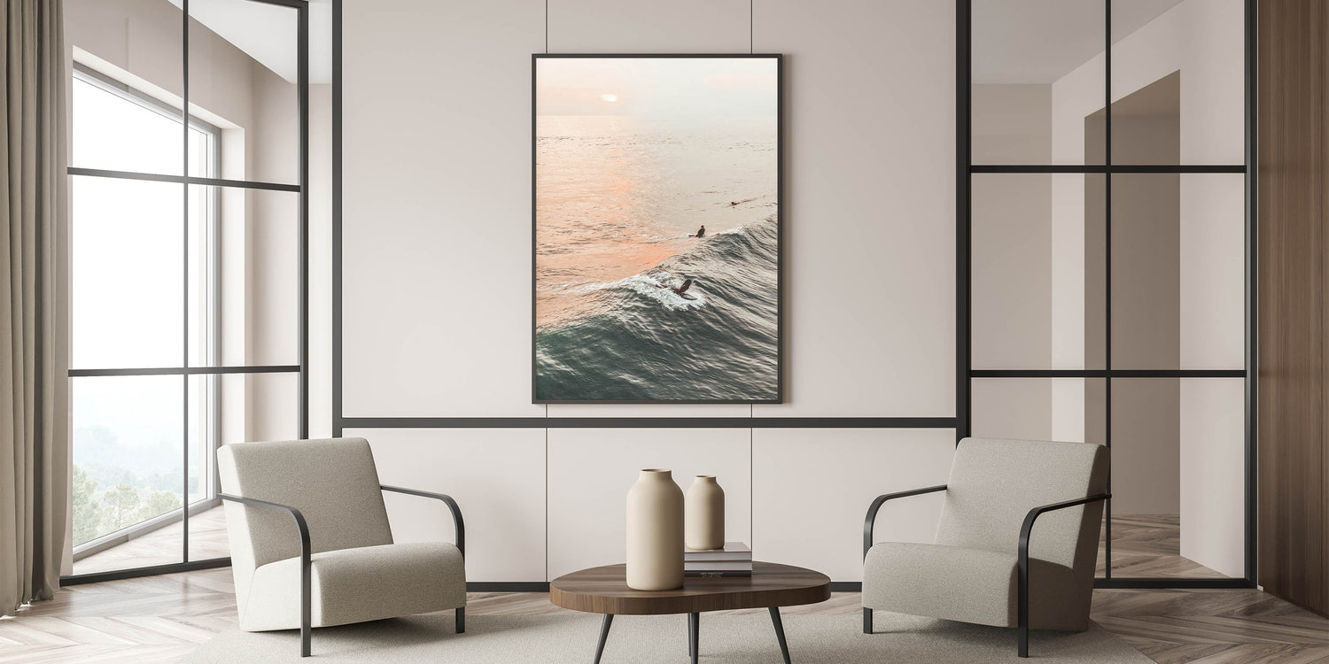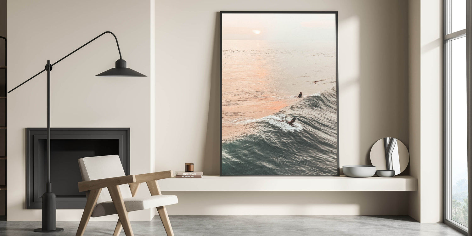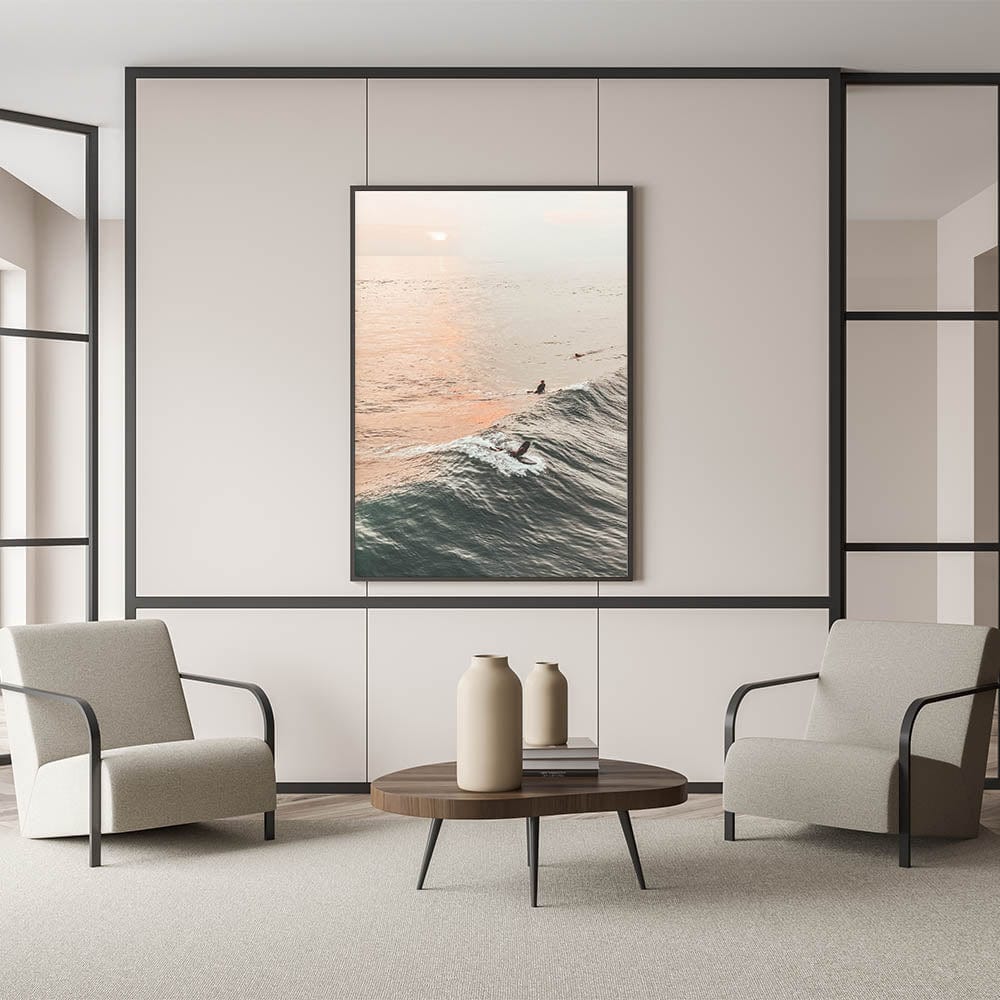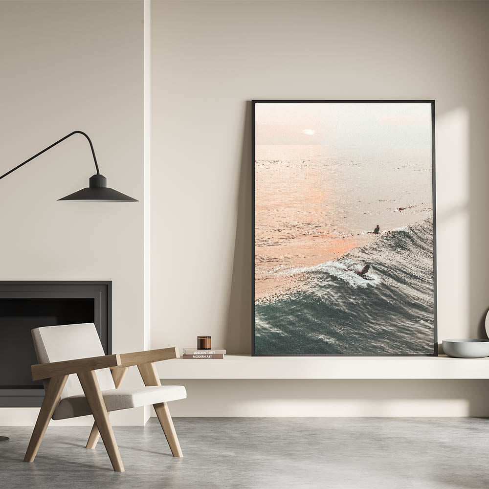 Bring the beauty of the ocean at golden hour into your home with this stunning sunset canvas art. Featuring surfers catching waves under a tranquil sunset, this artwork captures the vibrant essence of beach and ocean scenes. The soft orange hues of the sky reflecting on the water blend perfectly with the deep blues, creating a peaceful and relaxing summer landscape.
