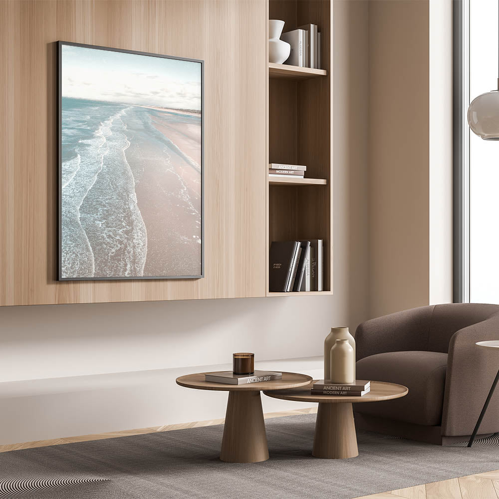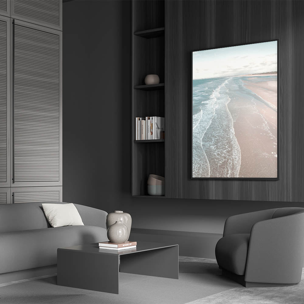 Capture the calming beauty of a serene beach shoreline with this stunning sunset canvas art. Featuring soft ocean waves gently washing over pale sandy shores, this artwork perfectly embodies nature-inspired summer art. The delicate blend of soft blues, beige, and light peach creates a soothing and refreshing atmosphere, ideal for coastal and seasonal home decor.