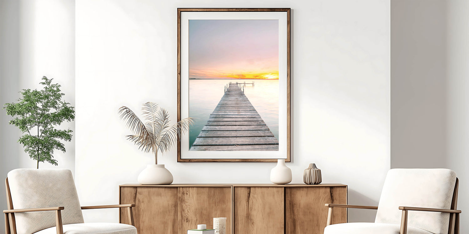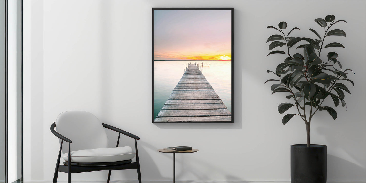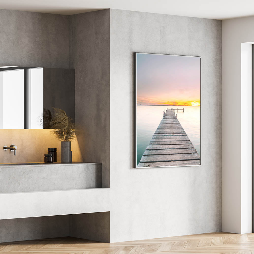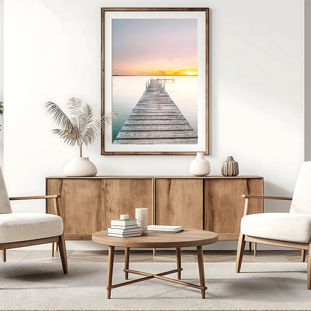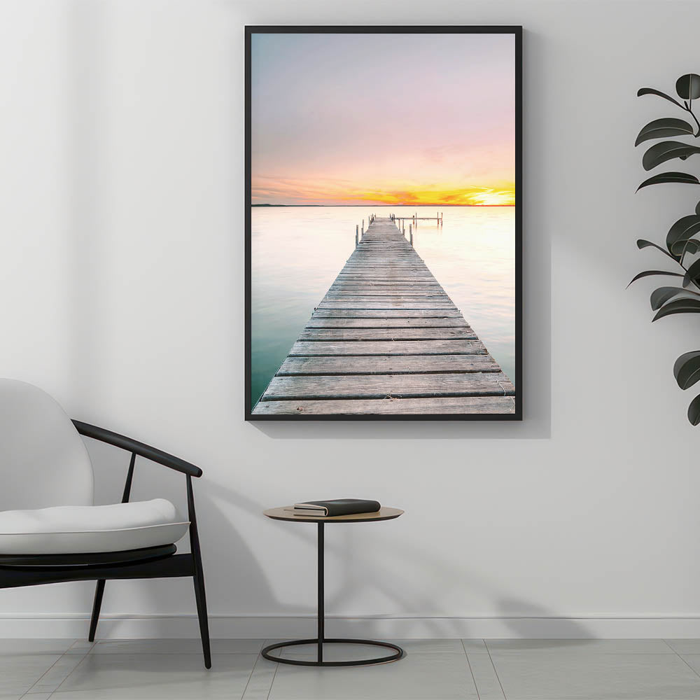 Invite the tranquility of summer evenings into your home with this stunning sunset canvas art. Featuring a rustic wooden pier stretching into calm waters beneath a glowing golden horizon, this piece captures the serene beauty of relaxing summer landscapes. The rich tones of orange, peach, and soft gray create an inviting atmosphere perfect for seasonal home decor.